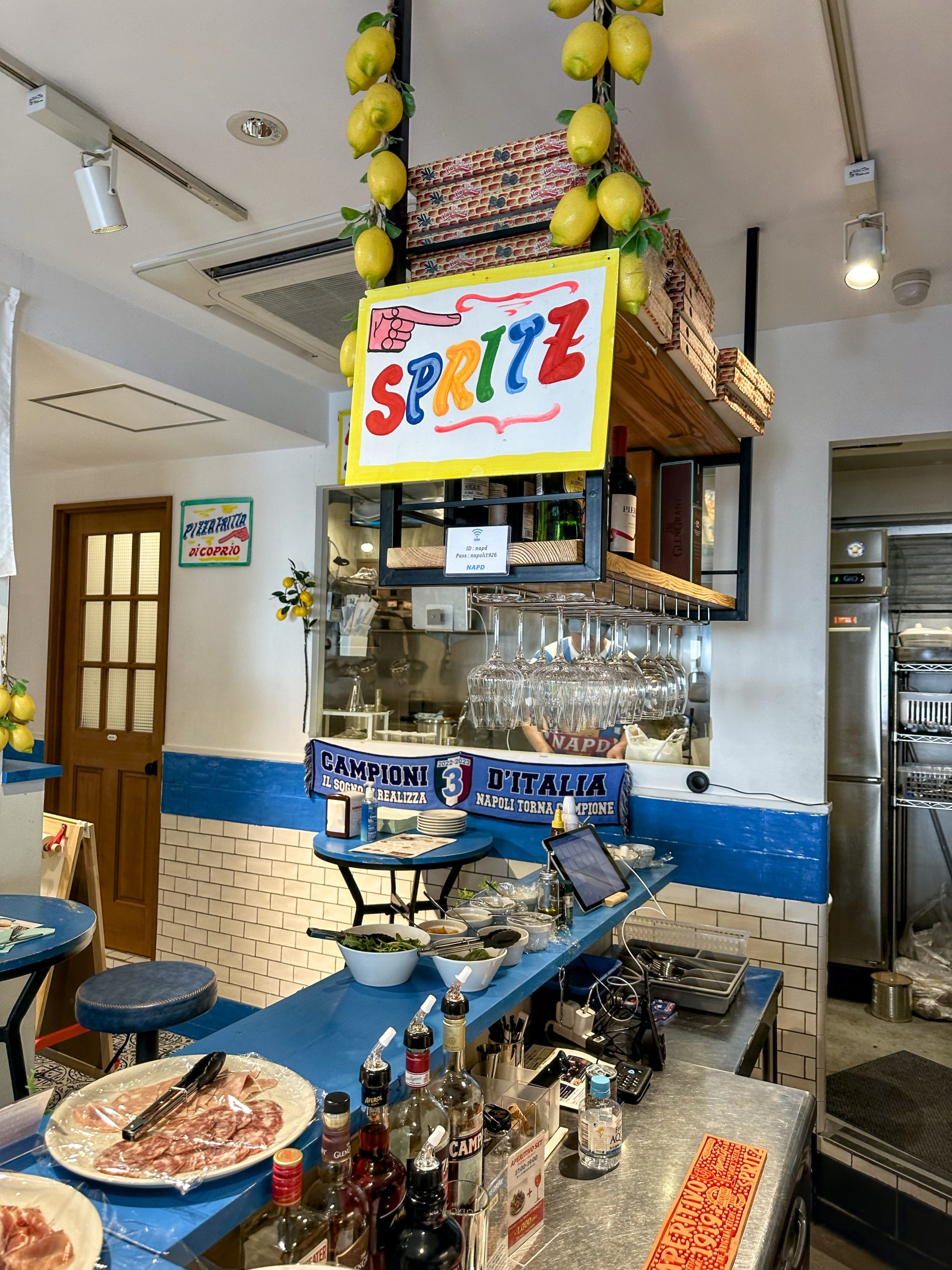 在日イタリア大使館や在日イタリア商工会議所も擁する港区に位置したこの店は、サッカークラブ・ナポリのシンボルカラーであるブルーが、全14席のうち1つを含め、店の隅々まで埋め尽くしている。