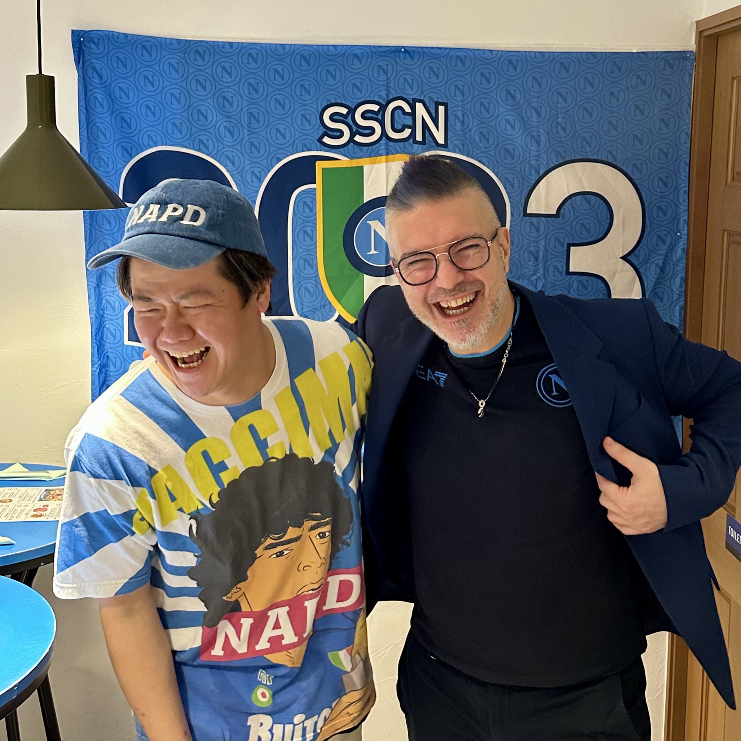 日本人のディコプリオ ― 友人たちがつけた、アナグラムのニックネーム。アナグラムのもとになった言葉は、皆さん各自であてるように — 氏の生き様も、やはりブルーに染まっている。すべては、彼が1980年代にナポリを訪ね、マラドーナに恋したことに始まった。彼やスタッフのイタリア語はなかなかのもの。YouTubeやインスタグラムに、前述のクラブの試合に関連したコンテンツを投稿を始めると、彼は同クラブのファンの間でかなり知られるようになったため、店内はマラドーナだらけ。その御姿は、この店のサポートグッズにも拝むことが出来る。