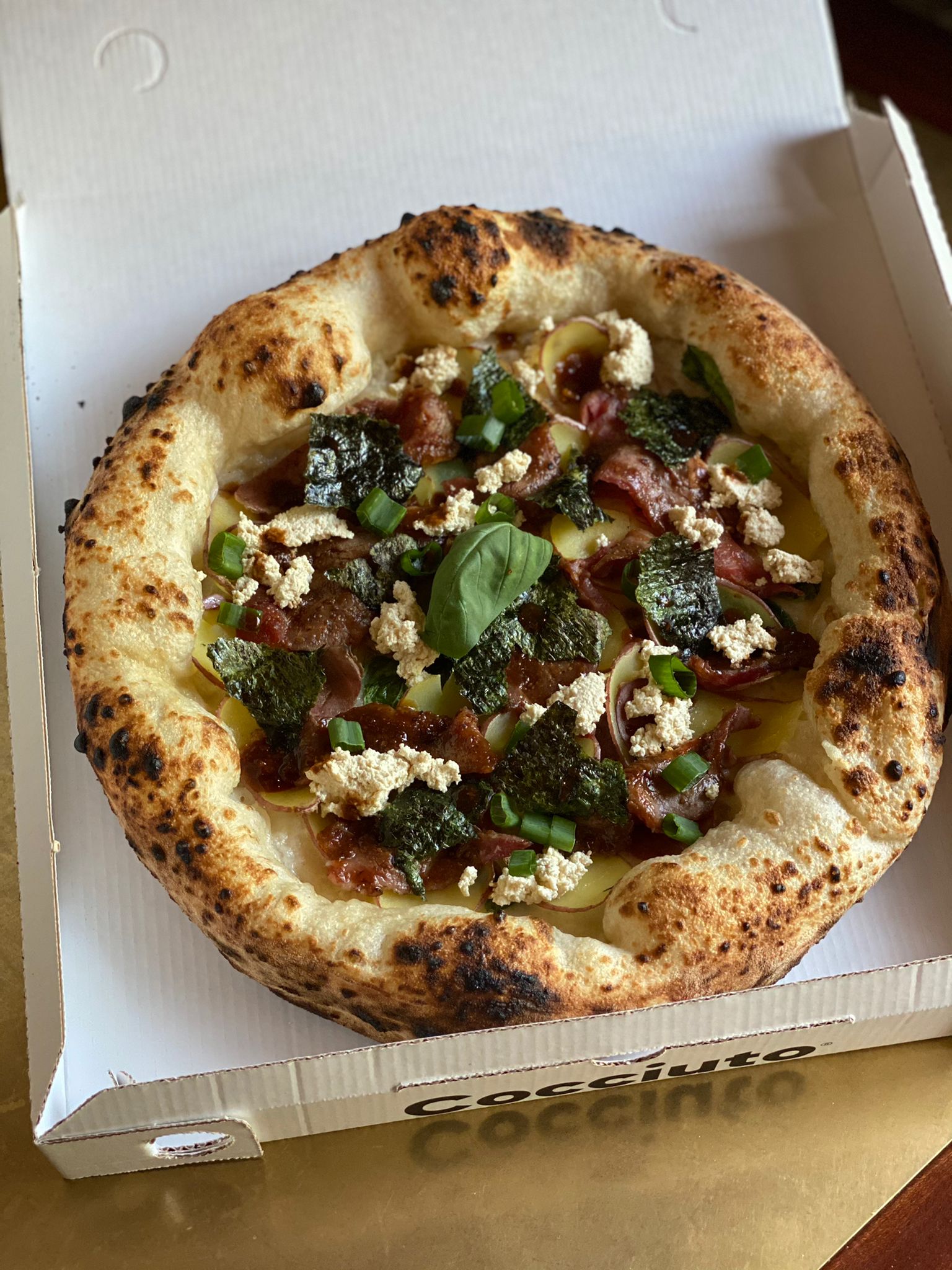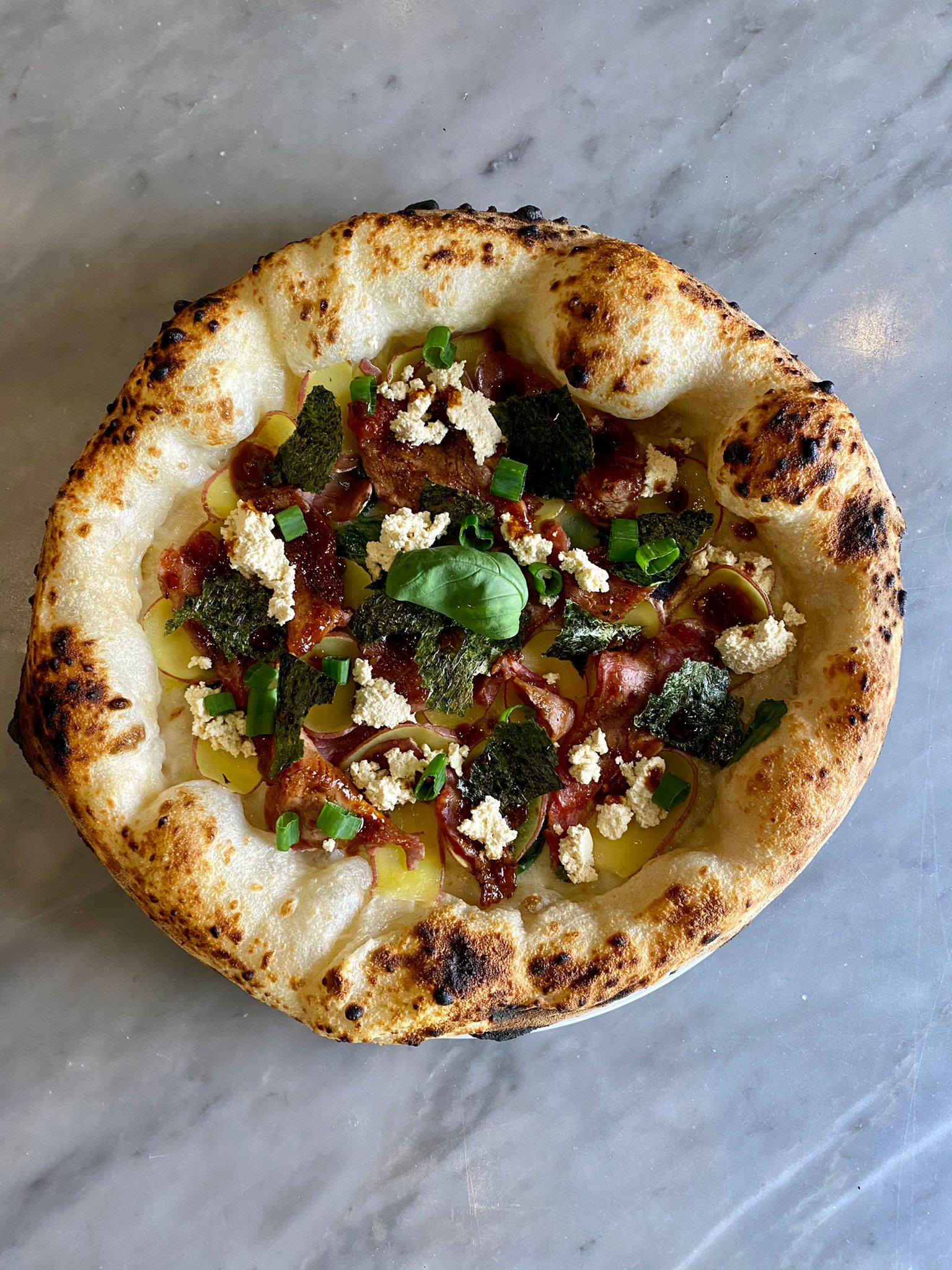 La pizza si chiama NieR ver. Emil ed è fatta con ricotta di soia fatta in casa, controfiletto di wagyu in carpaccio laccato con una salsa di miso fermentato, aceto di riso e salsa di soia, con cipollotto fresco Negi, e cips di alga Nori croccante.