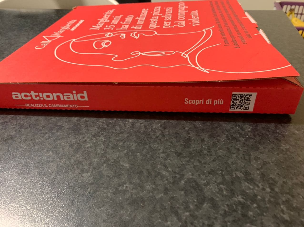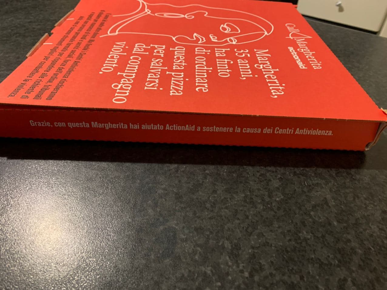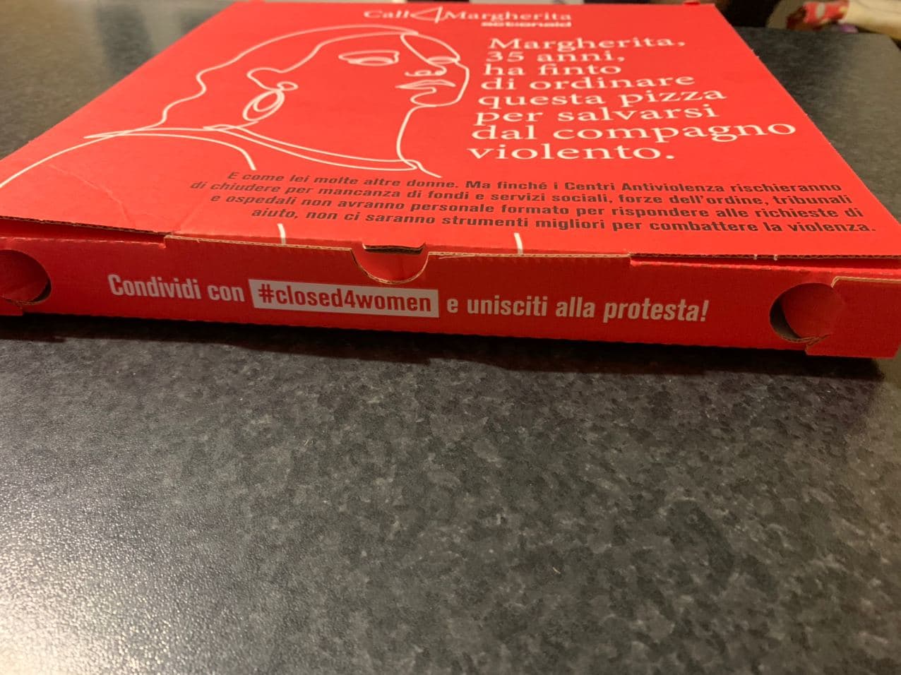 Con la mia compagna ci siamo subito premurati di andare a controllare gli speciali box relativi all’evento che, da vicino, hanno avuto un impatto ancor più piacevole di quanto avrei immaginato guardandoli nelle foto. Abbiamo notato anche alcuni dettagli molto particolari, specie quelli riguardanti i quattro bordi del box contente la pizza, tutti diversi e con incisa una scritta diversa, una scritta chiaramente a tema, in linea con lo spirito dell’iniziativa. La parte frontale, la protagonista, raffigura il volto di una donna, la “Margherita” di cui vi parlavamo ieri, ossia la donna che ha ispirato l’iniziativa dell’associazione.