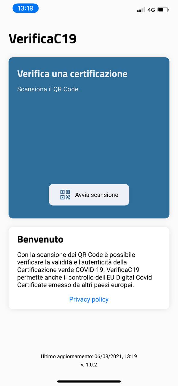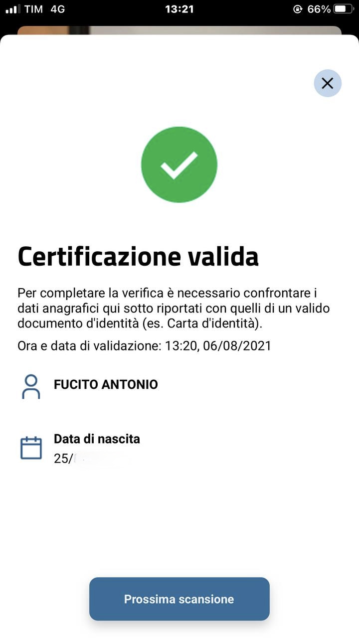 L’interfaccia, essenziale, presenta un tasto al centro con scritto “Avvia scansione” che permette di avviare la fotocamera: a quel punto, basta inquadrare il codice QR per ottenere il risultato. In caso di certificazione valida, comparirà una schermata come quella che vedete sopra che mostra, tra le altre cose, alcuni dati anagrafici del cittadino che possono essere controllati, per evitare qualsiasi tipo di frode, con un documento di identità. Il tutto è regolato da una normativa ufficiale non molto dissimile a quella che permette agli alberghi oppure ai gestori di Sim telefonica di controllare oppure consultare il proprio documento.