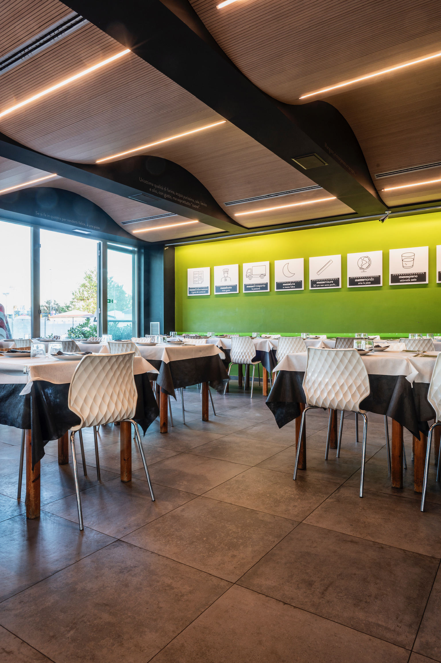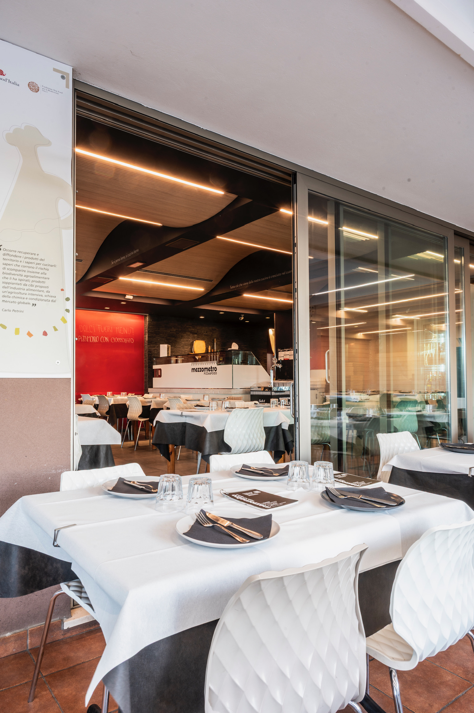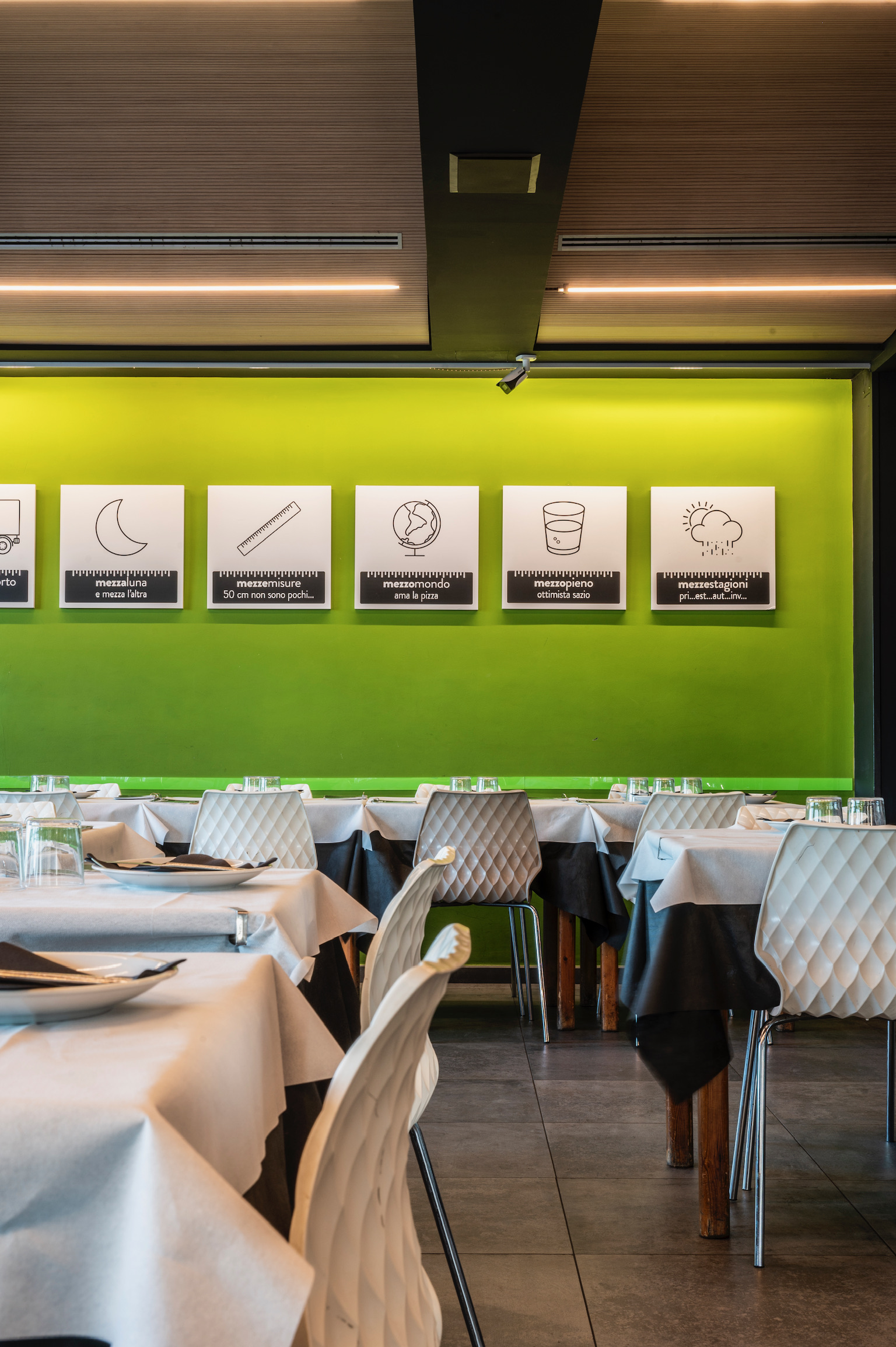 Mezzometro si trova sul lunghissimo lungomare Da Vinci, a Senigallia. Il locale presenta grandi pareti utilizzate come gigantesche lavagne con lo scopo di raccontare la novità del giorno, gli impasti e la filosofia di vita. Gli spazi si prestano sia per grande tavolate che per cene intime con coperti sia all’interno che all’esterno.