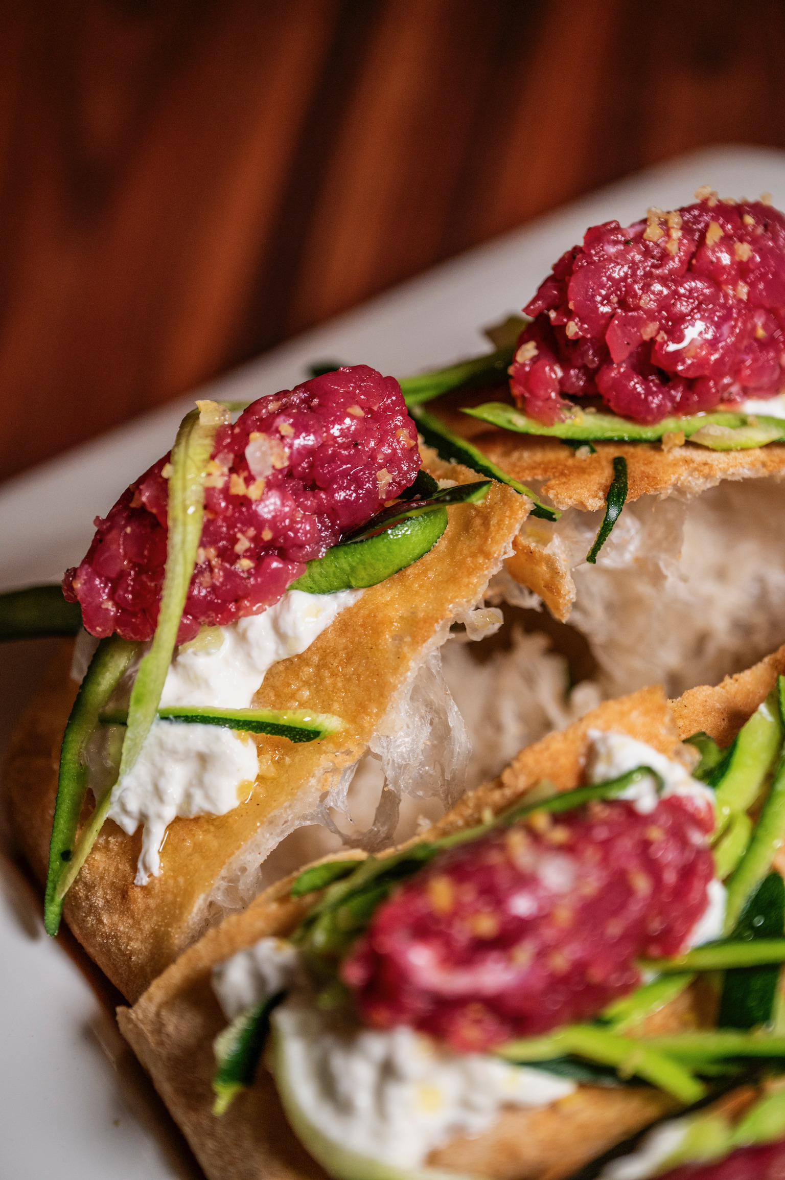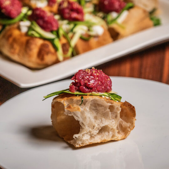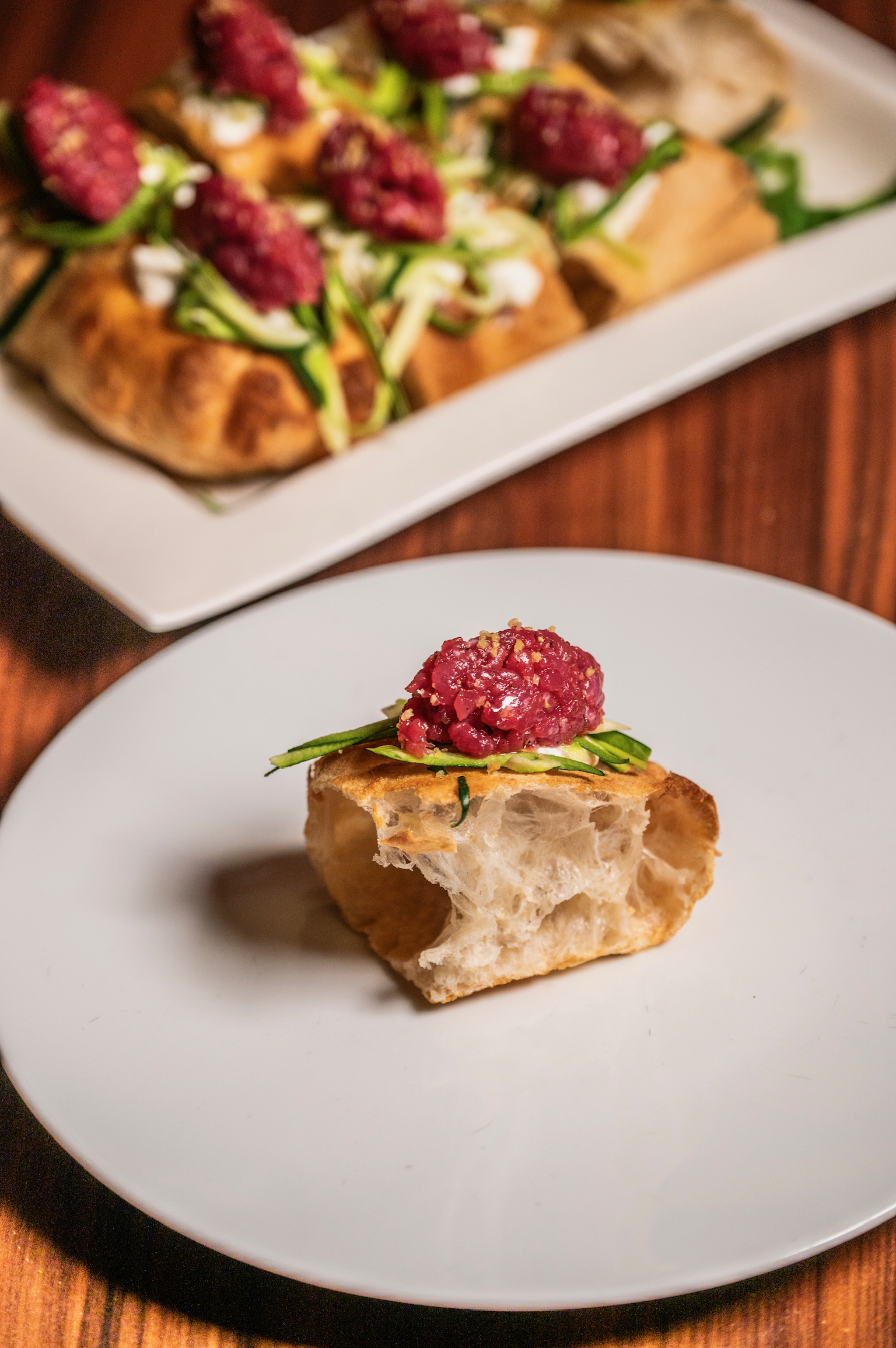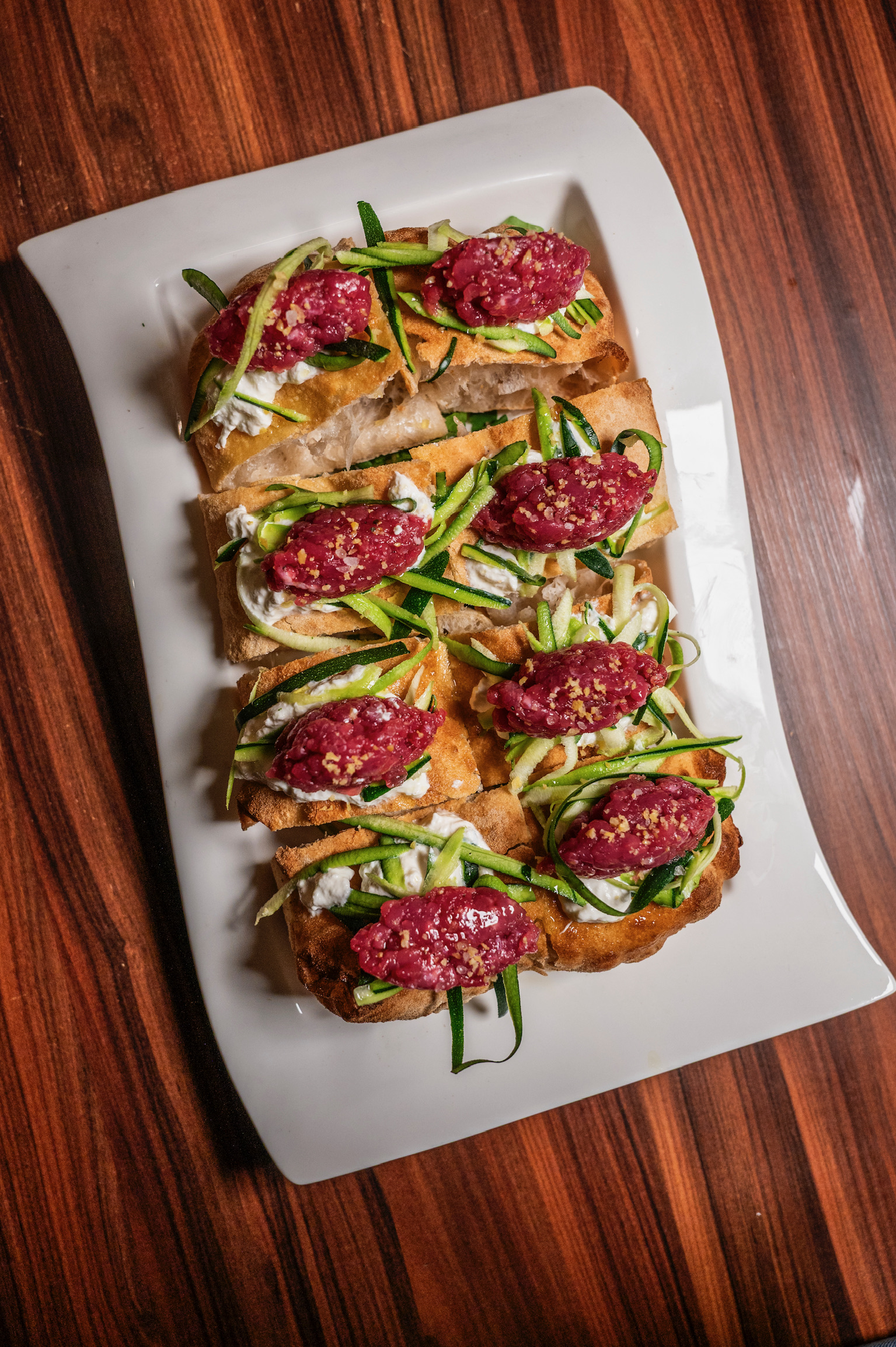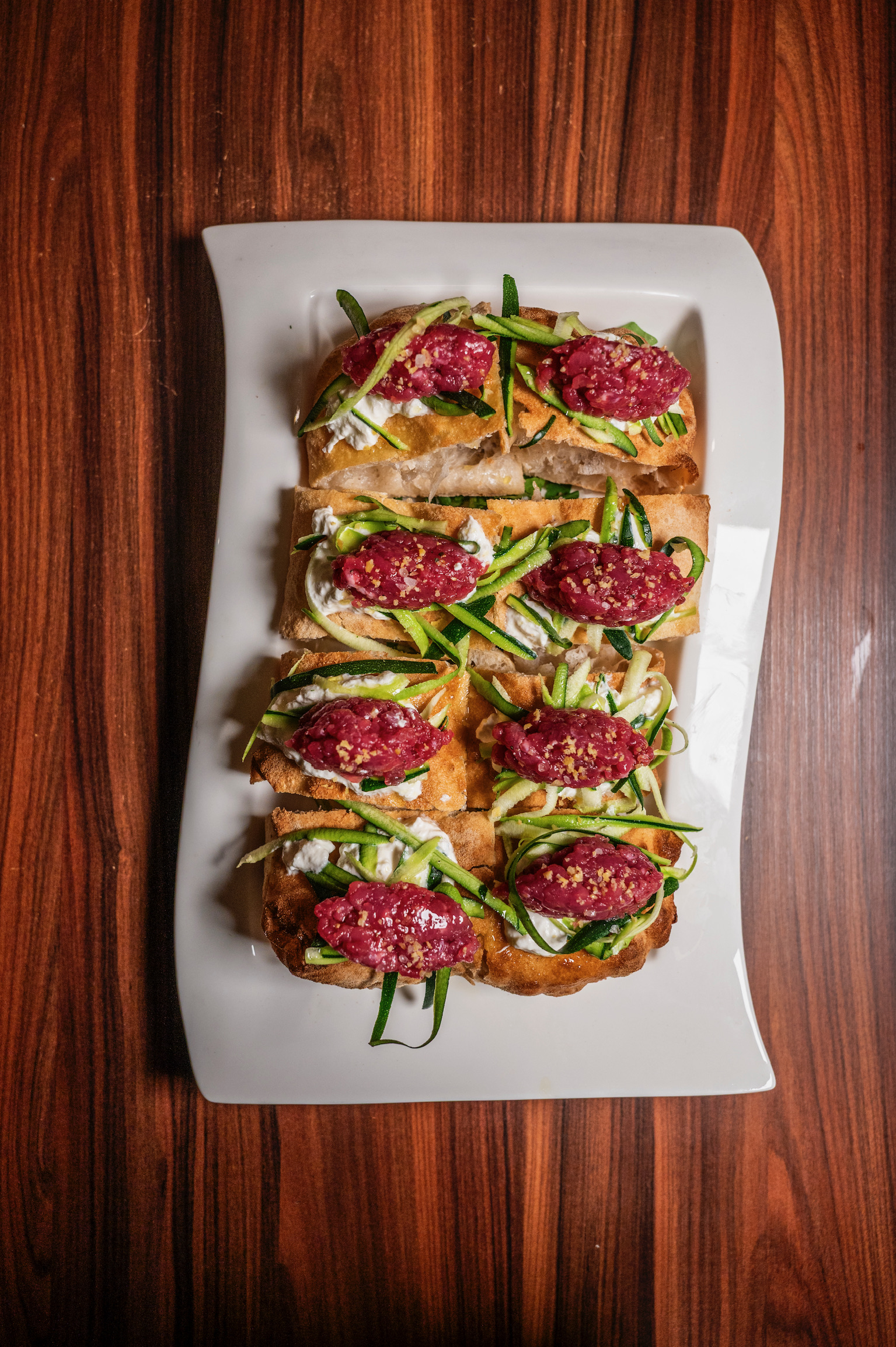 Il menu è articolato, sono presenti varie tipologie di pizza tra cui la tonda contemporanea, la crunch, la doppia cottura, la pizza fit e la pizza fritta. Gli abbinamenti spaziano dai grandi classici, come nel caso della Margherita, a sapori più articolati e contemporanei. Tra le proposte con valorizzazione dei prodotti locali spiccano la Marchigiana, con base crunch, fatta con tartare marchigiana, zucchine marinate al limone e stracciatella; e la Roast-Beef fatta con roast-beef cotto a bassa temperatura e la sua salsa, stracciatella al tartufo e radicchio appassito al miele. Anche i fritti sono presenti, tra cui le Olive all’Ascolana tipiche del territorio Marchigiano.