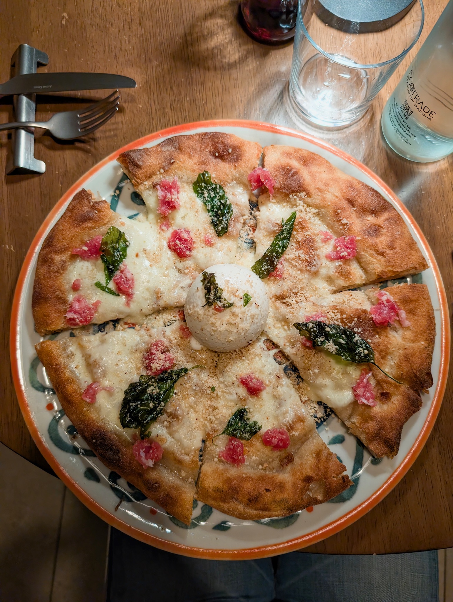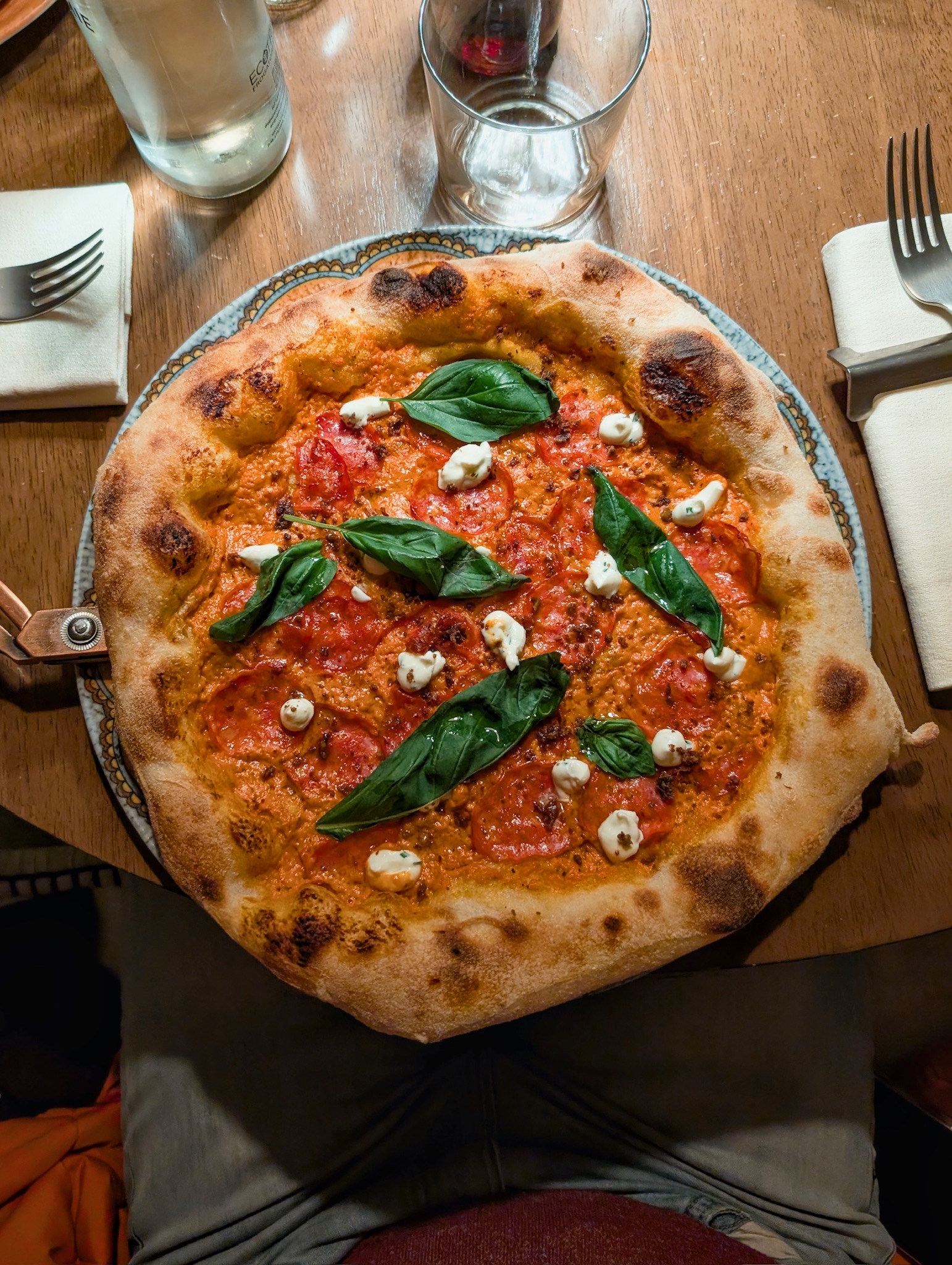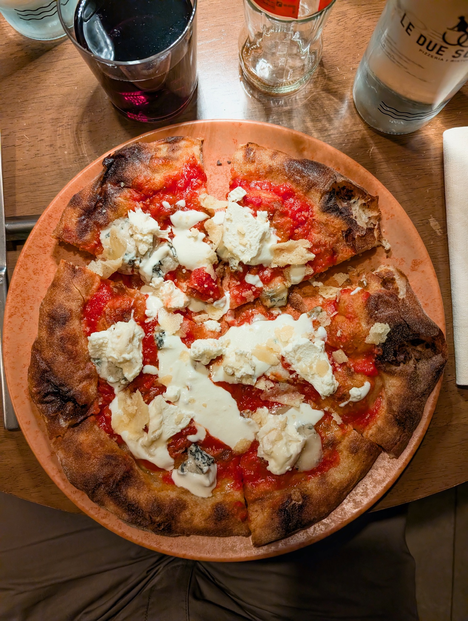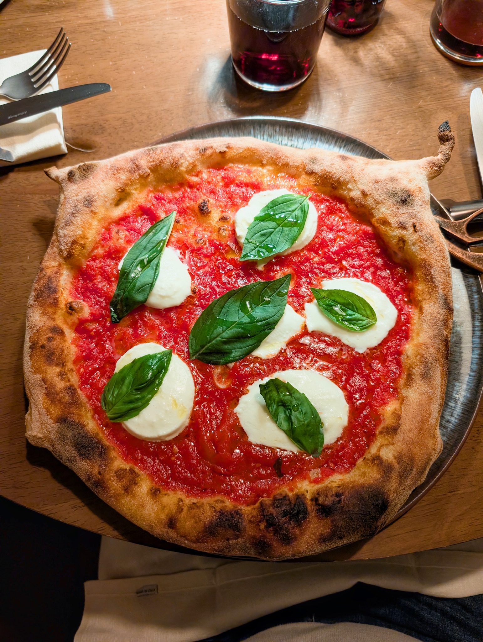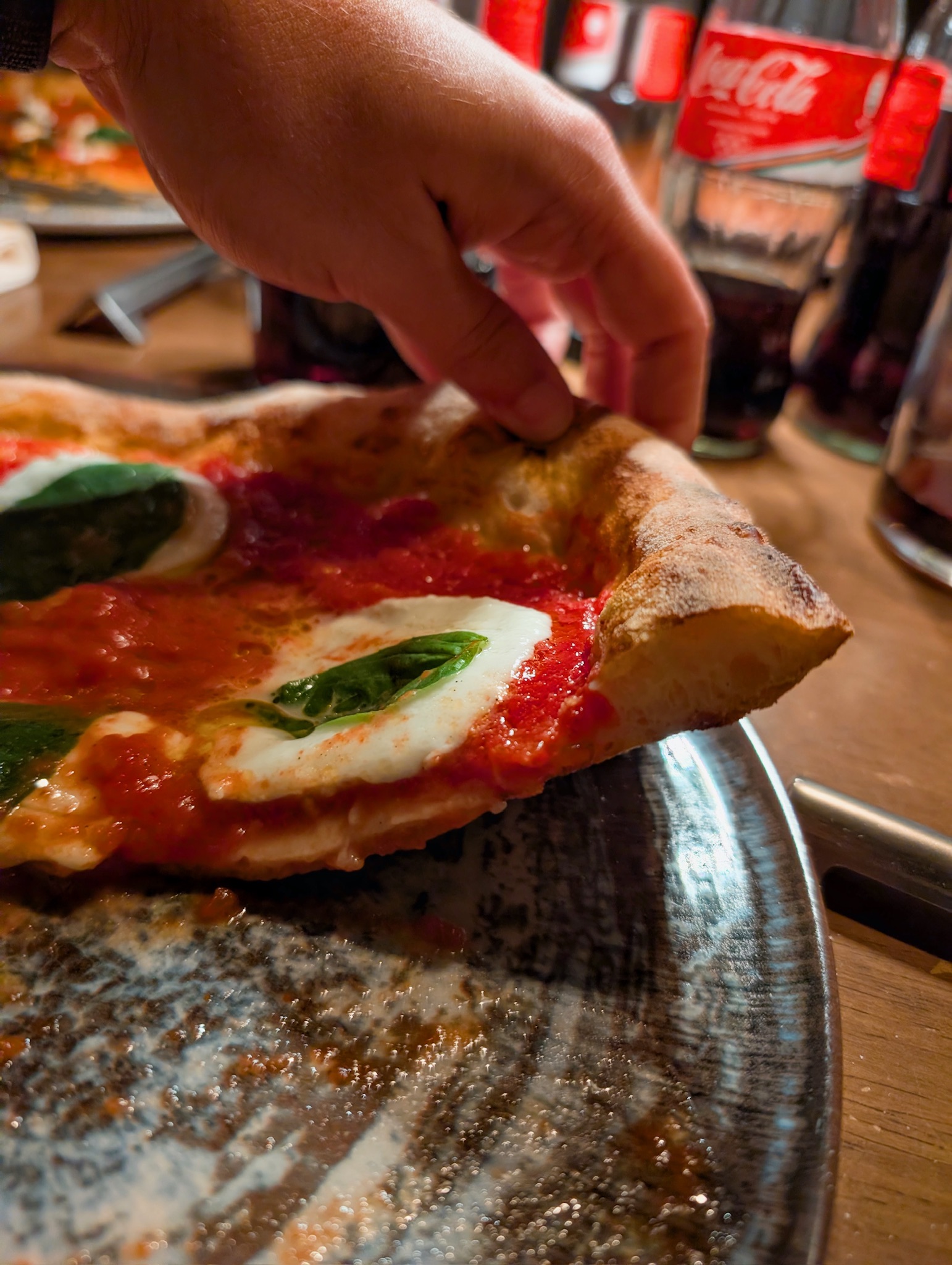 La proposta comprende tre tipologie di impasto: tradizionale (ispirato alla tradizione napoletana con farina 00 , sottile al centro e con un ampio cornicione), a Mattarello (realizzato con un mix di farina di tipo 1 e farina di riso, steso a mattarello leggero e croccante), e l’impasto Casa Nostra (il primo impasto della pizzeria, con farina di tipo 1, integrale o ai 3 cereali). Tra le pizze con impasto tradizionale degne di nota sono: la Fondo Della Teglia, fatta con mozzarella di Agerola, fondo bruno, patate arrosto, carote al burro, pancetta arrotolata e aromi; e la Marinara fatta con pomodoro pelato, aglio, origano e olio evo. Tra quelle stese a mattarello invece, merita una menzione la Parmigiana fatta con pomodoro pelato, melanzane viola glassate alla soia, fonduta di scamorza affumicata e basilico fresco; seguita dalla Pepperoni fatta con vodka sauce, salamino piccante, cream cheese all’ erba cippolina, polvere di olive essicate e basilico. La Nico, infine, fatta con mozzarella fiordilatte di Agerola, salsiccia di Bra in uscita, 100g burratina, basilico fritto e granella di nocciole, spicca tra le pizze con impasto classico.