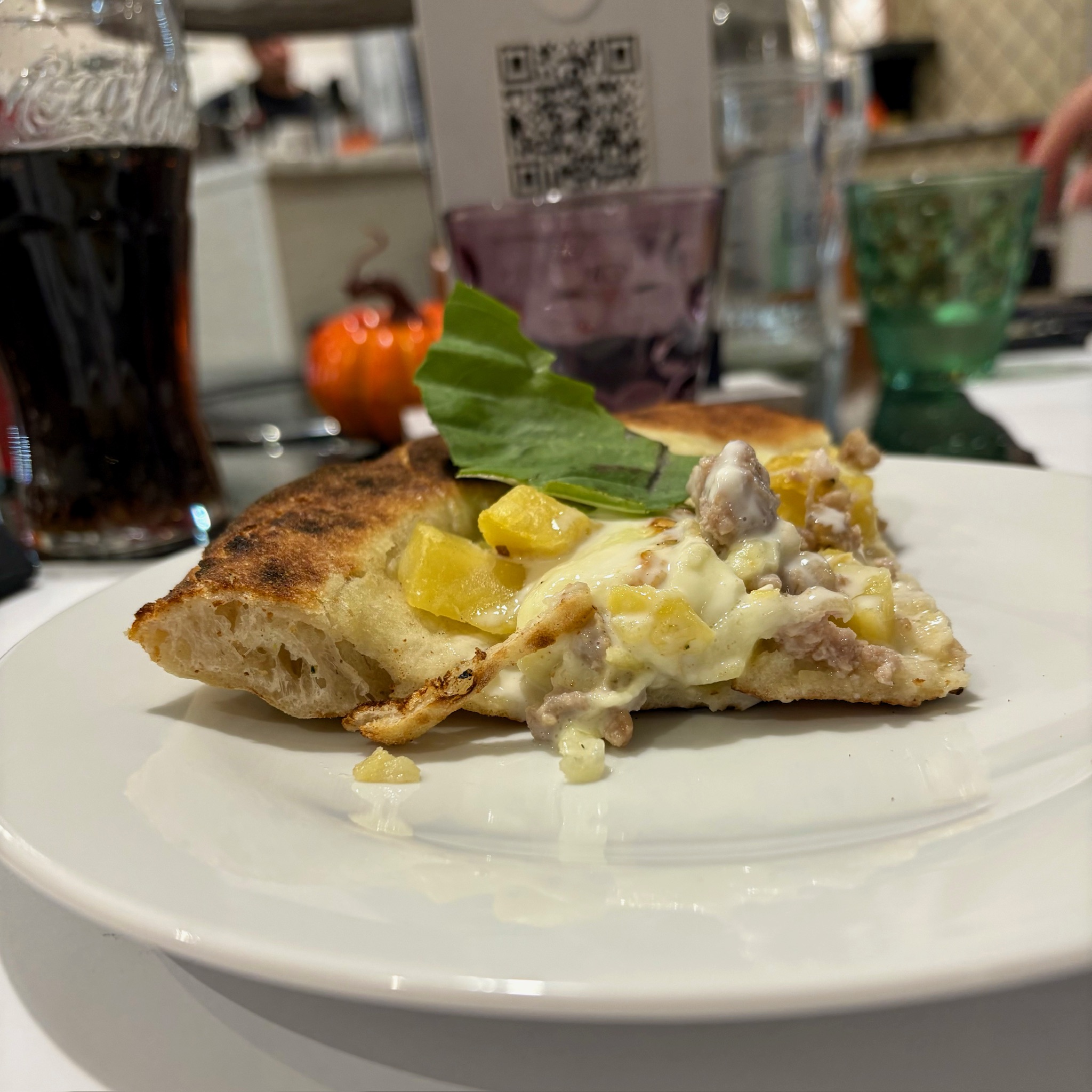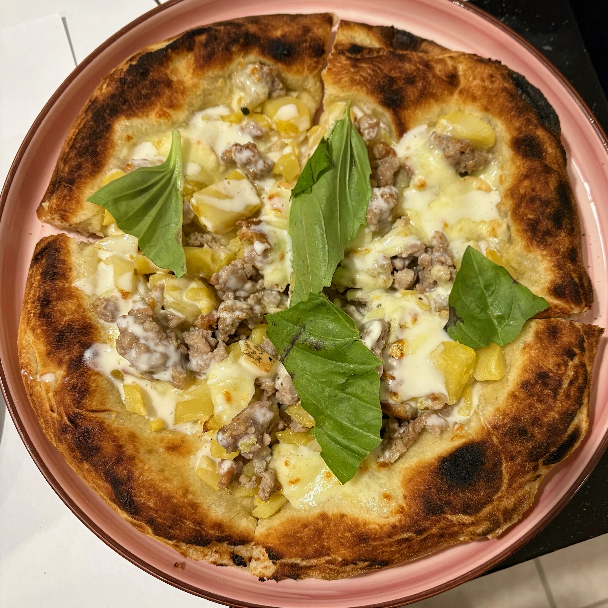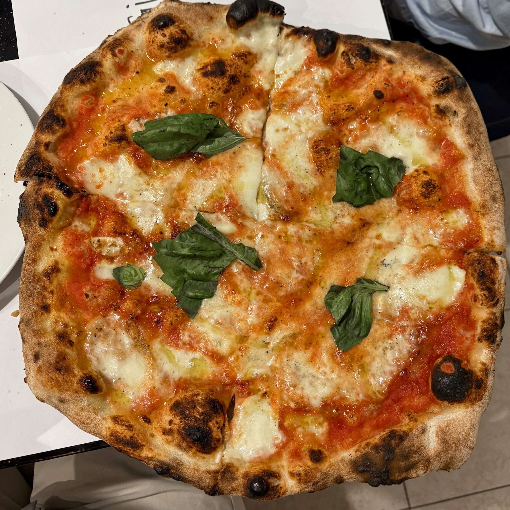 La proposta in menu comprende una sezione di pizze al padellino, seguita da una serie di pizze speciali, pizze classiche e i dolci della casa. Tra le pizze classiche c’è l’immancabile Margherita fatta con pomodoro, fiordilatte e olio evo; e la Omaggio ai Pizzaioli fatta con pomodoro, provola, pepe nero tellicherry, parmigiano reggiano 30 mesi, basilico in cottura e olio evo. Tra i padellini merita una menzione il Genovese farcito con la genovese, fatta con muscolo di bovino e cipolla ramata, mozzarella di bufala, pecorino toscano grattugiato e olio evo. L’Old School invece, un ruoto con patate cotte sotto cenere, provola affumicata, salsiccia fresca, in uscita fonduta di parmigiano reggiano e olio evo, merita una menzione tra le pizze speciali.