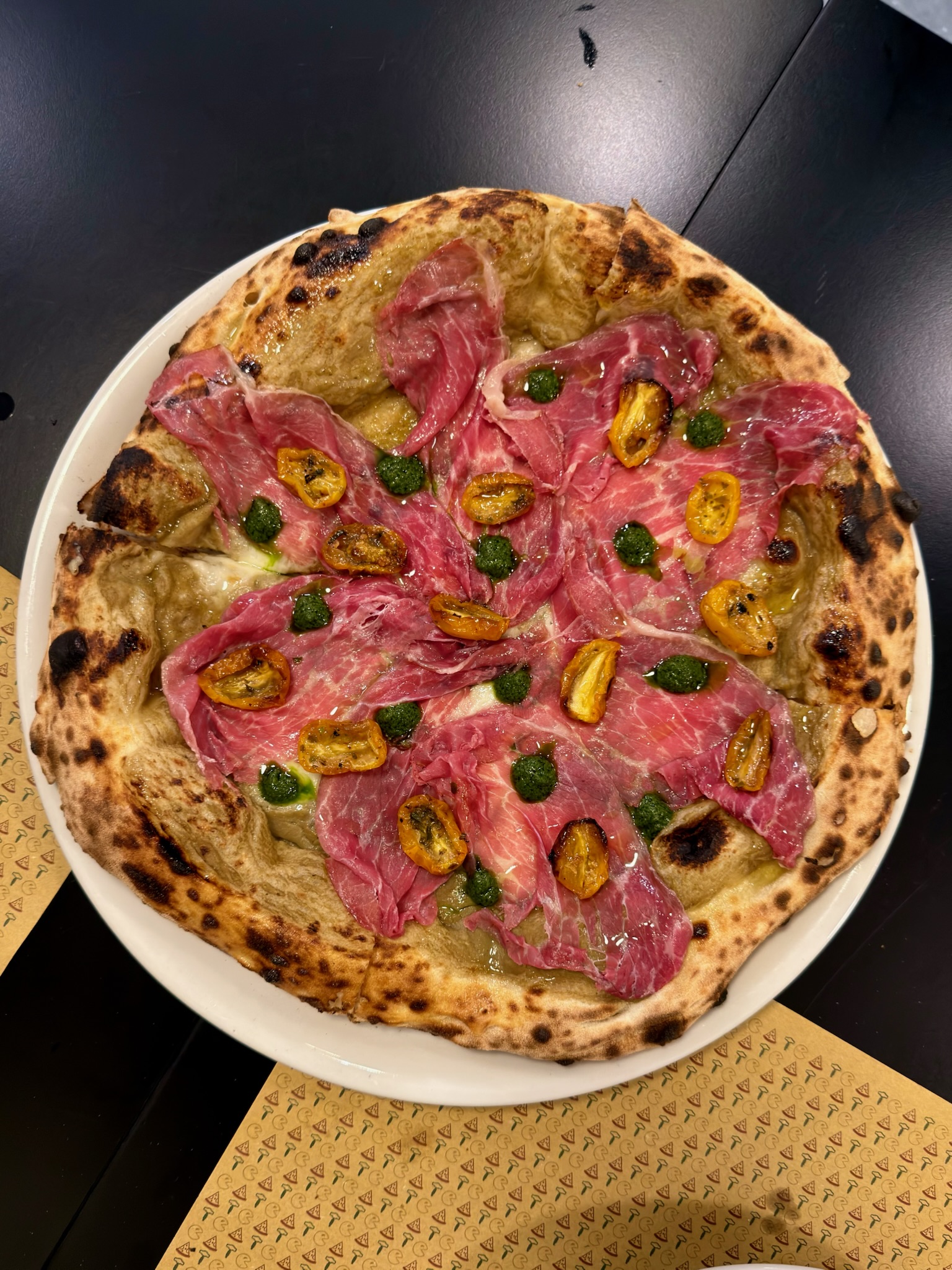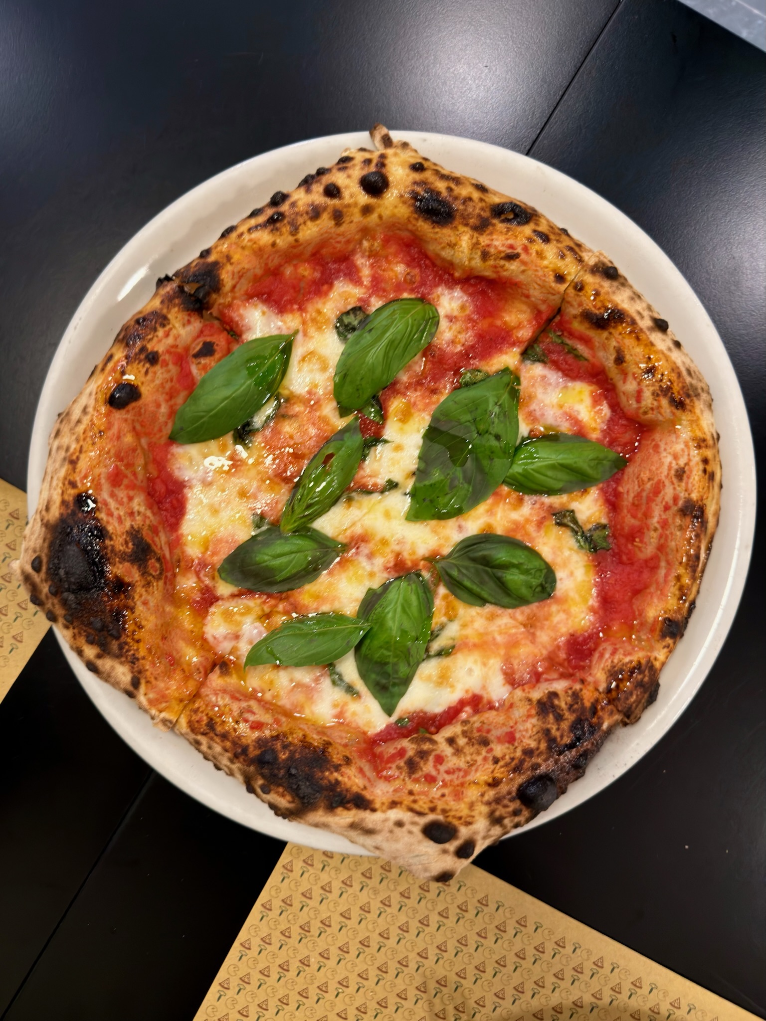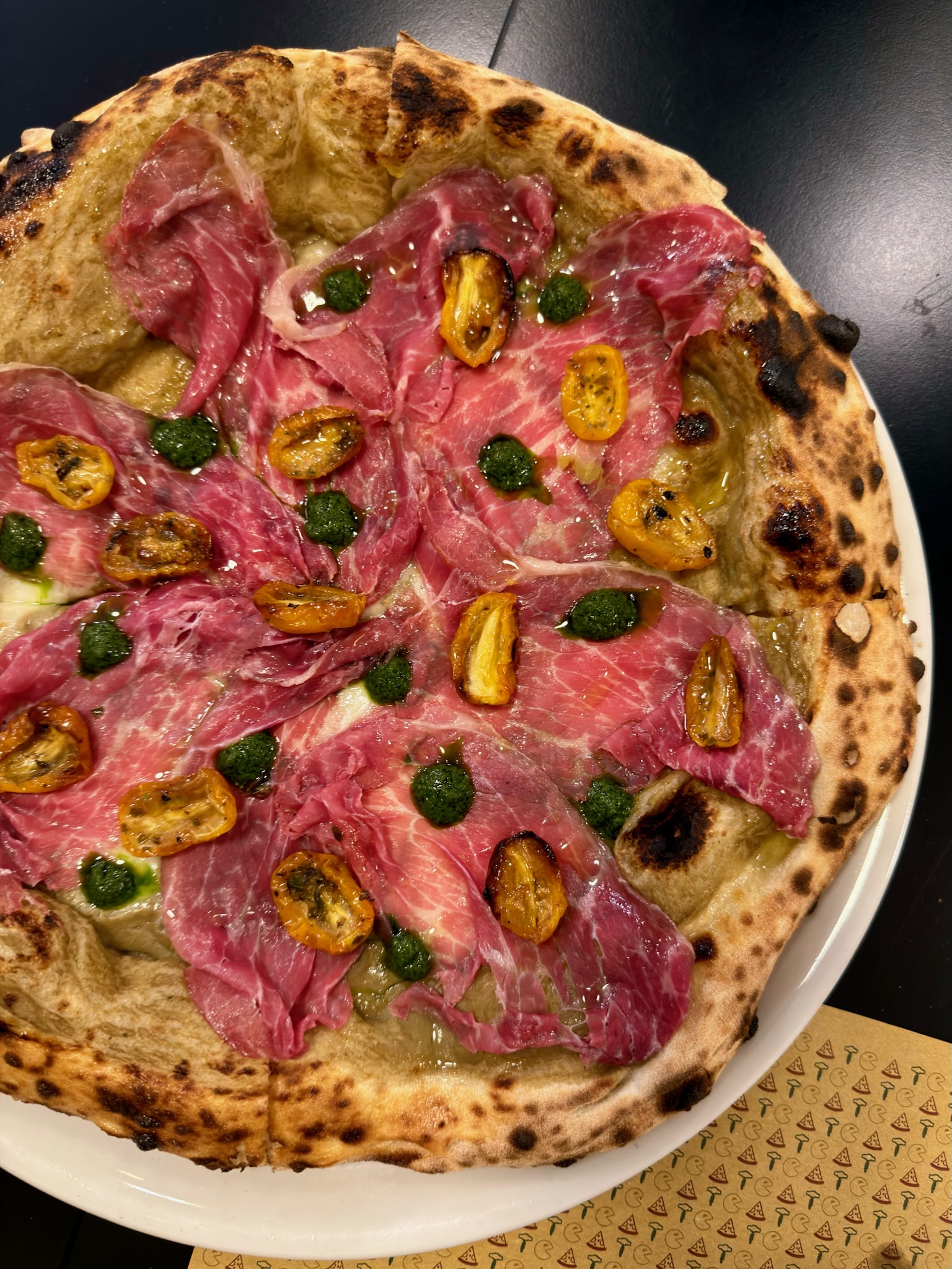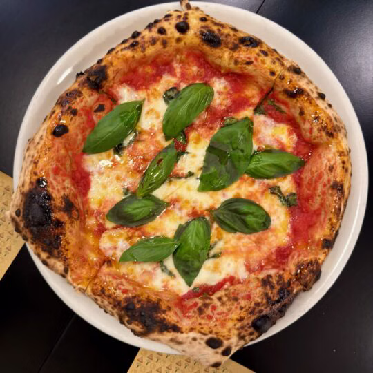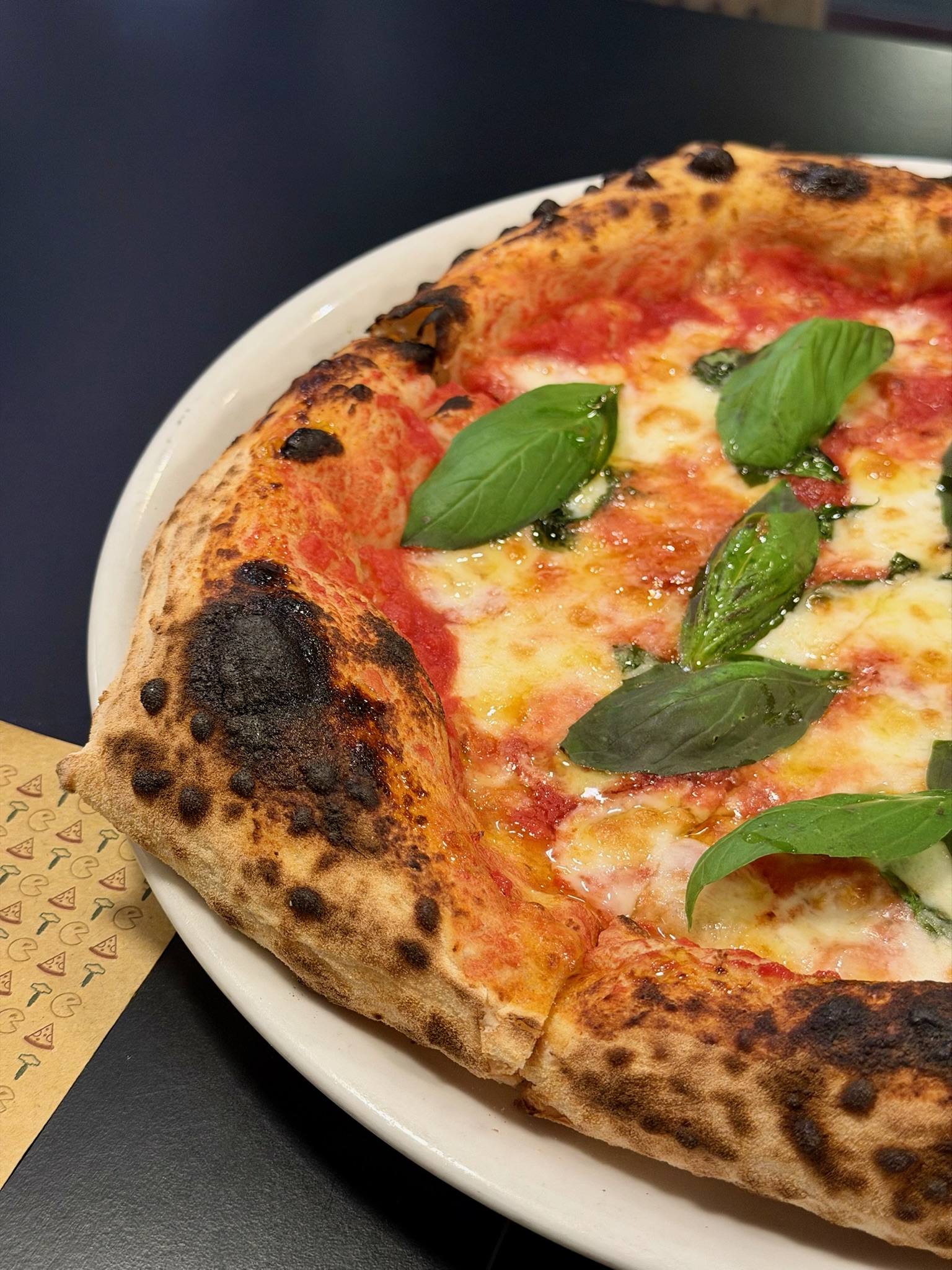 Francesco crea una pizza che unisce la tradizione napoletana e le tecniche innovative di panificazione, col sapore genuino degli ingredienti stagionali della sua terra, l’Alta Murgia. La proposta in menu si articola in bruschette (con pane autoprodotto), padellini, pizze in doppia cottura e pizze tonde con una sezione dedicata alla Margherita. Tra queste ultime non può mancare la Margherita classica fatta con pomodoro San Marzano, fiordilatte, olio evo e basilico, e la Regina fatta con pomodorino, fiordilatte, Parmigiano Reggiano, basilico fresco e olio evo. Altura merita una menzione tra i padellini, fatta con stracciatella, pancetta artigianale alle erbe della Murgia, pomodorini gialli semidried, polvere di olive, basilico fresco e olio evo; mentre tra le pizze tonde della sezione ‘Le imperdibili’, spicca la Melangus fatta con crema di melanzane, mozzarella di bufala, carpaccio di black angus affumicato, pomodorini gialli semidried, salsa al basilico e olio evo.