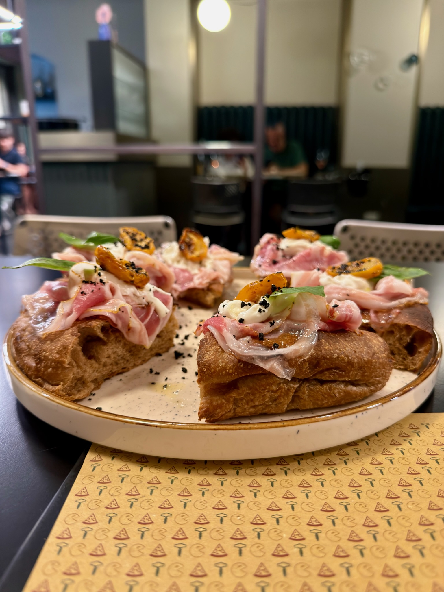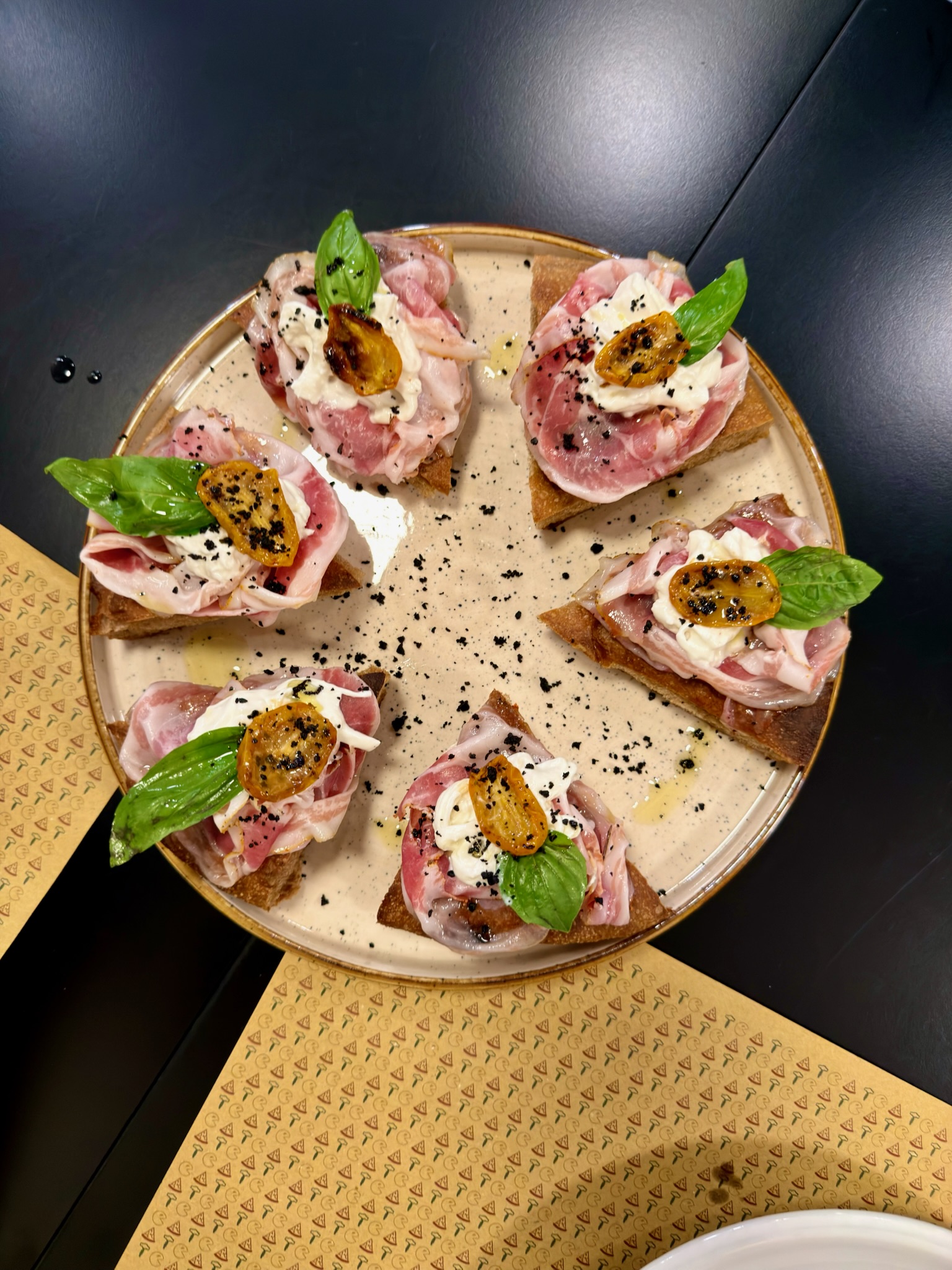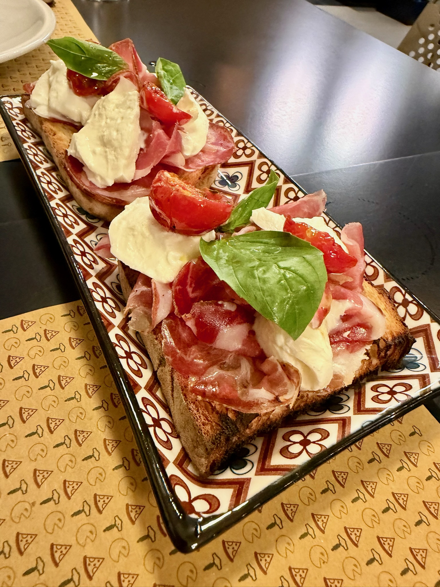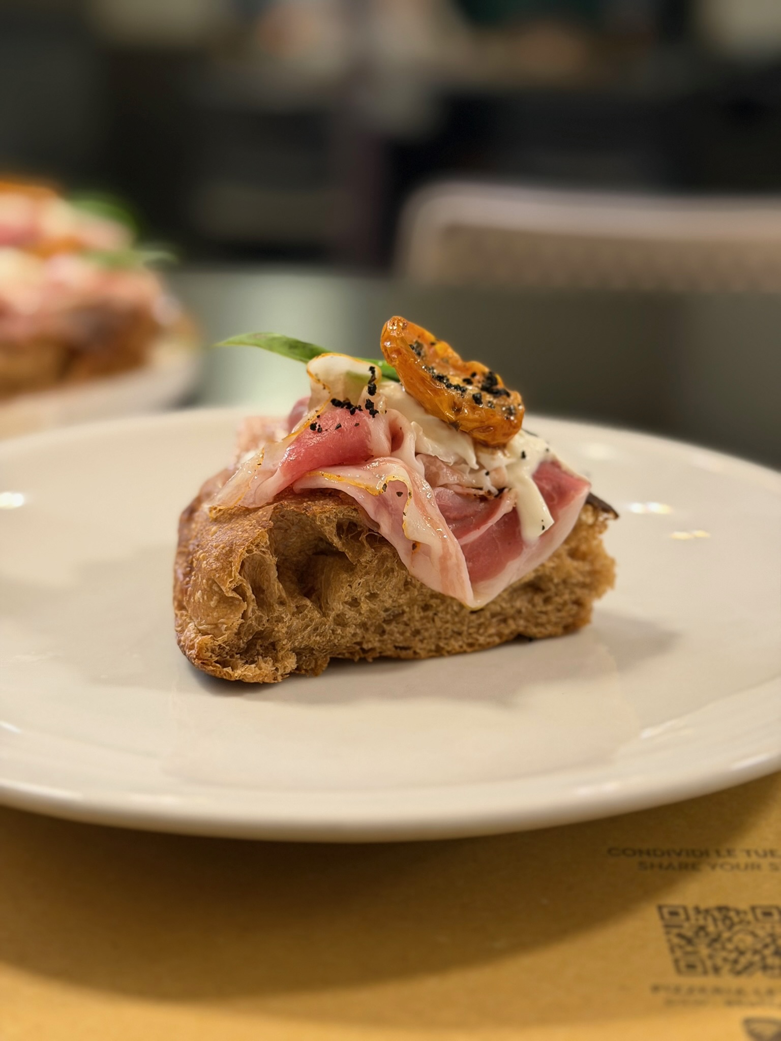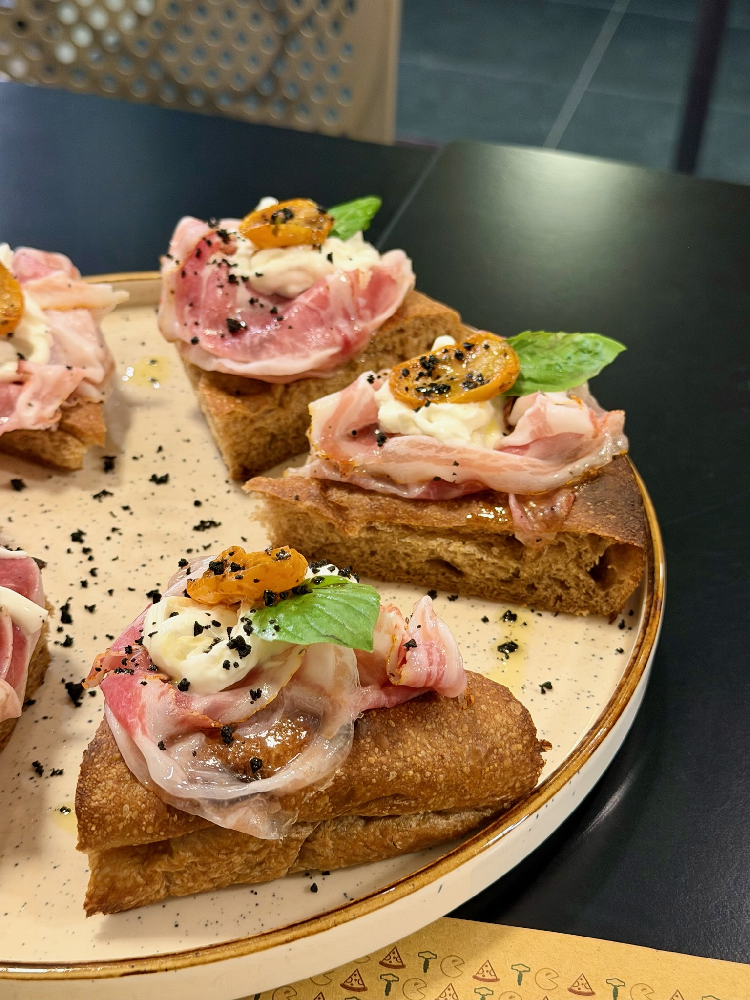 Francesco crea una pizza che unisce la tradizione napoletana e le tecniche innovative di panificazione, col sapore genuino degli ingredienti stagionali della sua terra, l’Alta Murgia. La proposta in menu si articola in bruschette (con pane autoprodotto), padellini, pizze in doppia cottura e pizze tonde con una sezione dedicata alla Margherita. Tra queste ultime non può mancare la Margherita classica fatta con pomodoro San Marzano, fiordilatte, olio evo e basilico, e la Regina fatta con pomodorino, fiordilatte, Parmigiano Reggiano, basilico fresco e olio evo. Altura merita una menzione tra i padellini, fatta con stracciatella, pancetta artigianale alle erbe della Murgia, pomodorini gialli semidried, polvere di olive, basilico fresco e olio evo; mentre tra le pizze tonde della sezione ‘Le imperdibili’, spicca la Melangus fatta con crema di melanzane, mozzarella di bufala, carpaccio di black angus affumicato, pomodorini gialli semidried, salsa al basilico e olio evo.