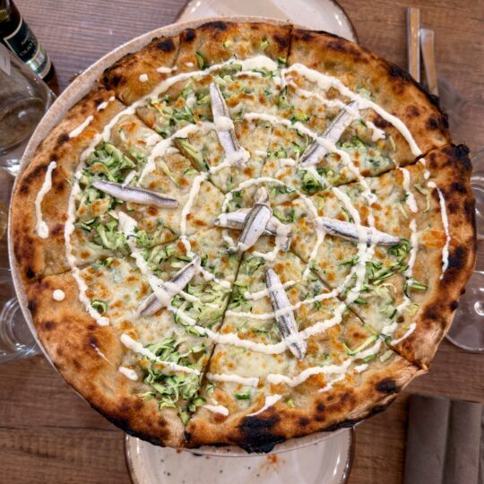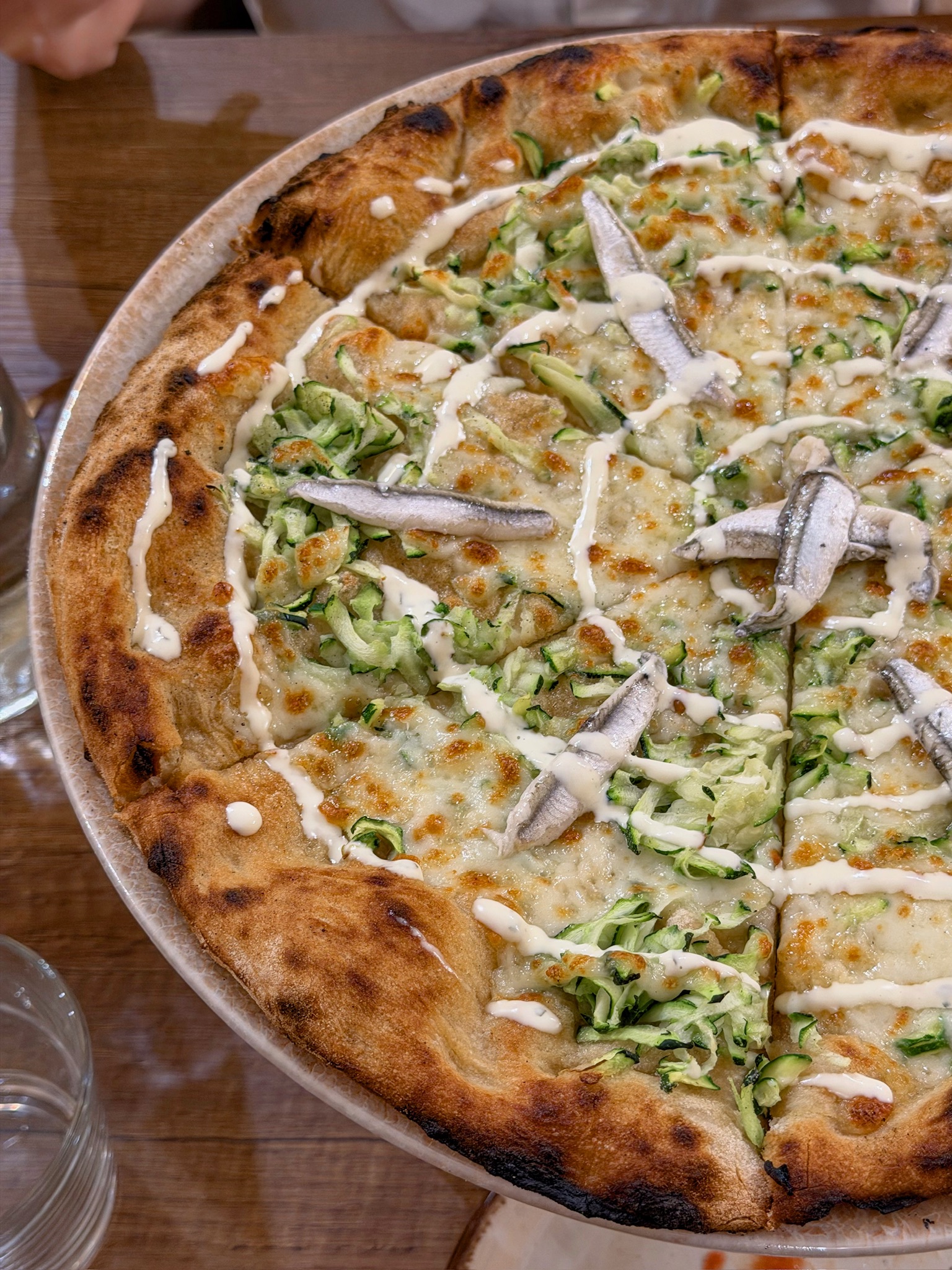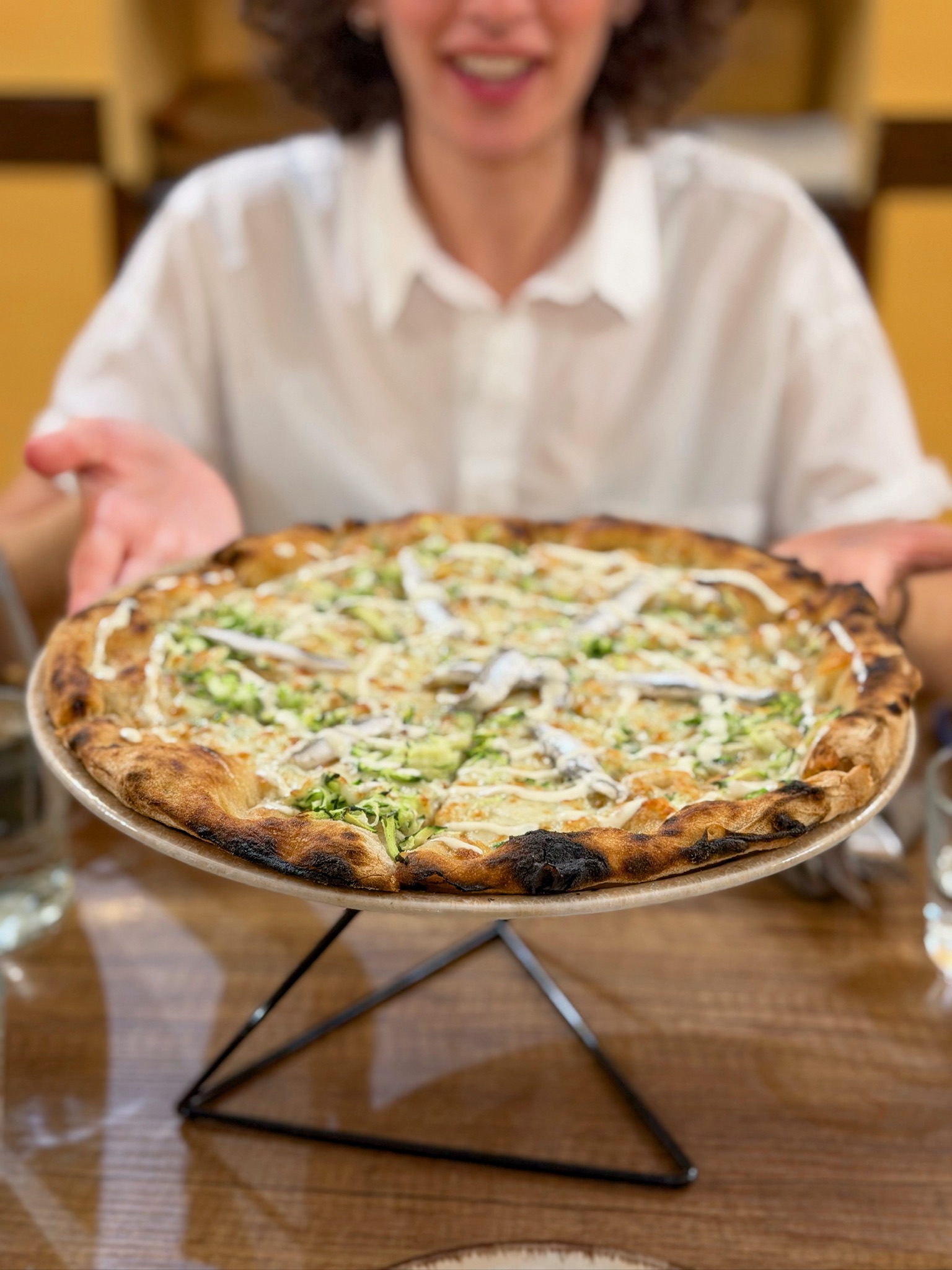 La proposta in menu è essenziale con prodotti freschi e di stagione con possibilità di scelta tra la pizza con bordo basso e la napoletana contemporanea con cornicione più pronunciato. Tra le pizze tradizionali non può mancare la Margherita fatta con pomodoro, fiordilatte, basilico e olio evo, e la Provola e Pepe fatta con pomodoro, provola, pepe nero macinato e basilico; seguita dalla rivisitazione di un altro grande classico, la Marinara dei Signori fatta con crema di datterino giallo, mozzarella, capperi, acciughe del Cantabrico, origano e olive taggiasche. Per quanto riguarda le pizze con abbinamenti più particolari invece, spicca la Alici Come Prima fatta con fiordilatte, zucchine, alici marinate e maionese alla menta; e la pizza stagionale fatta con passata di pomodoro giallo, capocollo, burrata e castagne sbriciolate. In fine, anche i fritti sono presenti, a tal proposito merita una menzione la Frittatina di orecchiette con cime di rapa.