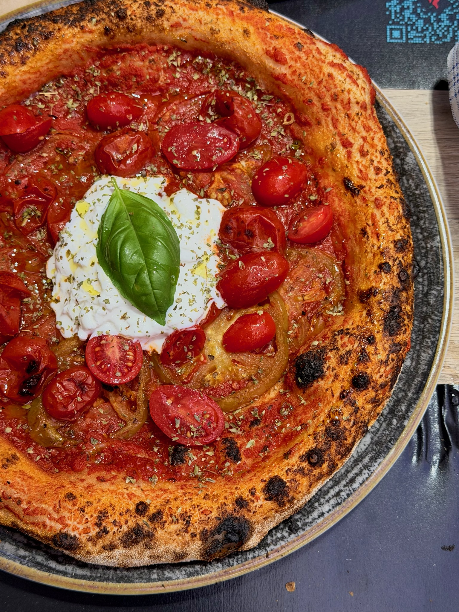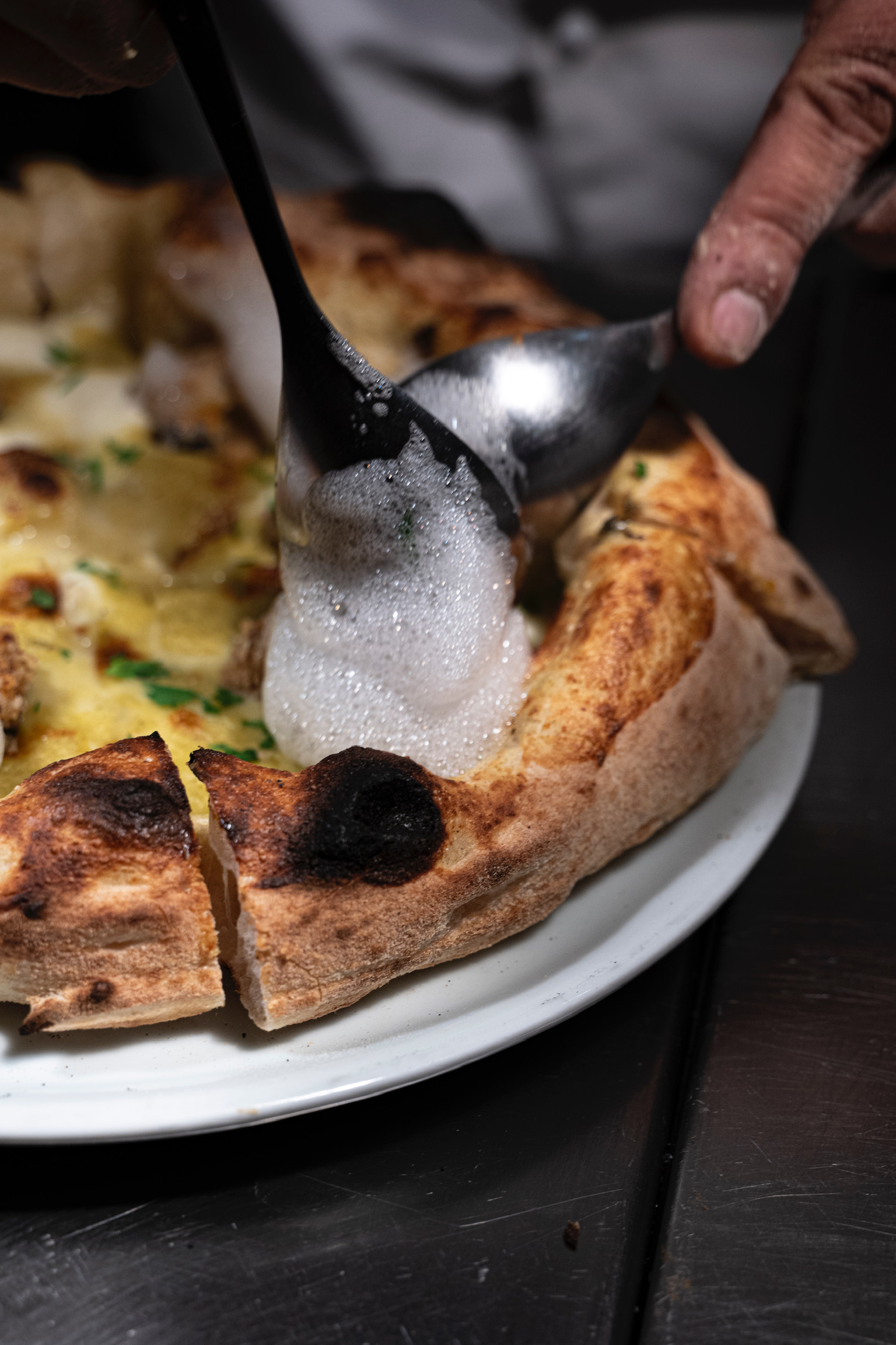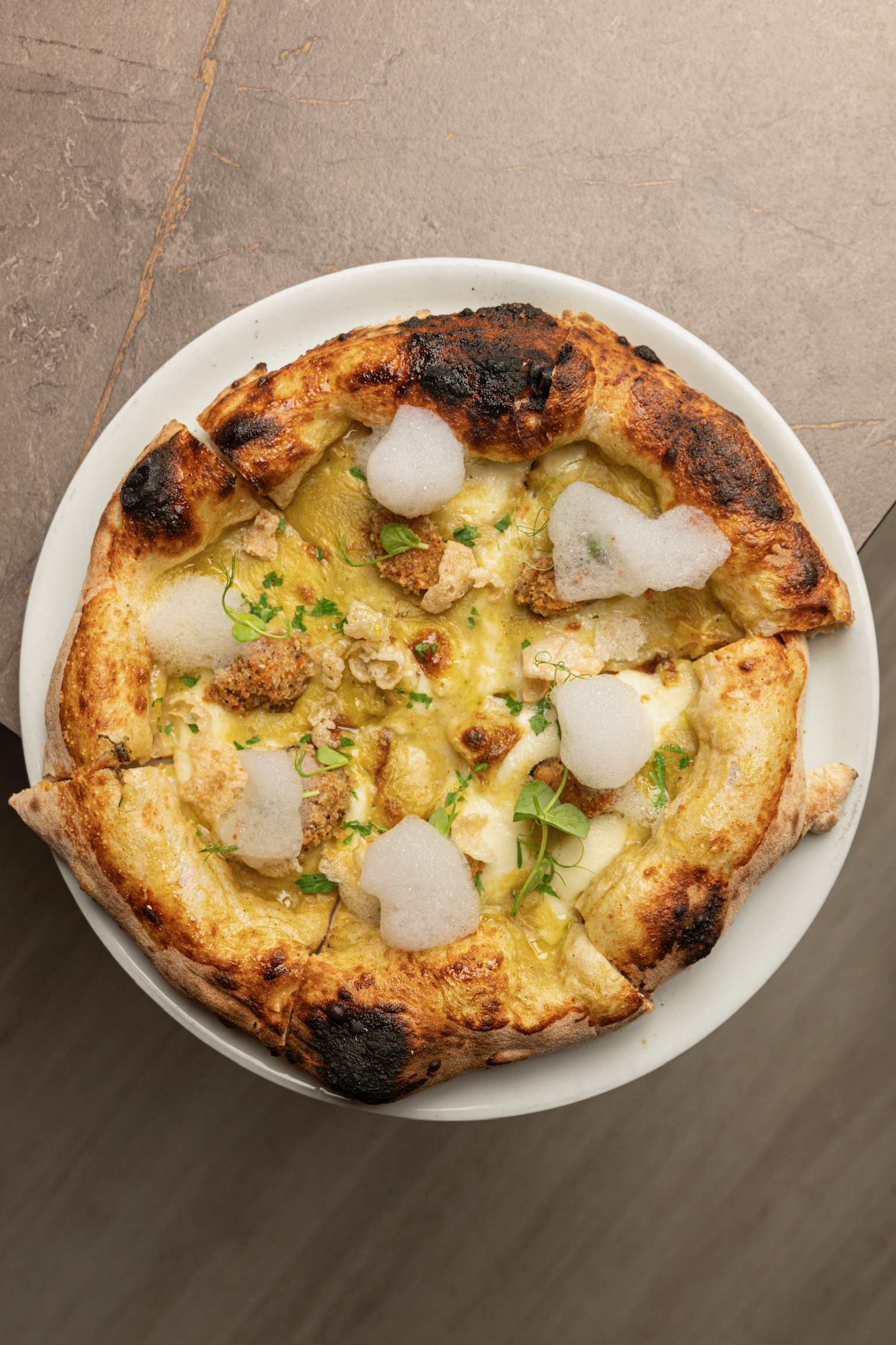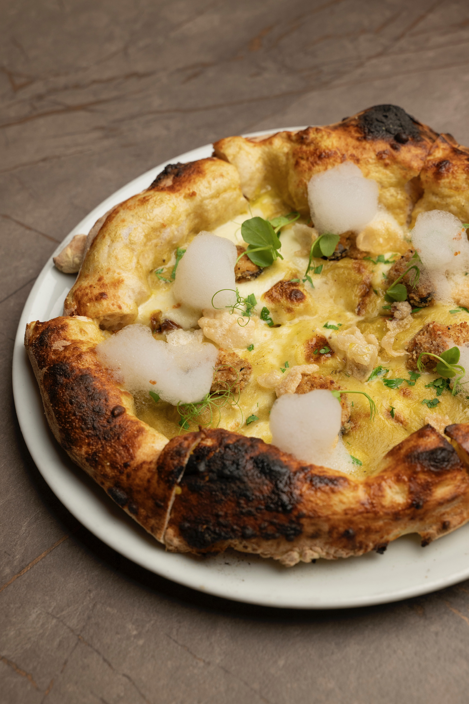 Al comando pizza c’è Ruggiero Francavilla che propone una pizza contemporanea, taglia M, con cornicione pronunciato. Il menu prevede antipasti, tra cui la Focaccia Barese fatta con pomodoro, olio e origano; pizze classiche come nel caso della Margherita fatta con pomodoro san marzano, fiordilatte, basilico e olio evo; e piatti classici pugliesi reinterpretati sul disco di pasta come la Patate Riso e Cozze fatta con fiordilatte, crema di patate in cottura, cozze gratinate, all’uscita chips di riso soffiato prezzemolo tritato, e aria di latte di mozzarella. Altre pizze degne di nota sono la Speck-tacolo fatta con fiordilatte e crema di cavolo viola in cottura, datterino giallo, speck d’anatra, mandorla di Avola affumicata all’uscita; e La Bella Affumicata fatta con provola di bufala affumicata campana, pancetta tesa affumicata, mandorla di Avola affumicata, yogurt magro affumicato, zest di lime e olio evo. Anche i dolci sono presenti tra cui la Margherita Dolce, fatta con base di frolla, marmellata di pomodoro, ricotta dolce e basilico caramelizzato al cioccolato.