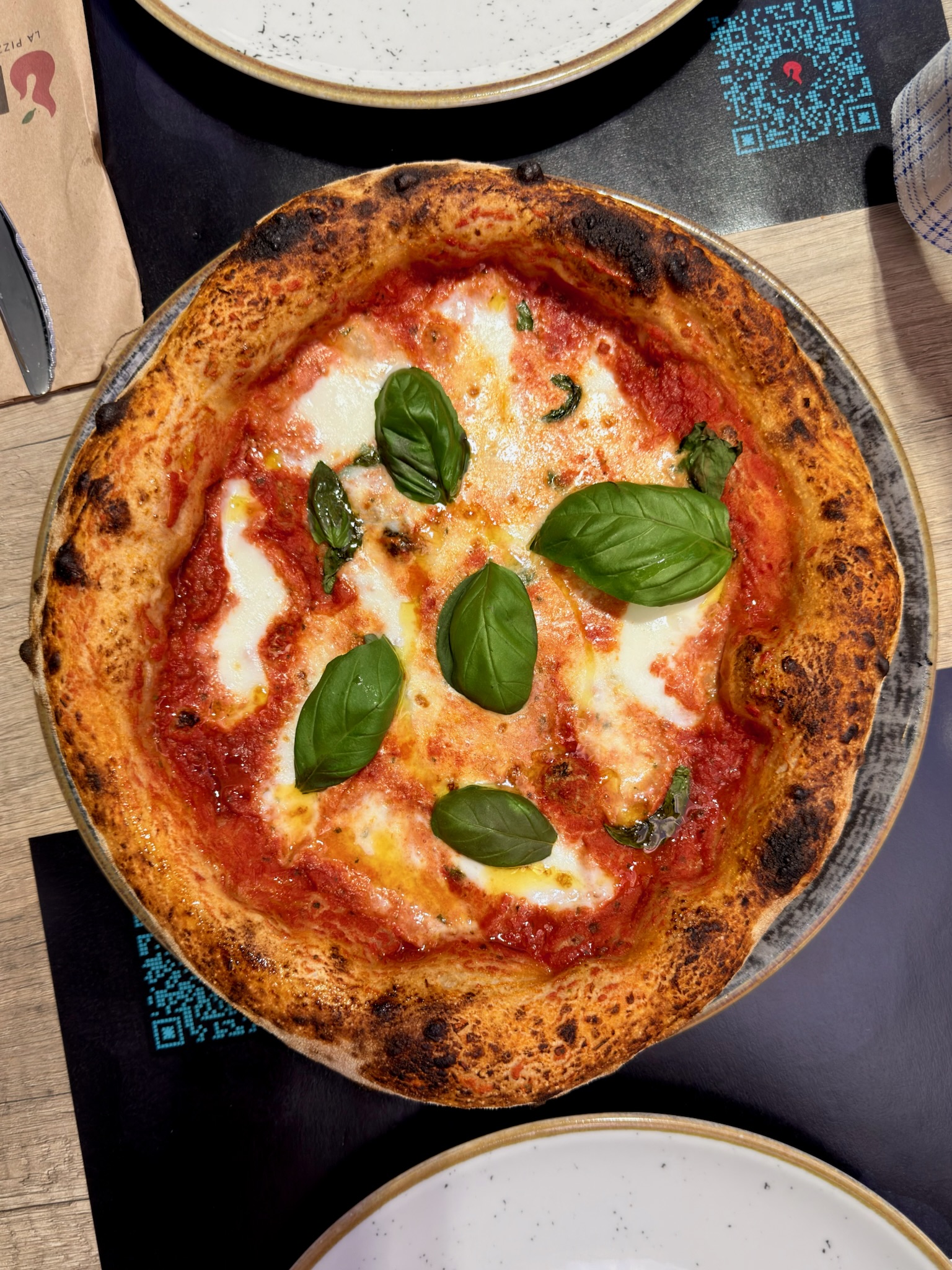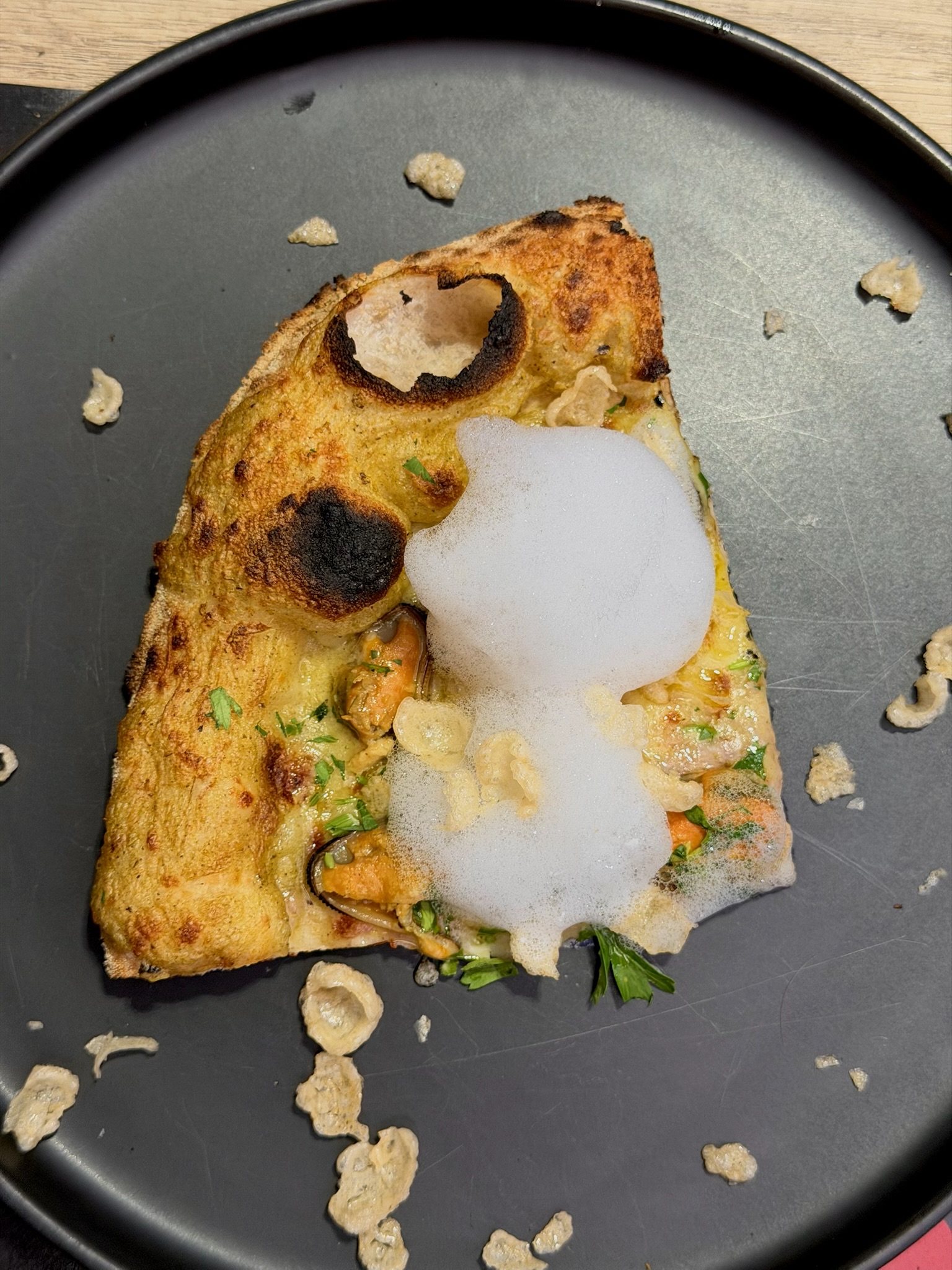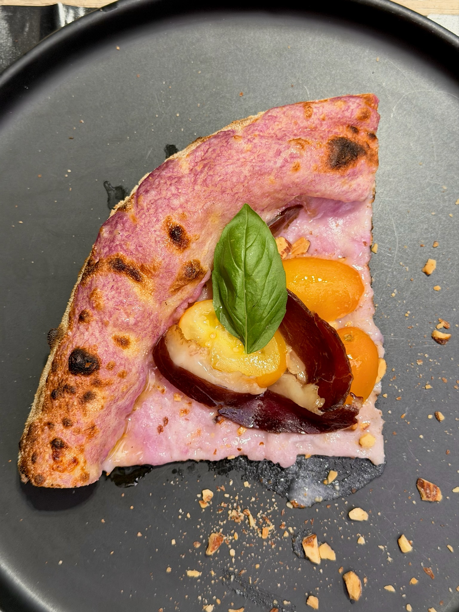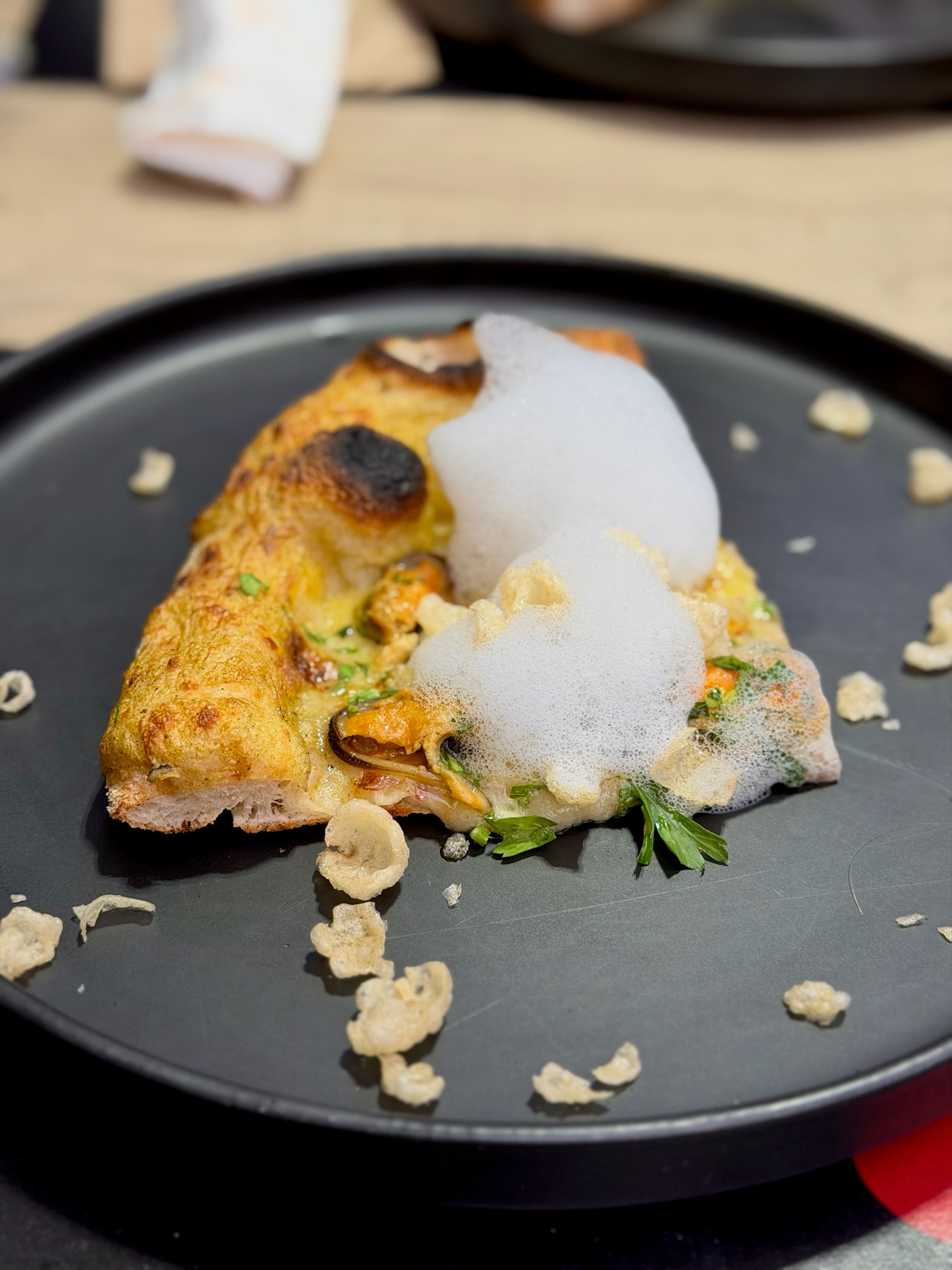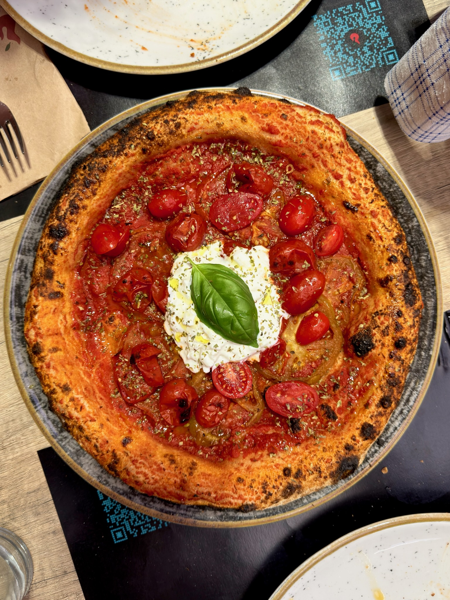 Al comando pizza c’è Ruggiero Francavilla che propone una pizza contemporanea, taglia M, con cornicione pronunciato. Il menu prevede antipasti, tra cui la Focaccia Barese fatta con pomodoro, olio e origano; pizze classiche come nel caso della Margherita fatta con pomodoro san marzano, fiordilatte, basilico e olio evo; e piatti classici pugliesi reinterpretati sul disco di pasta come la Patate Riso e Cozze fatta con fiordilatte, crema di patate in cottura, cozze gratinate, all’uscita chips di riso soffiato prezzemolo tritato, e aria di latte di mozzarella. Altre pizze degne di nota sono la Speck-tacolo fatta con fiordilatte e crema di cavolo viola in cottura, datterino giallo, speck d’anatra, mandorla di Avola affumicata all’uscita; e La Bella Affumicata fatta con provola di bufala affumicata campana, pancetta tesa affumicata, mandorla di Avola affumicata, yogurt magro affumicato, zest di lime e olio evo. Anche i dolci sono presenti tra cui la Margherita Dolce, fatta con base di frolla, marmellata di pomodoro, ricotta dolce e basilico caramelizzato al cioccolato.