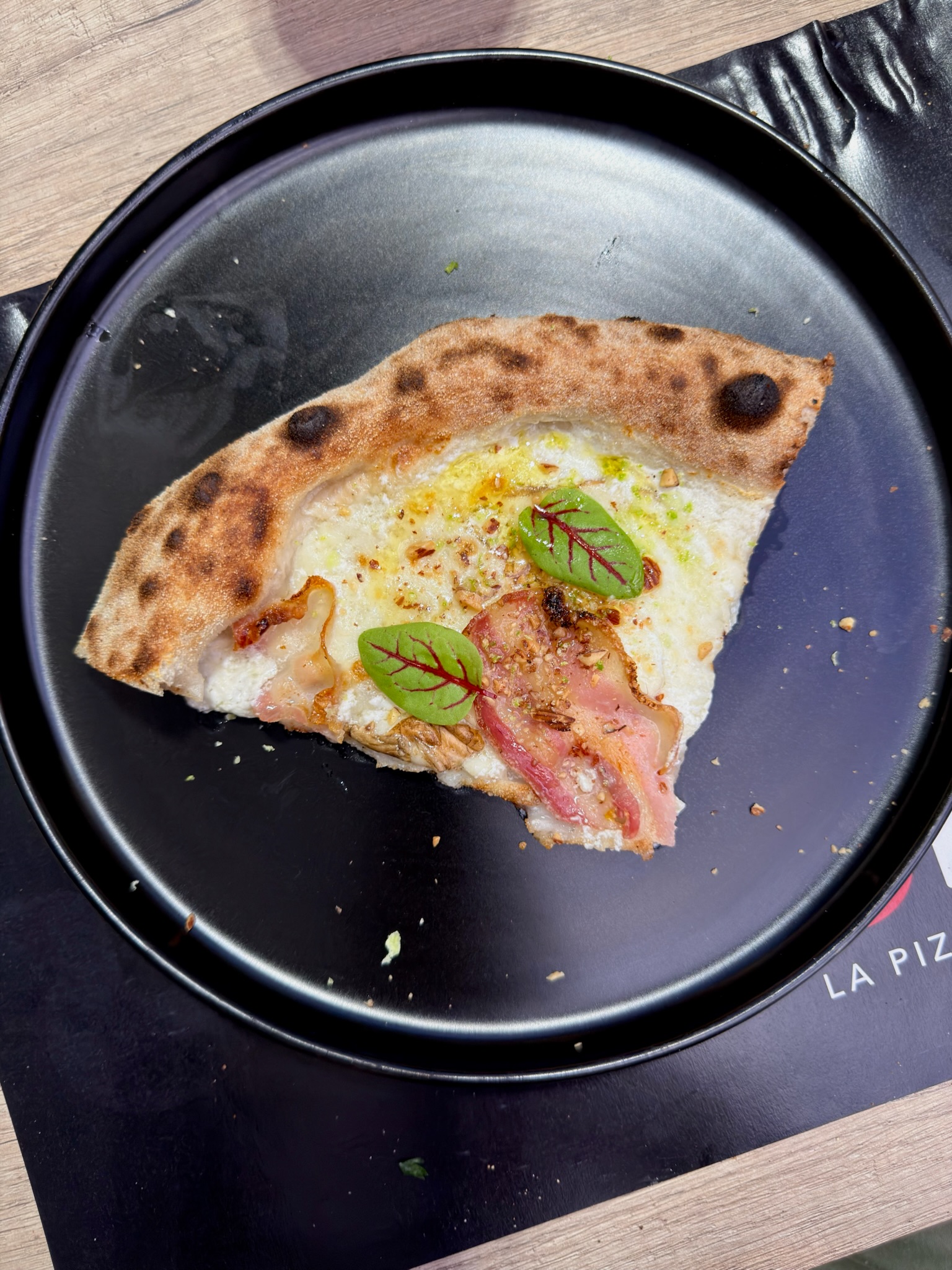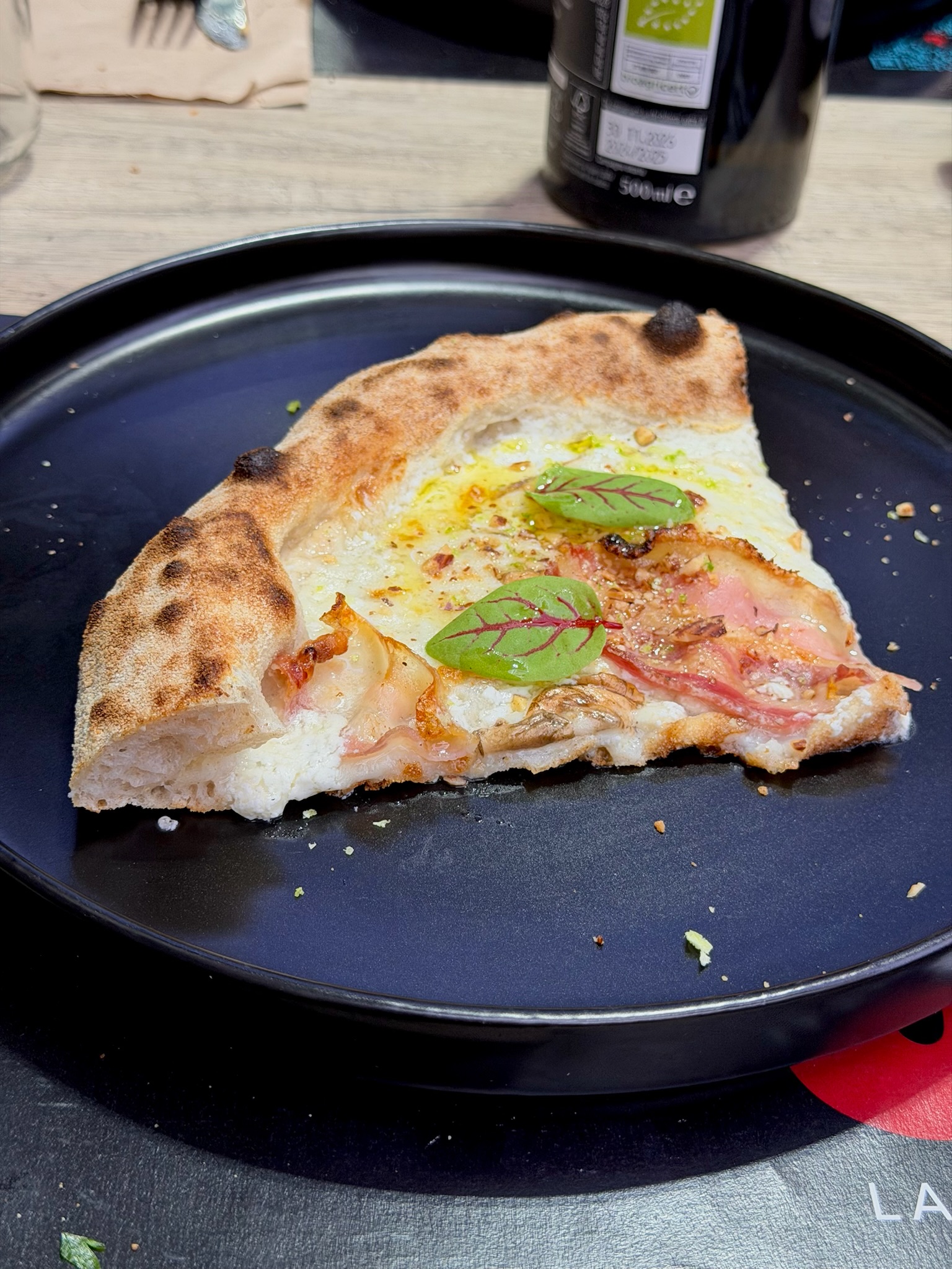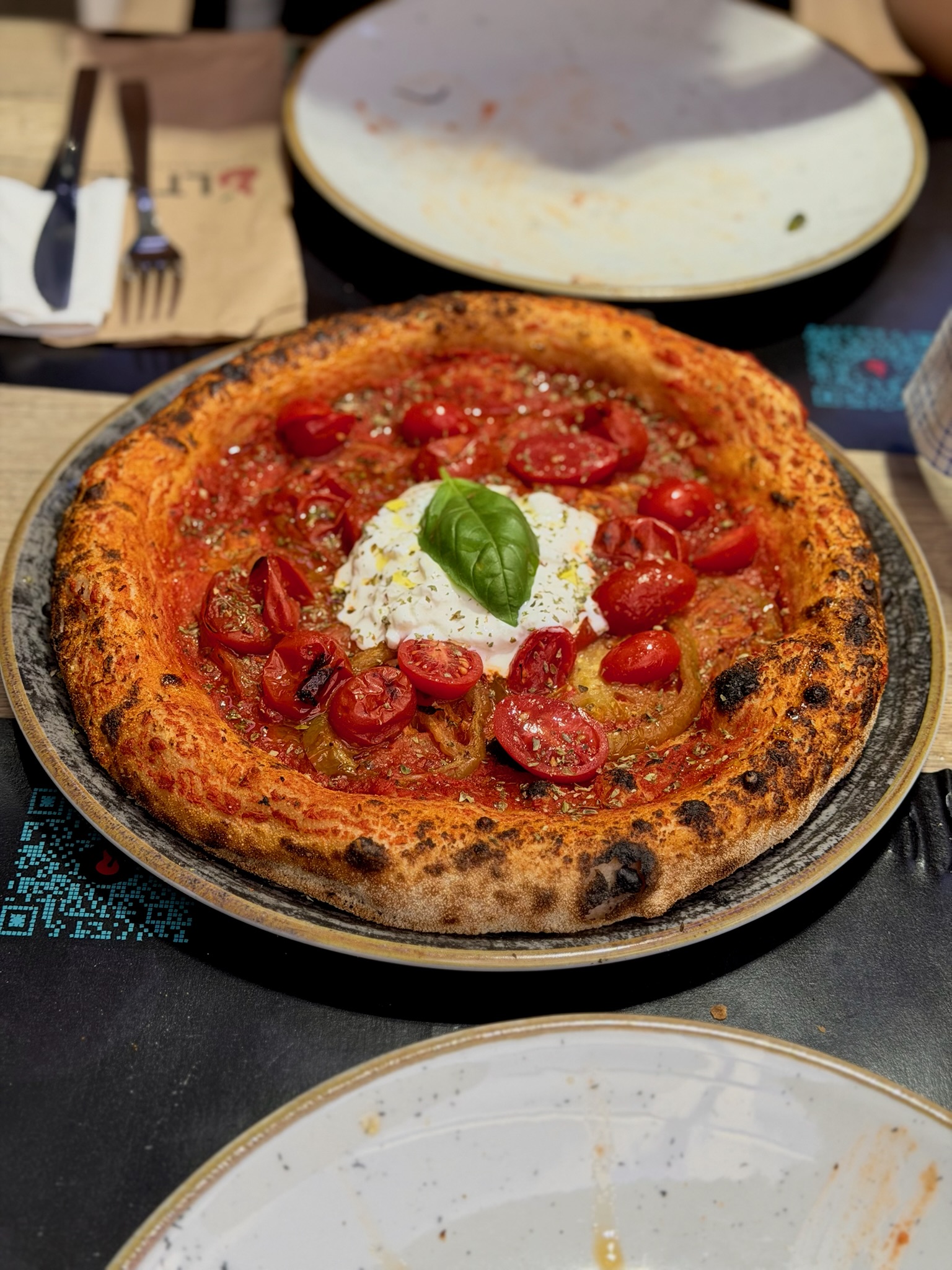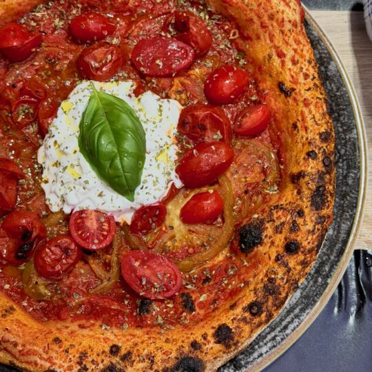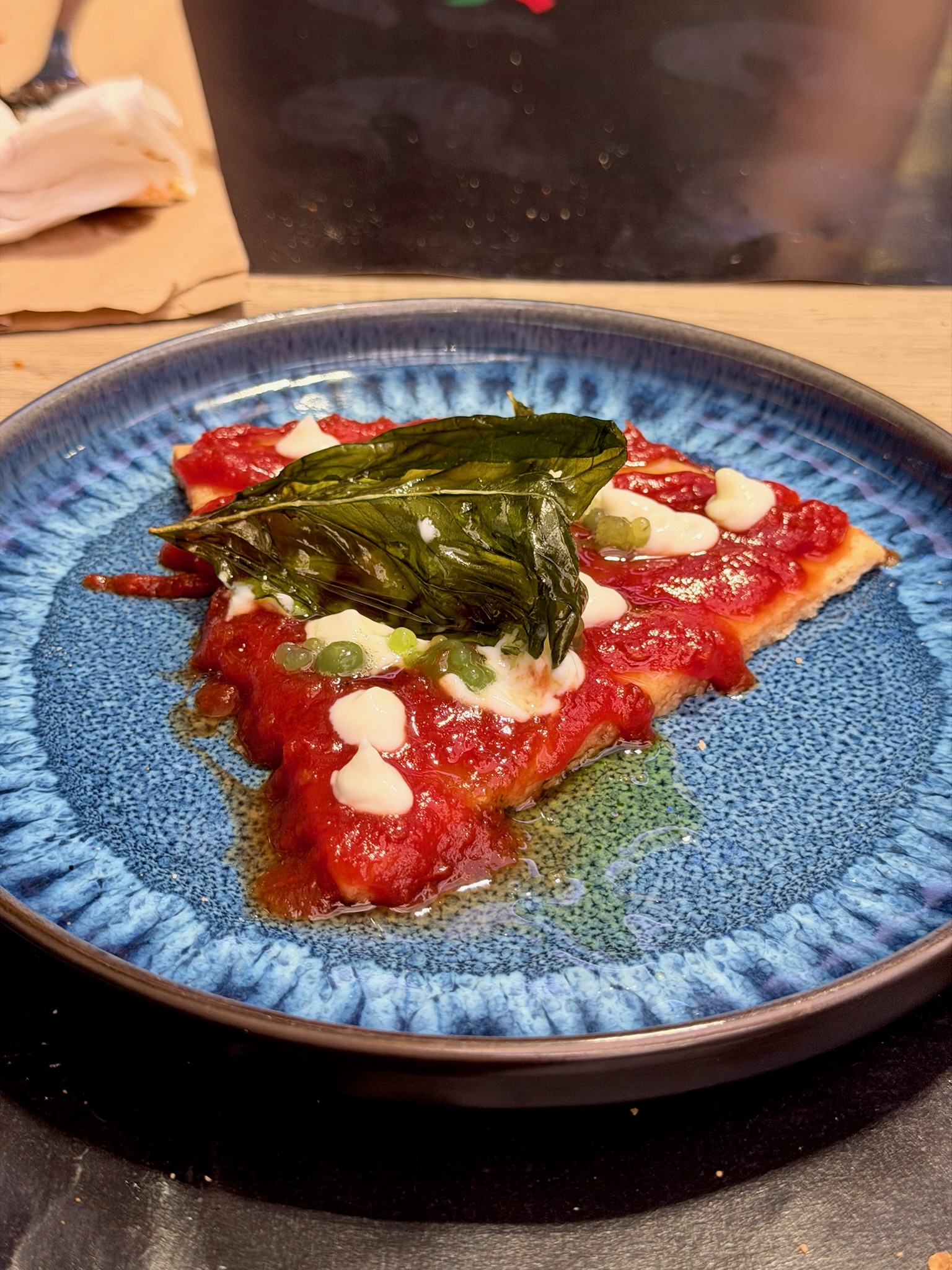 Al comando pizza c’è Ruggiero Francavilla che propone una pizza contemporanea, taglia M, con cornicione pronunciato. Il menu prevede antipasti, tra cui la Focaccia Barese fatta con pomodoro, olio e origano; pizze classiche come nel caso della Margherita fatta con pomodoro san marzano, fiordilatte, basilico e olio evo; e piatti classici pugliesi reinterpretati sul disco di pasta come la Patate Riso e Cozze fatta con fiordilatte, crema di patate in cottura, cozze gratinate, all’uscita chips di riso soffiato prezzemolo tritato, e aria di latte di mozzarella. Altre pizze degne di nota sono la Speck-tacolo fatta con fiordilatte e crema di cavolo viola in cottura, datterino giallo, speck d’anatra, mandorla di Avola affumicata all’uscita; e La Bella Affumicata fatta con provola di bufala affumicata campana, pancetta tesa affumicata, mandorla di Avola affumicata, yogurt magro affumicato, zest di lime e olio evo. Anche i dolci sono presenti tra cui la Margherita Dolce, fatta con base di frolla, marmellata di pomodoro, ricotta dolce e basilico caramelizzato al cioccolato.
