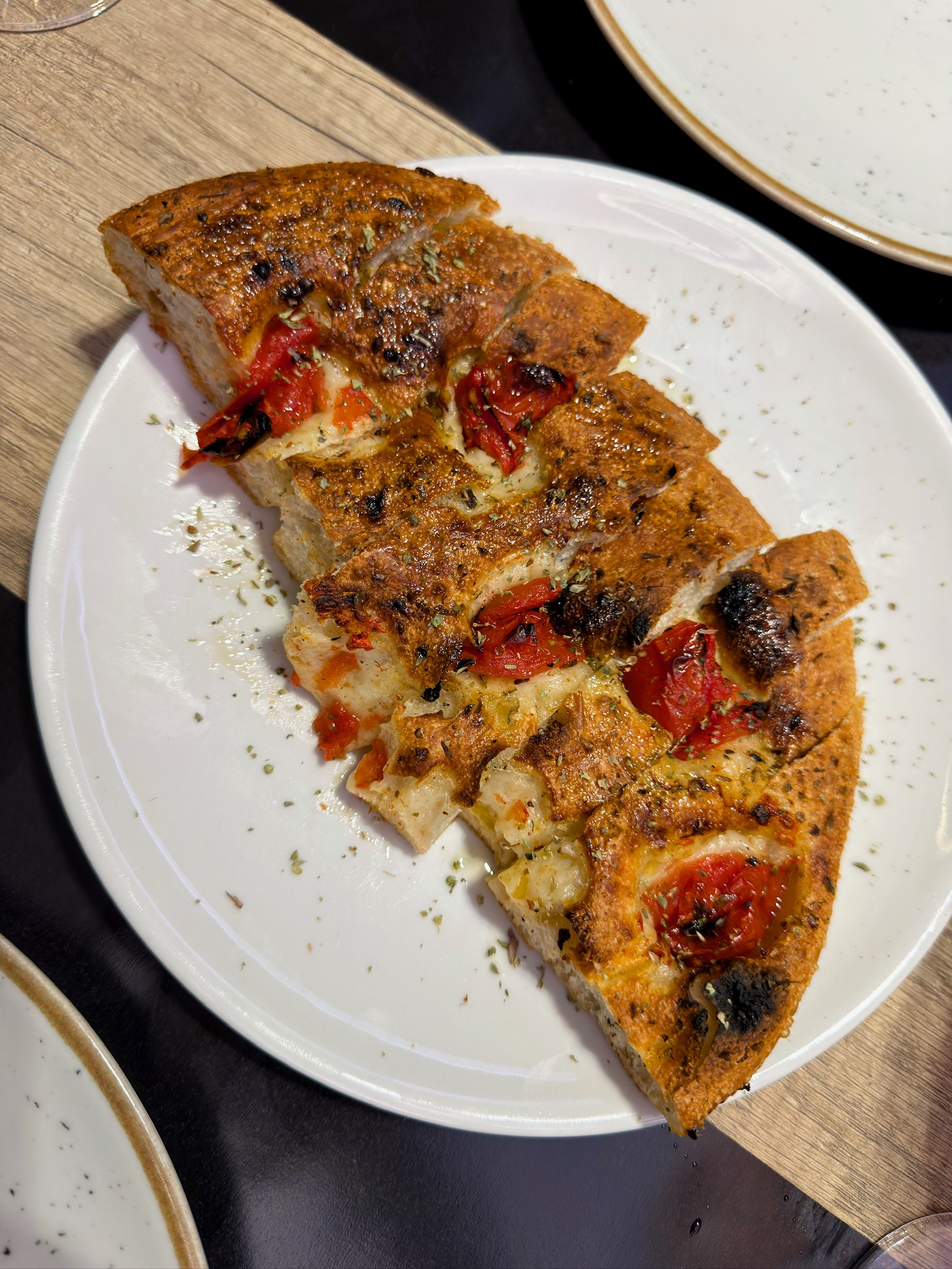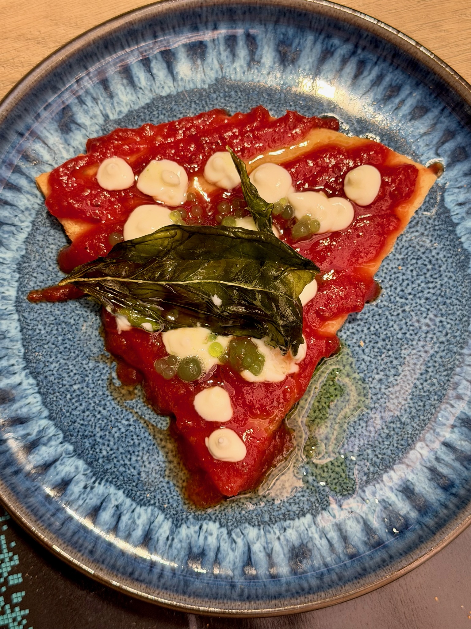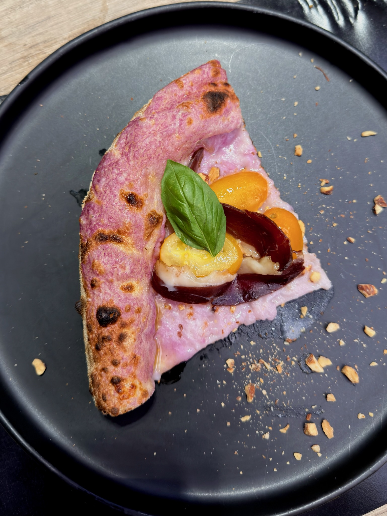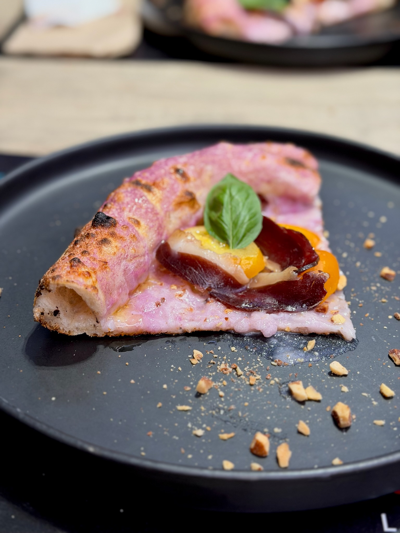 Al comando pizza c’è Ruggiero Francavilla che propone una pizza contemporanea, taglia M, con cornicione pronunciato. Il menu prevede antipasti, tra cui la Focaccia Barese fatta con pomodoro, olio e origano; pizze classiche come nel caso della Margherita fatta con pomodoro san marzano, fiordilatte, basilico e olio evo; e piatti classici pugliesi reinterpretati sul disco di pasta come la Patate Riso e Cozze fatta con fiordilatte, crema di patate in cottura, cozze gratinate, all’uscita chips di riso soffiato prezzemolo tritato, e aria di latte di mozzarella. Altre pizze degne di nota sono la Speck-tacolo fatta con fiordilatte e crema di cavolo viola in cottura, datterino giallo, speck d’anatra, mandorla di Avola affumicata all’uscita; e La Bella Affumicata fatta con provola di bufala affumicata campana, pancetta tesa affumicata, mandorla di Avola affumicata, yogurt magro affumicato, zest di lime e olio evo. Anche i dolci sono presenti tra cui la Margherita Dolce, fatta con base di frolla, marmellata di pomodoro, ricotta dolce e basilico caramelizzato al cioccolato.