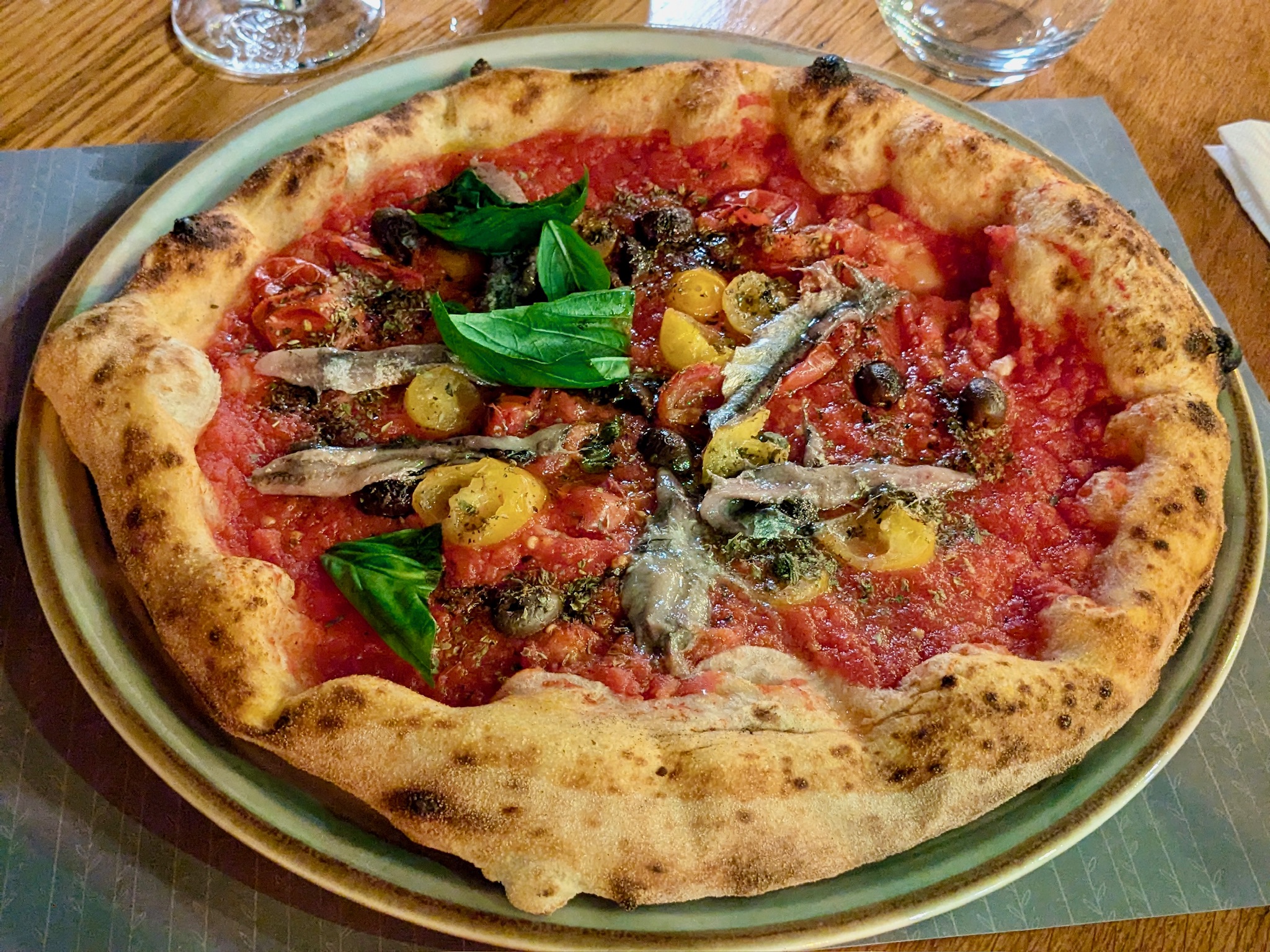 La proposta comprende antipasti, una selezione di margherite, pizze in doppia cottura, pizze classiche, calzoni e dessert. Tra le margherite degna di nota è la Margherita Radici fatta con 4 tipi di pomodoro cotti al forno a legna, bufala campana DOP, parmigiano e pecorino in cottura. Tra le pizze classiche meritano una menzione la Provenzale Radici fatta con 4 tipi di pomodoro cotti al forno a legna a bassa temperatura, alici del Cantabrico, olive taggiasche, capperi di salina, origano selvatico di salina; e la Pesto di Sera fatta con pesto di basilico, noci e pecorino, provola di Agerola, salsiccia di Castelpoto e datterini gialli. Altre pizze da citare sono la Capricciosa Radici fatta con pomodoro pelato a mano, fiordilatte di Agerola, prosciutto cotto artigianale, funghi champignon, salame Napoli artigianale, formaggi misti, carciofini sott’olio; e il Calzone Sannita fatto con ricotta di Paestum, provola di Agerola, salame dei Colli Sanniti, pecorino romano, basilico e pepe.