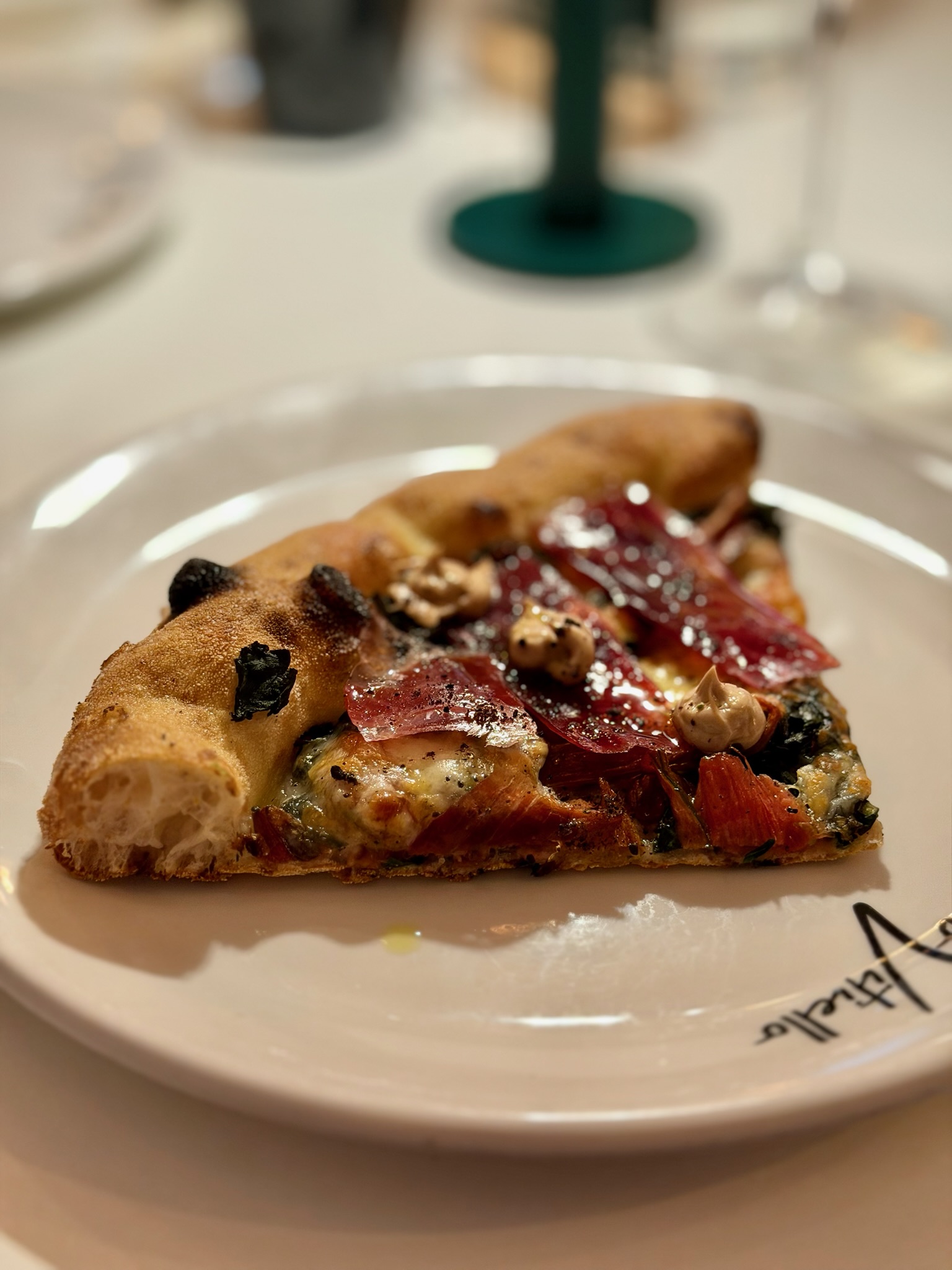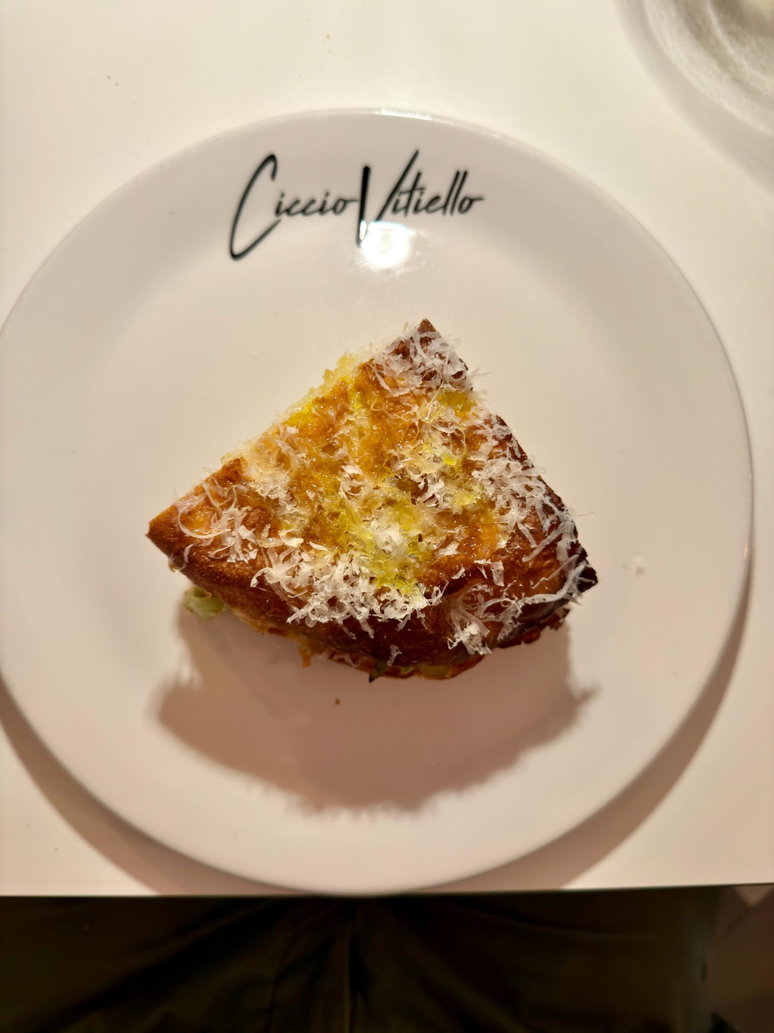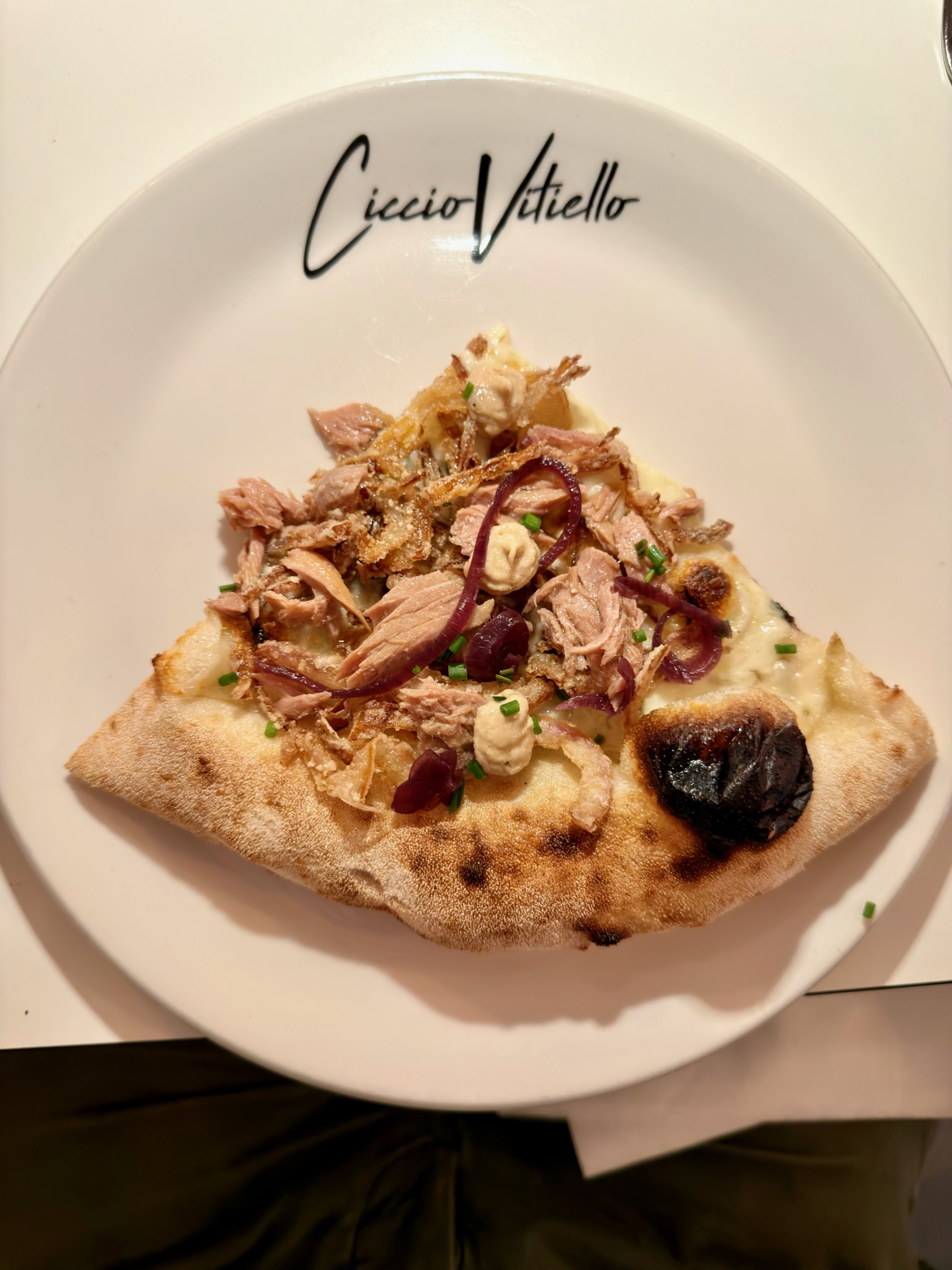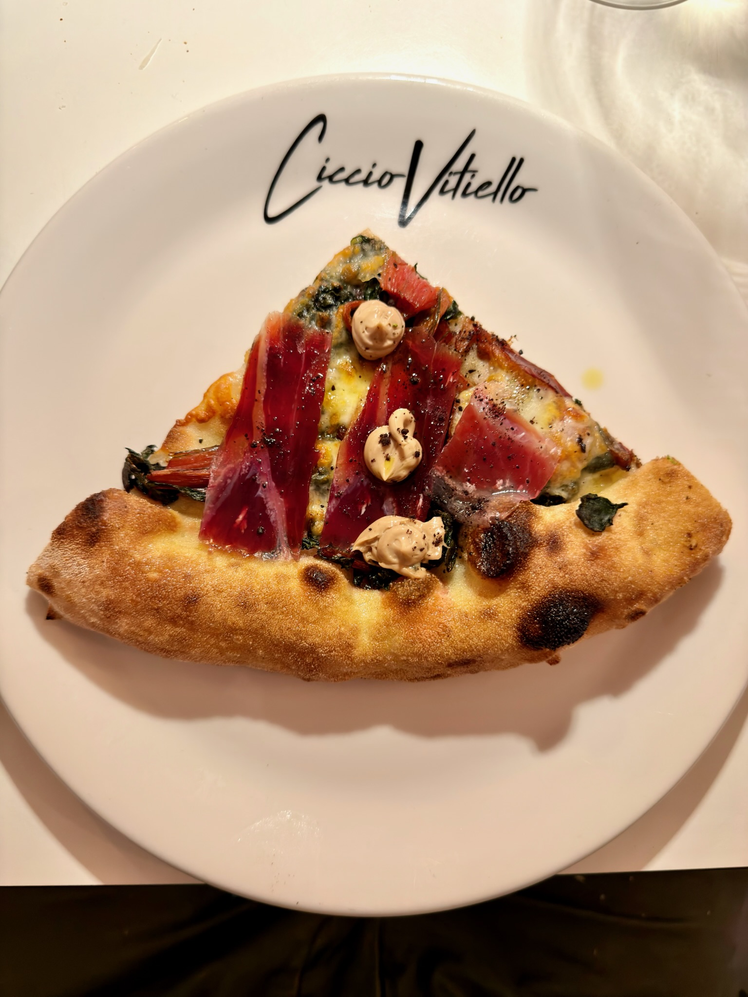 La proposta comprende antipasti fritti, una serie di pizze tonde classiche (realizzata con farine selezionate da Ciccio, con biga al 100%) e qualche impasto alternativo come nel caso del padellino P.M., fatto con fiordilatte baciato dalla bufala, lattuga da idroponica, mayo al limone, mortadella d’asino, provolone del monaco in doppia consistenza ed erba cipollina. Tra le pizze tonde classiche non possiamo non citare l’iconica pizza Recensione Negativa, fatta con mozzarella di bufala, pomodorino Corbara, pesto di basilico, pepe di sichuan, ingrediente segreto ed olio evo aromatizzato al limone; seguita dalla Tonno e Cipolla fatta con provola, croccante di cipolla, cipolla rossa marinata in Pallagrello nero e miele millefiori, salsa tonnata, ventresca di tonno alletterato ed erba cipollina. Per quanto riguarda i dolci, spicca il trancio Max, padellino super morbido con pellecchiella del vesuvio e cioccolato bianco, ganache al cioccolato bianco con vaniglia bourbon e mandorle tostate al sale maldon. In menu è presente inoltre la possibilità di intraprendere il ‘Ciccio Pizza Tour’, un viaggio ideale nella pizza composto da cinque portate che raccontano un’idea di pizza che evolve, si contamina, si libera dagli schemi senza mai perdere il legame con la sua origine.