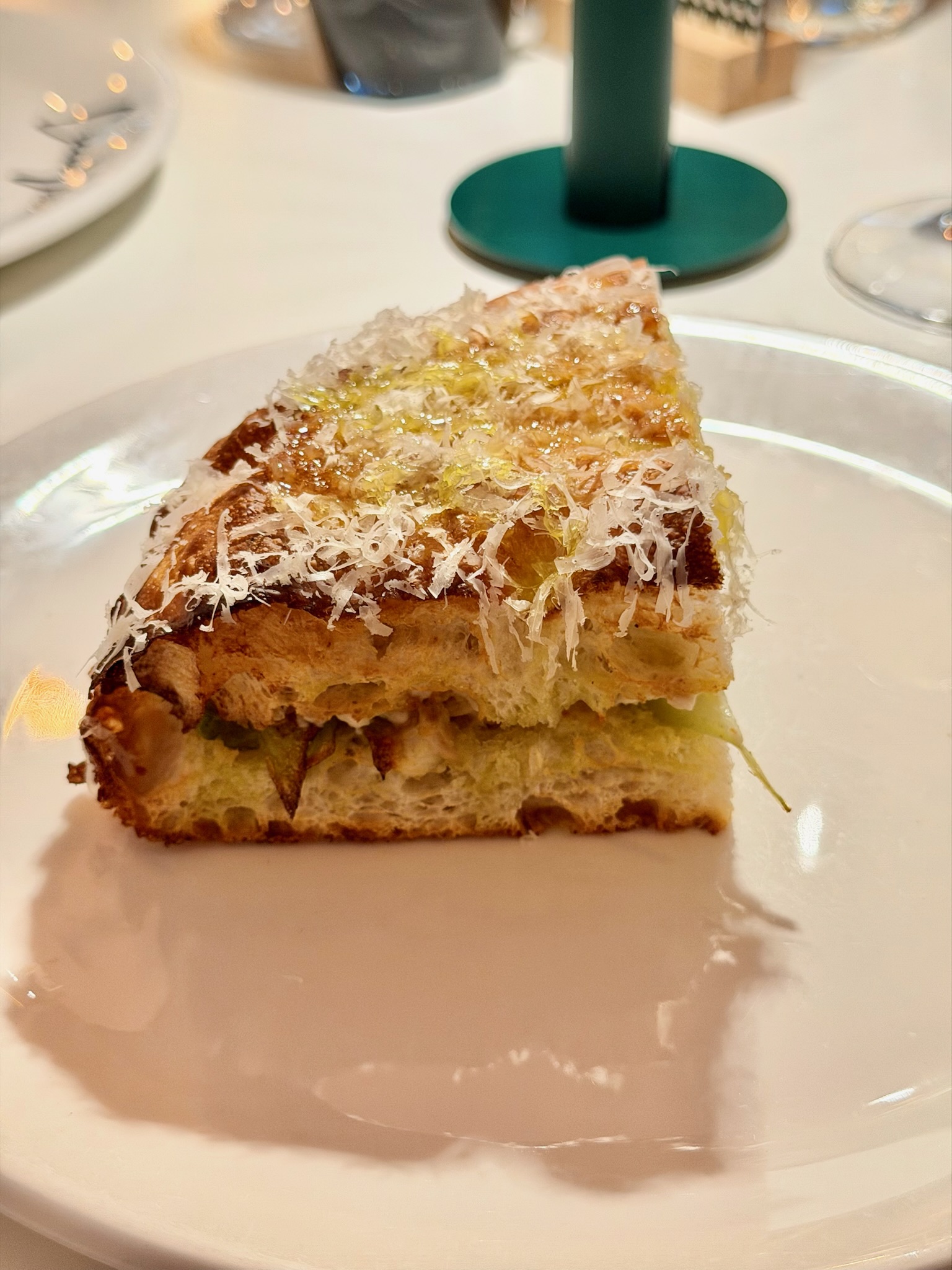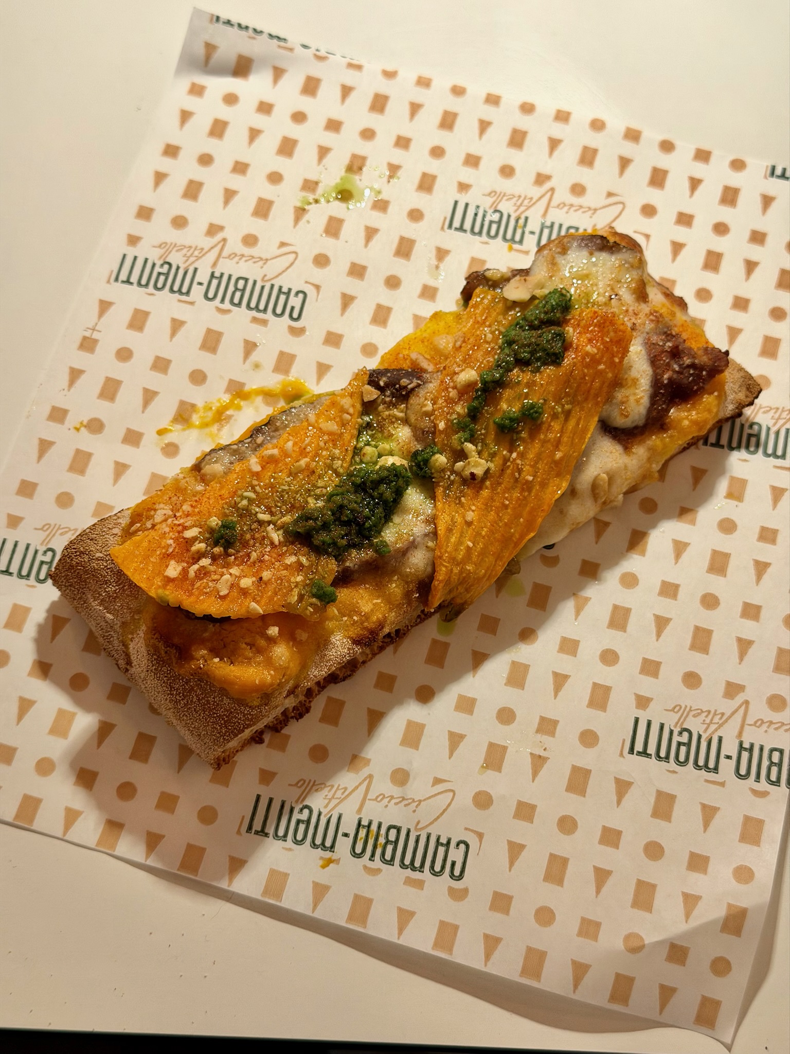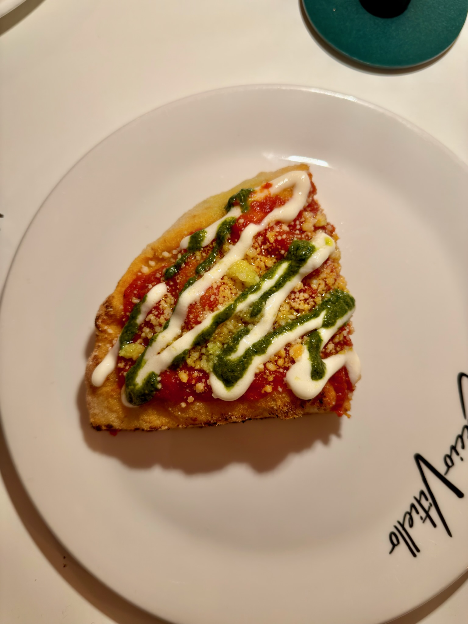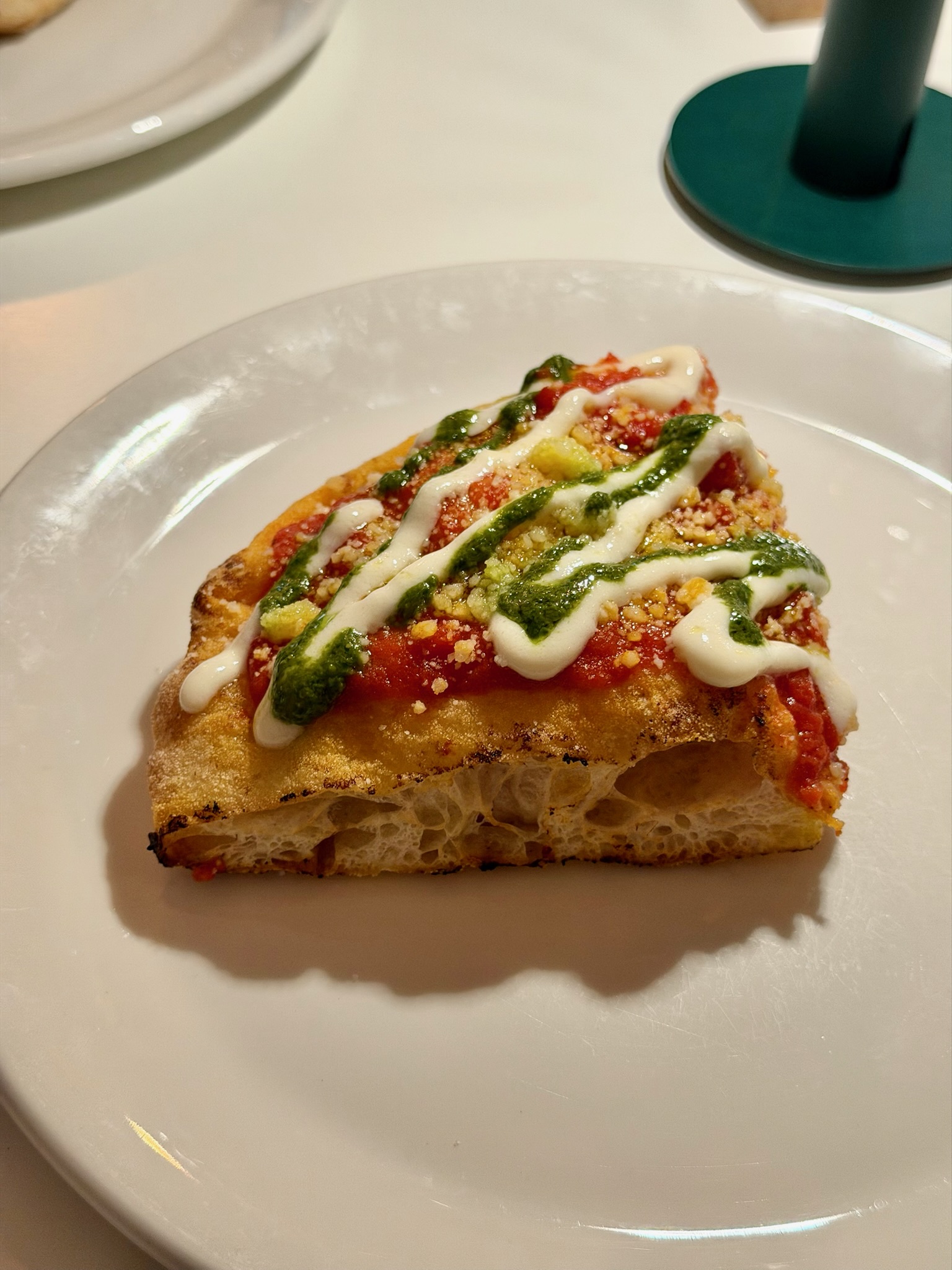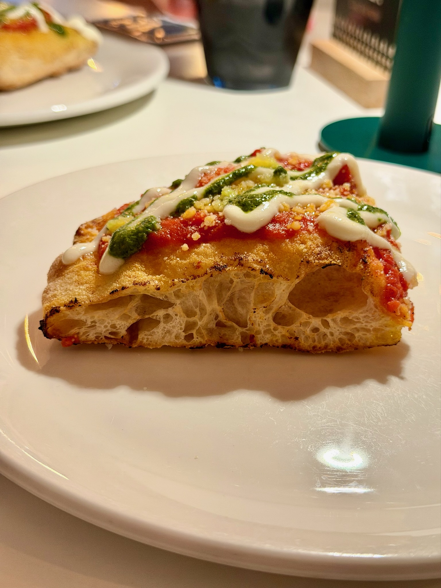 La proposta comprende antipasti fritti, una serie di pizze tonde classiche (realizzata con farine selezionate da Ciccio, con biga al 100%) e qualche impasto alternativo come nel caso del padellino P.M., fatto con fiordilatte baciato dalla bufala, lattuga da idroponica, mayo al limone, mortadella d’asino, provolone del monaco in doppia consistenza ed erba cipollina. Tra le pizze tonde classiche non possiamo non citare l’iconica pizza Recensione Negativa, fatta con mozzarella di bufala, pomodorino Corbara, pesto di basilico, pepe di sichuan, ingrediente segreto ed olio evo aromatizzato al limone; seguita dalla Tonno e Cipolla fatta con provola, croccante di cipolla, cipolla rossa marinata in Pallagrello nero e miele millefiori, salsa tonnata, ventresca di tonno alletterato ed erba cipollina. Per quanto riguarda i dolci, spicca il trancio Max, padellino super morbido con pellecchiella del vesuvio e cioccolato bianco, ganache al cioccolato bianco con vaniglia bourbon e mandorle tostate al sale maldon. In menu è presente inoltre la possibilità di intraprendere il ‘Ciccio Pizza Tour’, un viaggio ideale nella pizza composto da cinque portate che raccontano un’idea di pizza che evolve, si contamina, si libera dagli schemi senza mai perdere il legame con la sua origine.
