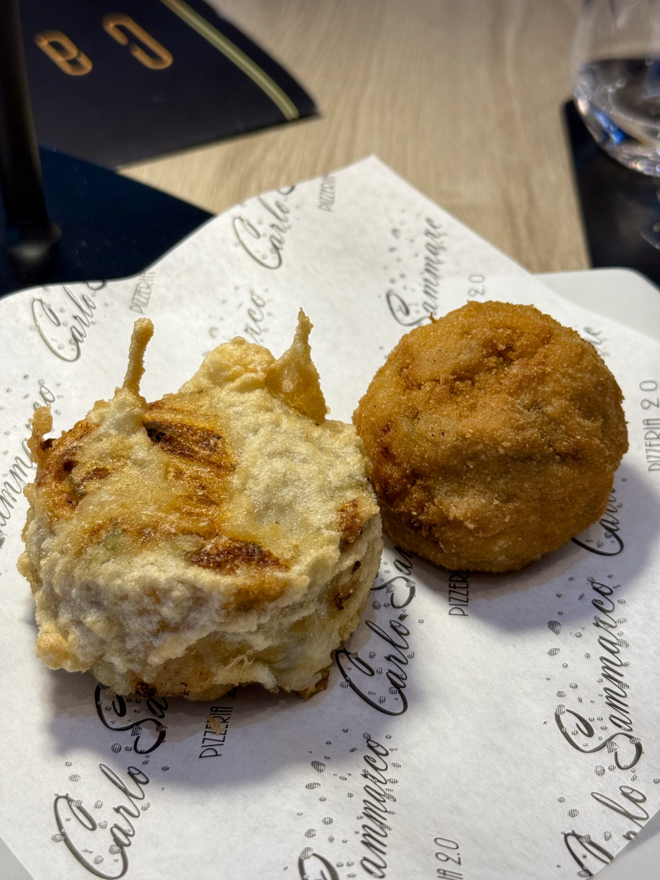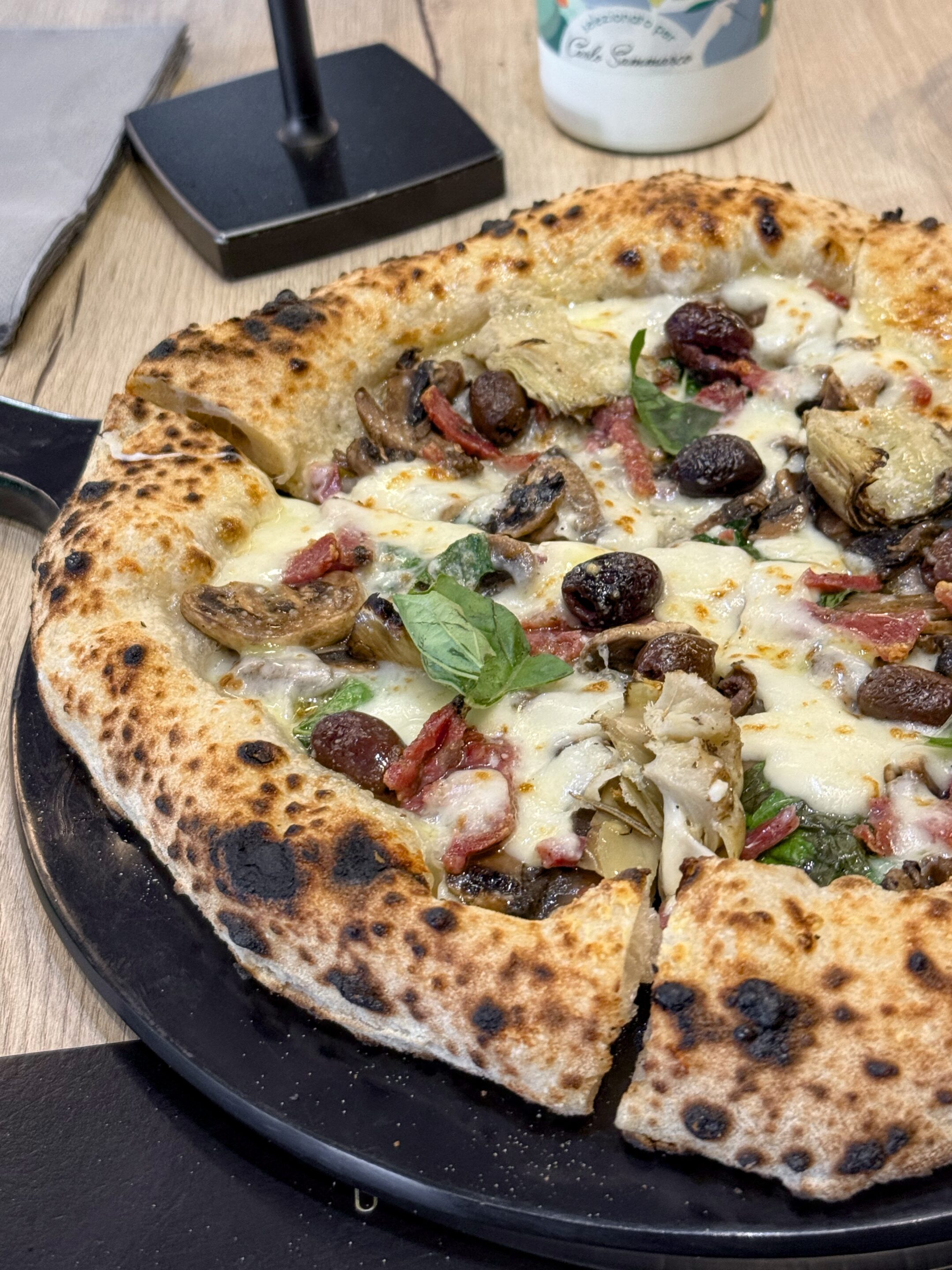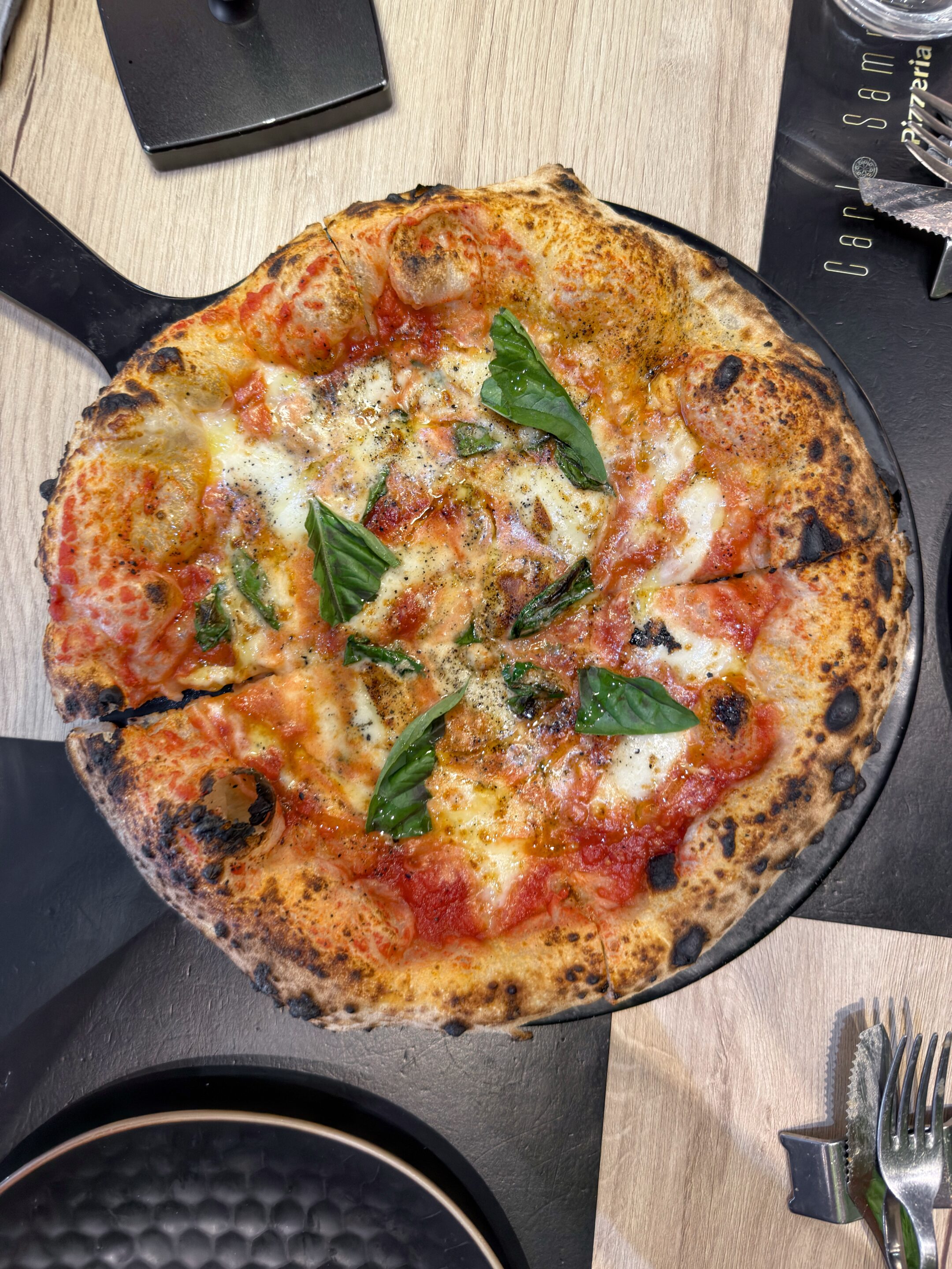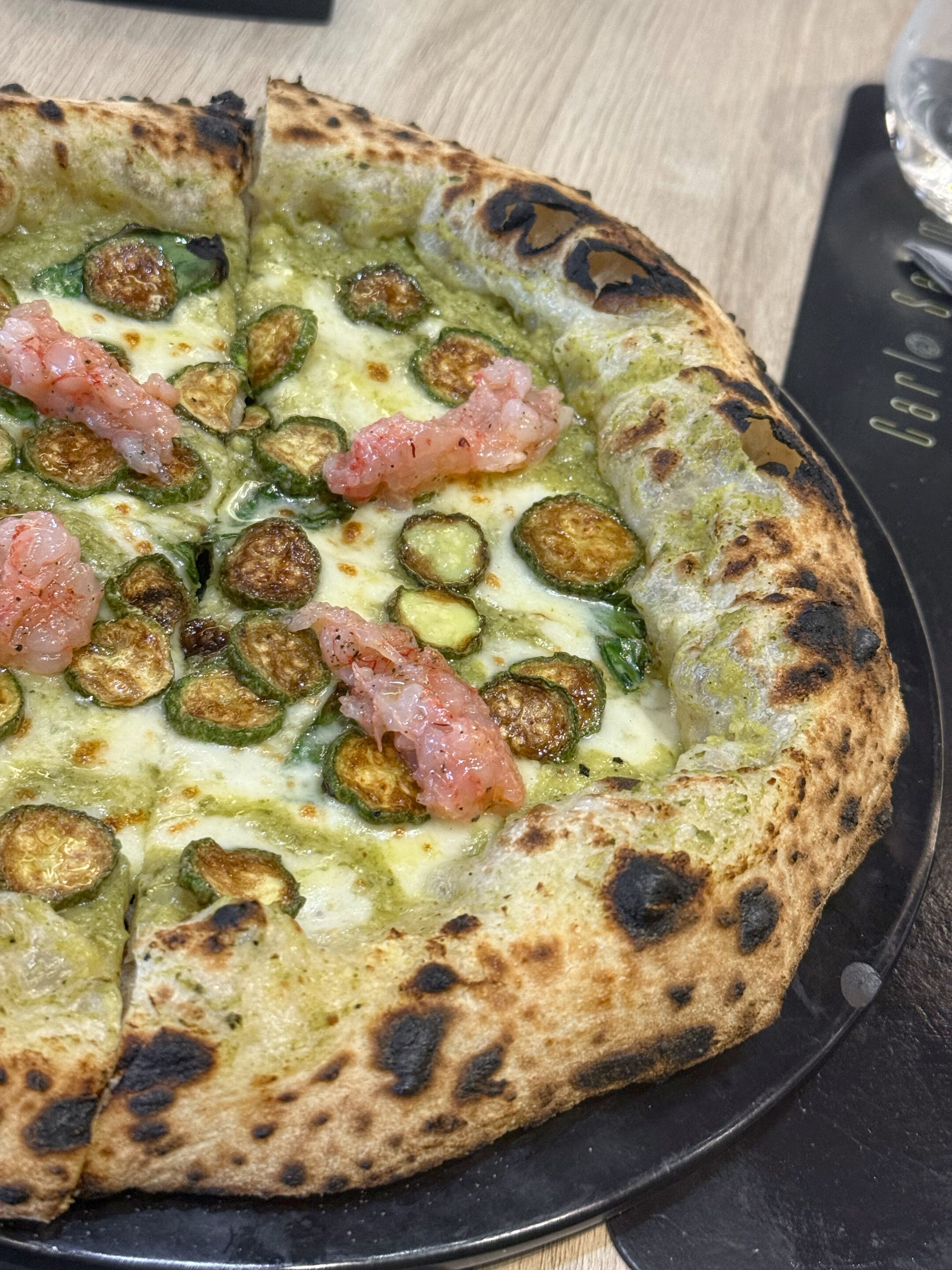 Per quanto riguarda la proposta in menu, non mancano le pizze tradizionali come nel caso della Provola e Pepe fatta con pomodoro, provola affumicata, pepe nero, basilico e olio evo; e la Capricciosa, in versione bianca, fatta con fiordilatte, carciofi, olive, funghi, salame, basilico e olio evo. Tra le pizze rivisitate da Carlo invece, degna di nota è la Nerano 2.0 fatta con vellutata di zucchine con il fiore, provolone del monaco, provola dei monti lattari, chips di zucchine fritte e tartare di gamberi rossi freschi. Infine, anche i fritti sono presenti tra cui la Frittatina Classica e l’Arancino Rosso fatto con riso al pomodoro, ripieno con ragù di suino, piselli, provola, parmigiano e pepe.