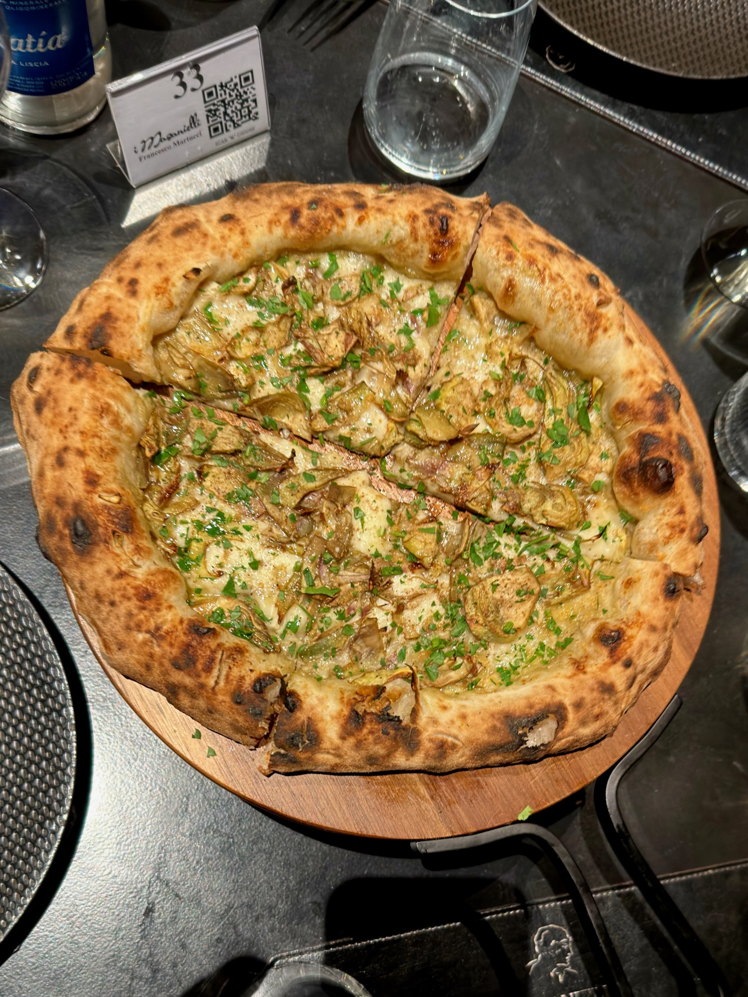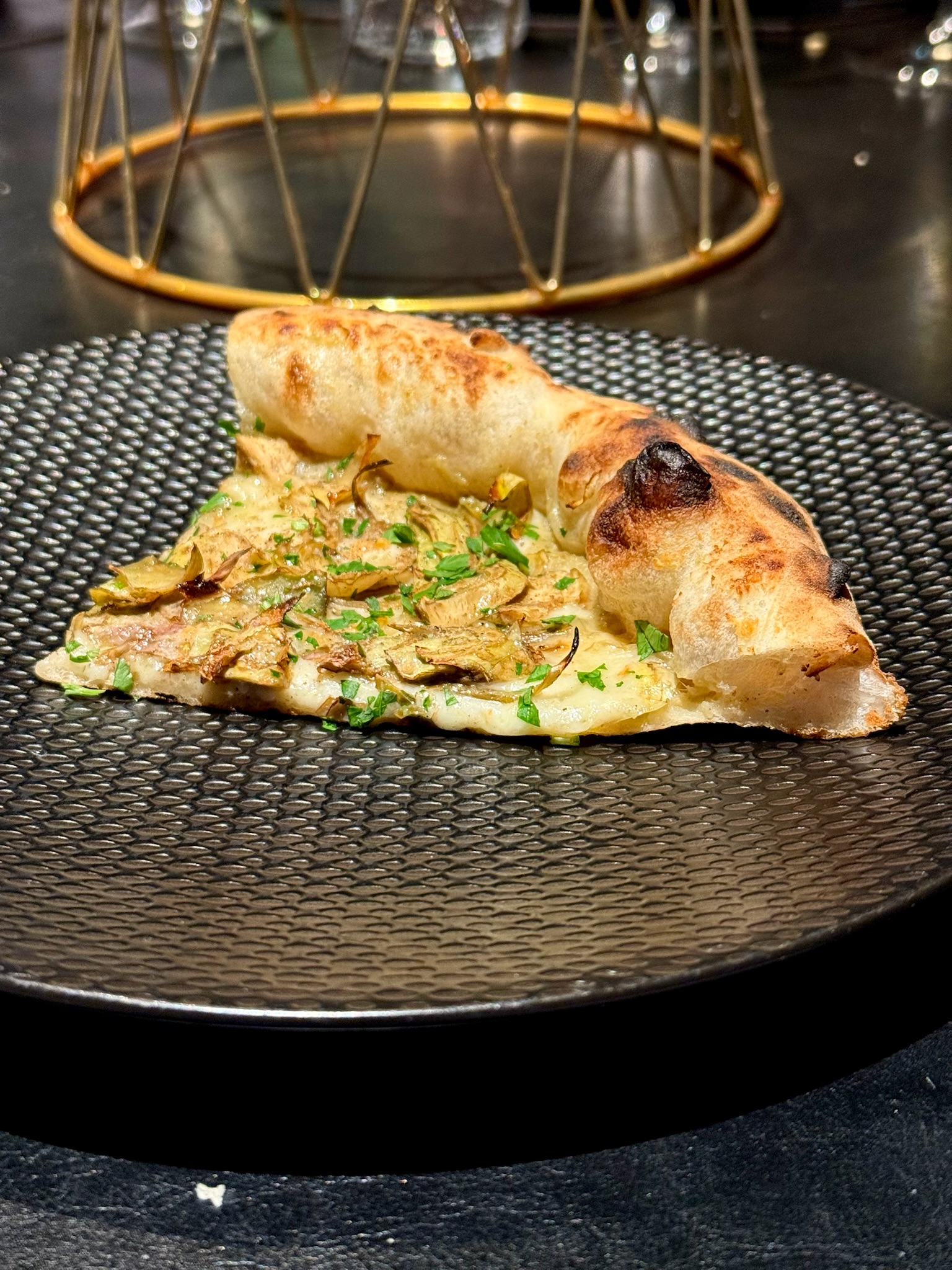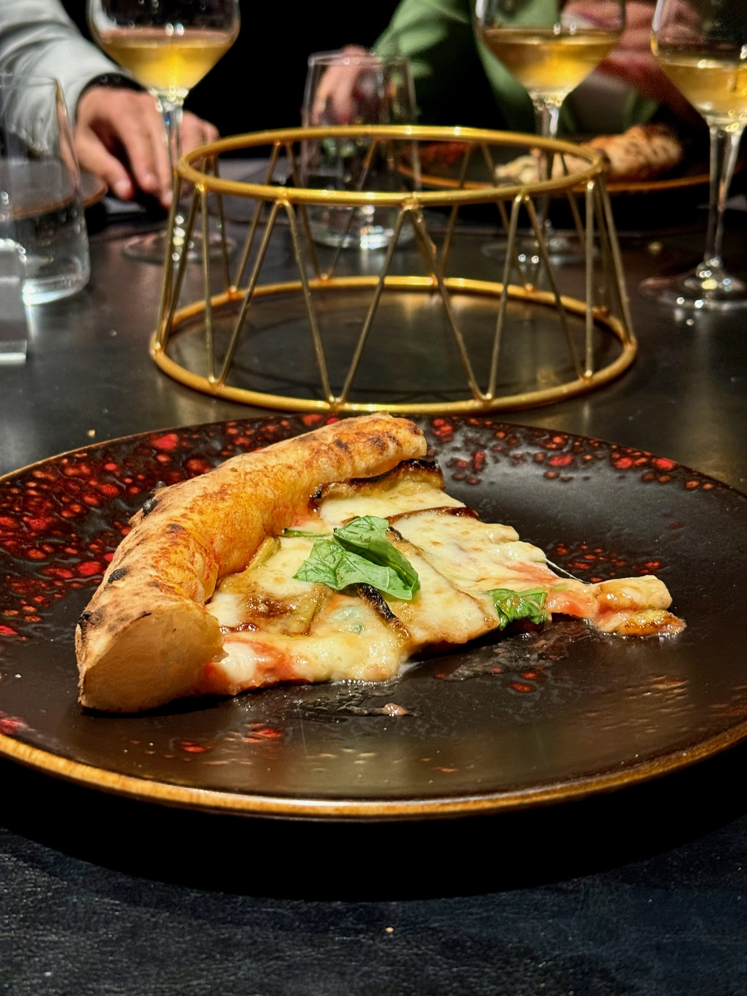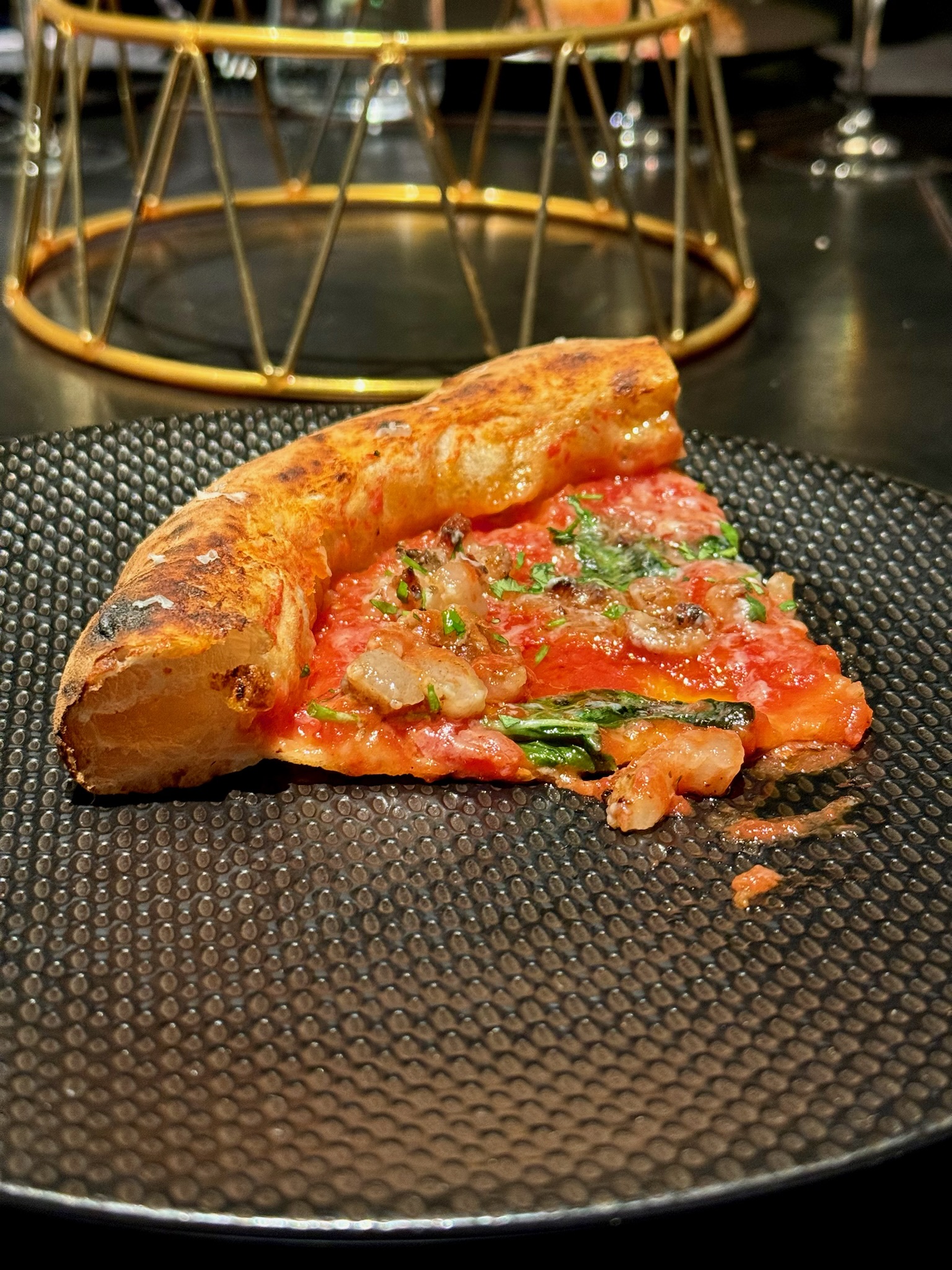 Molte le pizze proposte, dall’iconica Mani di Velluto fatta con crema di friarielli al latte di bufala, mozzarella di bufala campana DOP Fattorie Garofalo, salsiccia a punta di coltello di maiale di razza casertana, pecorino dei Monti Lattari gran riserva e olio evo; passando per la Marinara Atomica fatta con pomodoro San Marzano DOP cotto 12 ore, e in uscita pomodoro del piennolo secco, buccia di pomodoro croccante, maionese di pomodoro (senza uova, con latte di soia), origano di montagna, aglio dell’Ufita, pecorino dei Monti Lattari gran riserva e olio evo; fino alle pizze cotte a tre temperature tra cui Le 7 Consistenze Della Cipolla, fatta con cipolla in crema, fermentata, croccante, bruciata, maionese di cipolla (senza uova, con latte di soia), gel di cipolla, confettura di cipolla e fiordilatte.