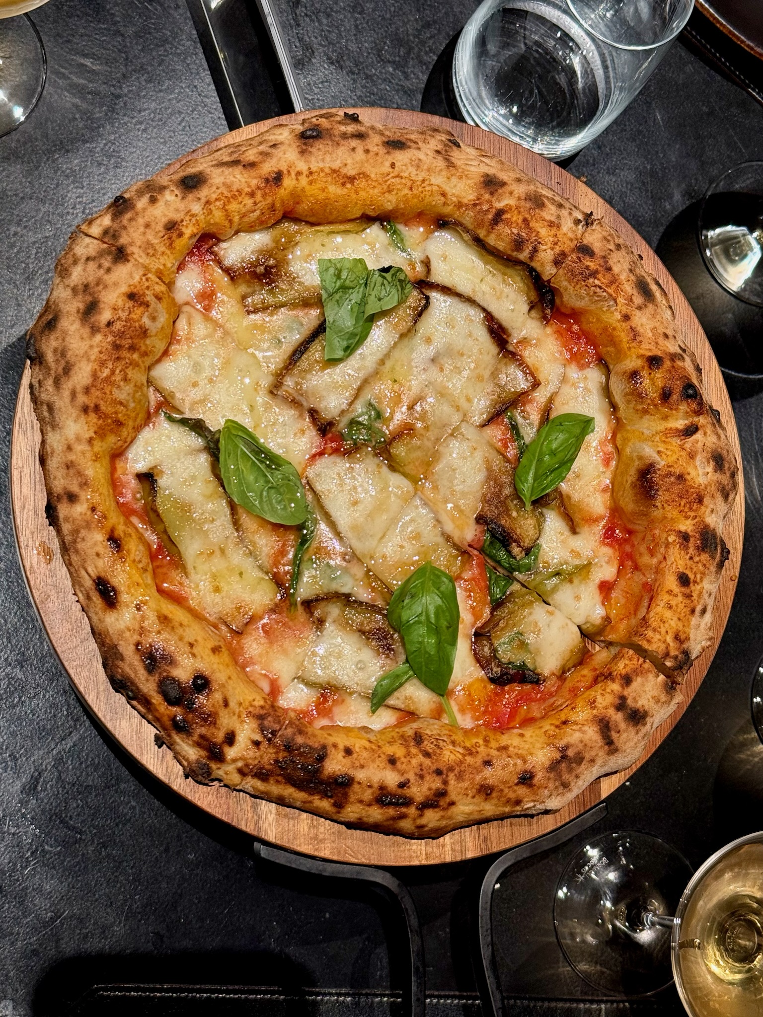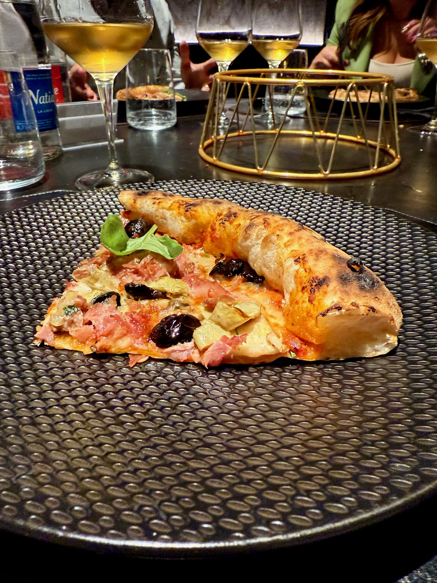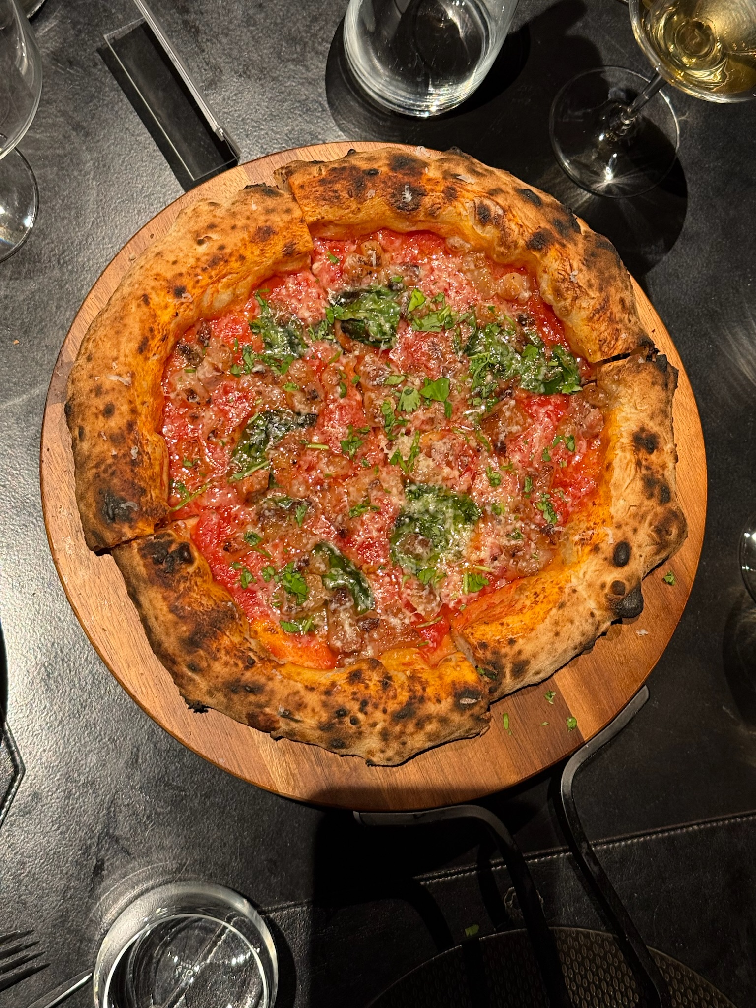 Molte le pizze proposte, dall’iconica Mani di Velluto fatta con crema di friarielli al latte di bufala, mozzarella di bufala campana DOP Fattorie Garofalo, salsiccia a punta di coltello di maiale di razza casertana, pecorino dei Monti Lattari gran riserva e olio evo; passando per la Marinara Atomica fatta con pomodoro San Marzano DOP cotto 12 ore, e in uscita pomodoro del piennolo secco, buccia di pomodoro croccante, maionese di pomodoro (senza uova, con latte di soia), origano di montagna, aglio dell’Ufita, pecorino dei Monti Lattari gran riserva e olio evo; fino alle pizze cotte a tre temperature tra cui Le 7 Consistenze Della Cipolla, fatta con cipolla in crema, fermentata, croccante, bruciata, maionese di cipolla (senza uova, con latte di soia), gel di cipolla, confettura di cipolla e fiordilatte.