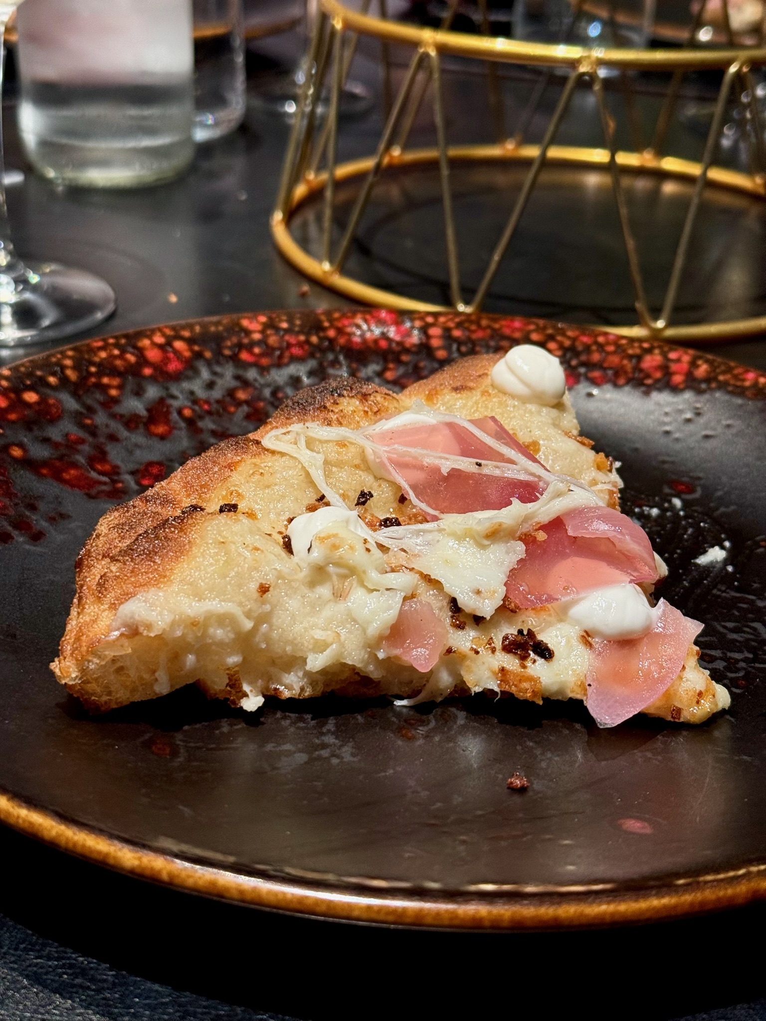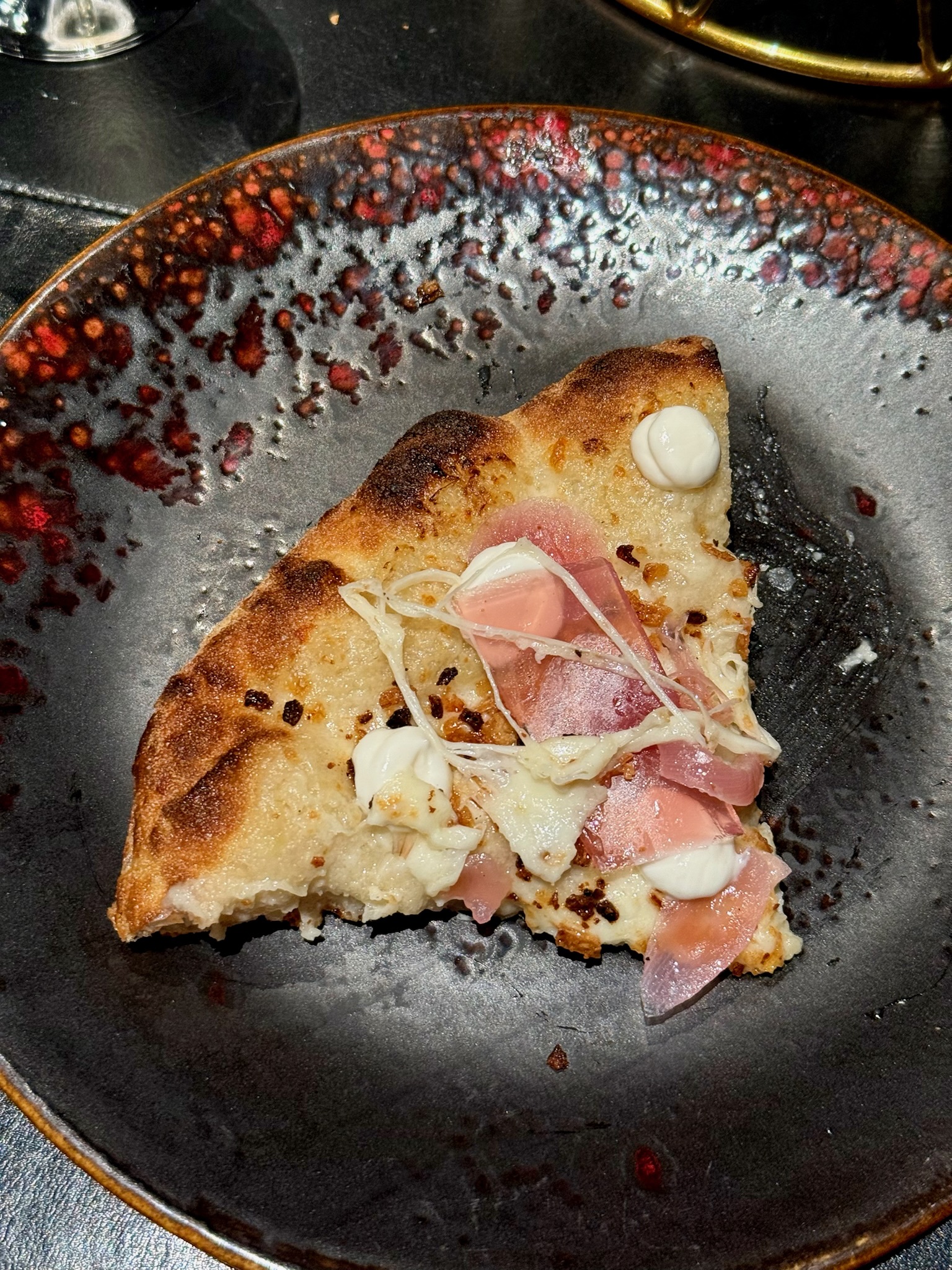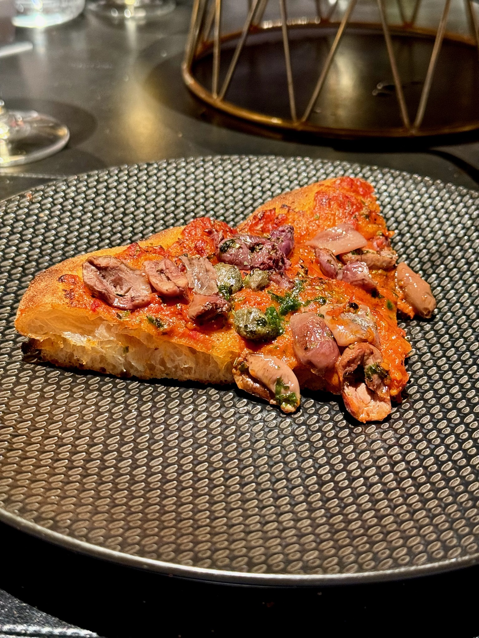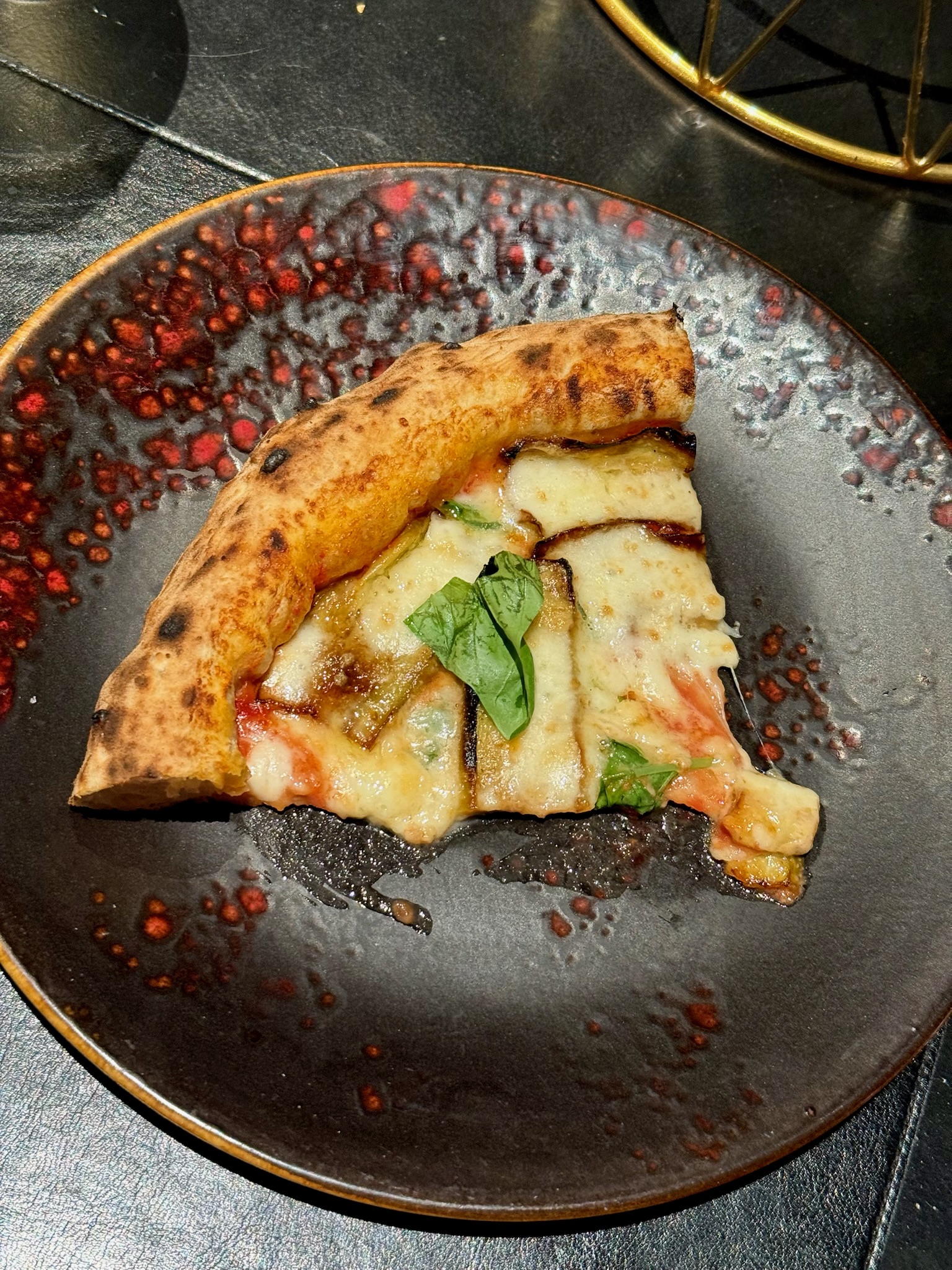 Molte le pizze proposte, dall’iconica Mani di Velluto fatta con crema di friarielli al latte di bufala, mozzarella di bufala campana DOP Fattorie Garofalo, salsiccia a punta di coltello di maiale di razza casertana, pecorino dei Monti Lattari gran riserva e olio evo; passando per la Marinara Atomica fatta con pomodoro San Marzano DOP cotto 12 ore, e in uscita pomodoro del piennolo secco, buccia di pomodoro croccante, maionese di pomodoro (senza uova, con latte di soia), origano di montagna, aglio dell’Ufita, pecorino dei Monti Lattari gran riserva e olio evo; fino alle pizze cotte a tre temperature tra cui Le 7 Consistenze Della Cipolla, fatta con cipolla in crema, fermentata, croccante, bruciata, maionese di cipolla (senza uova, con latte di soia), gel di cipolla, confettura di cipolla e fiordilatte.