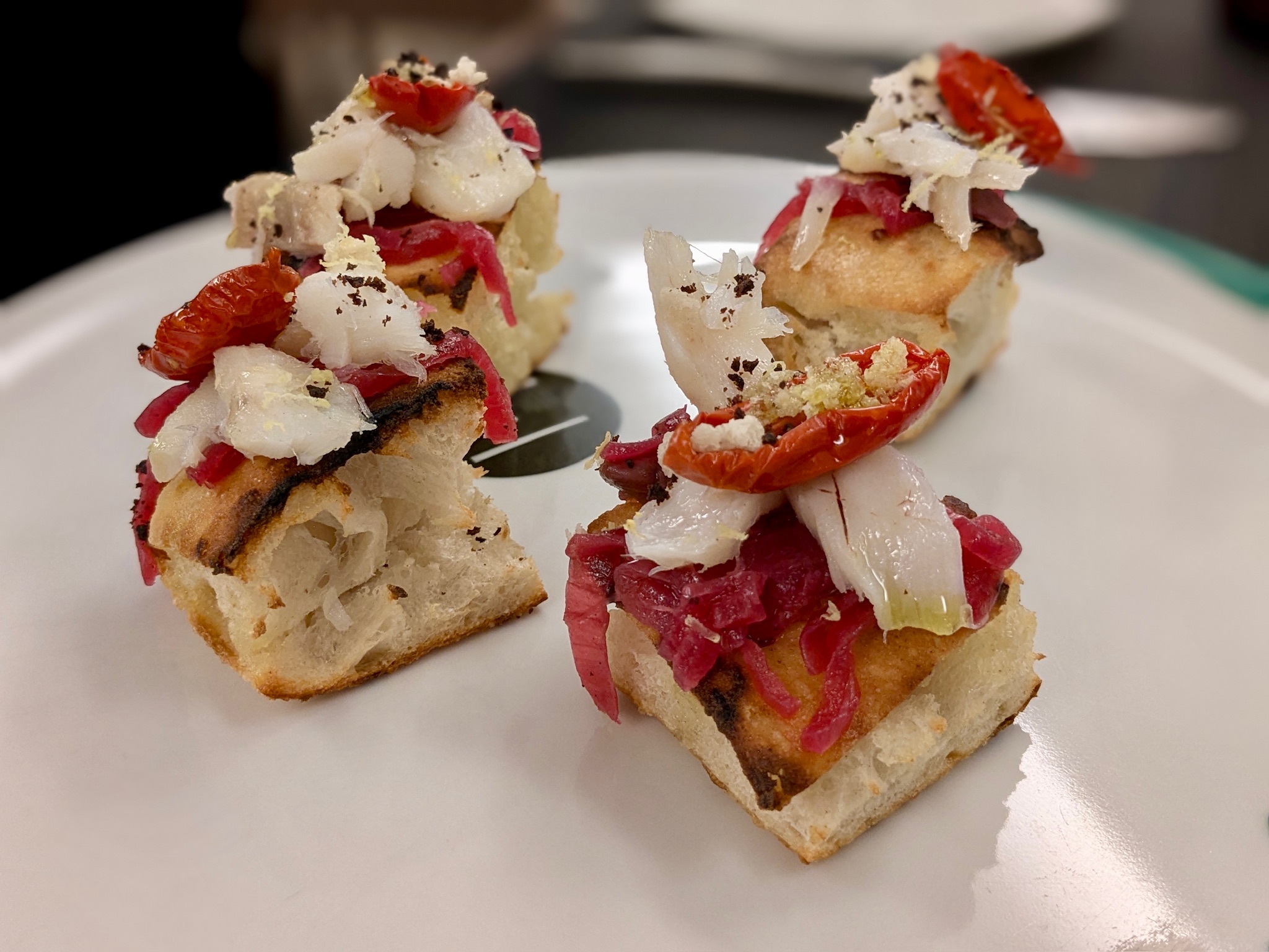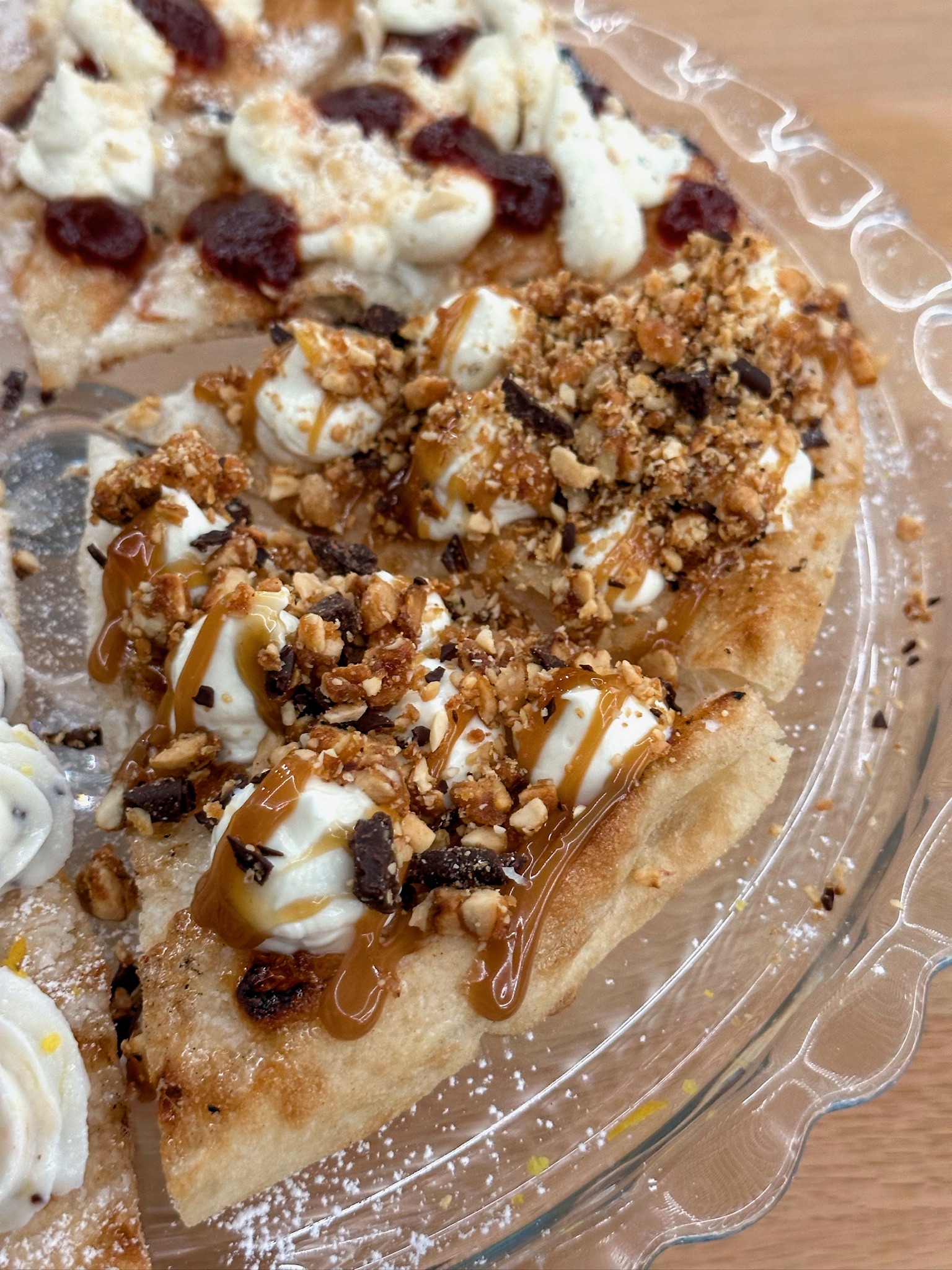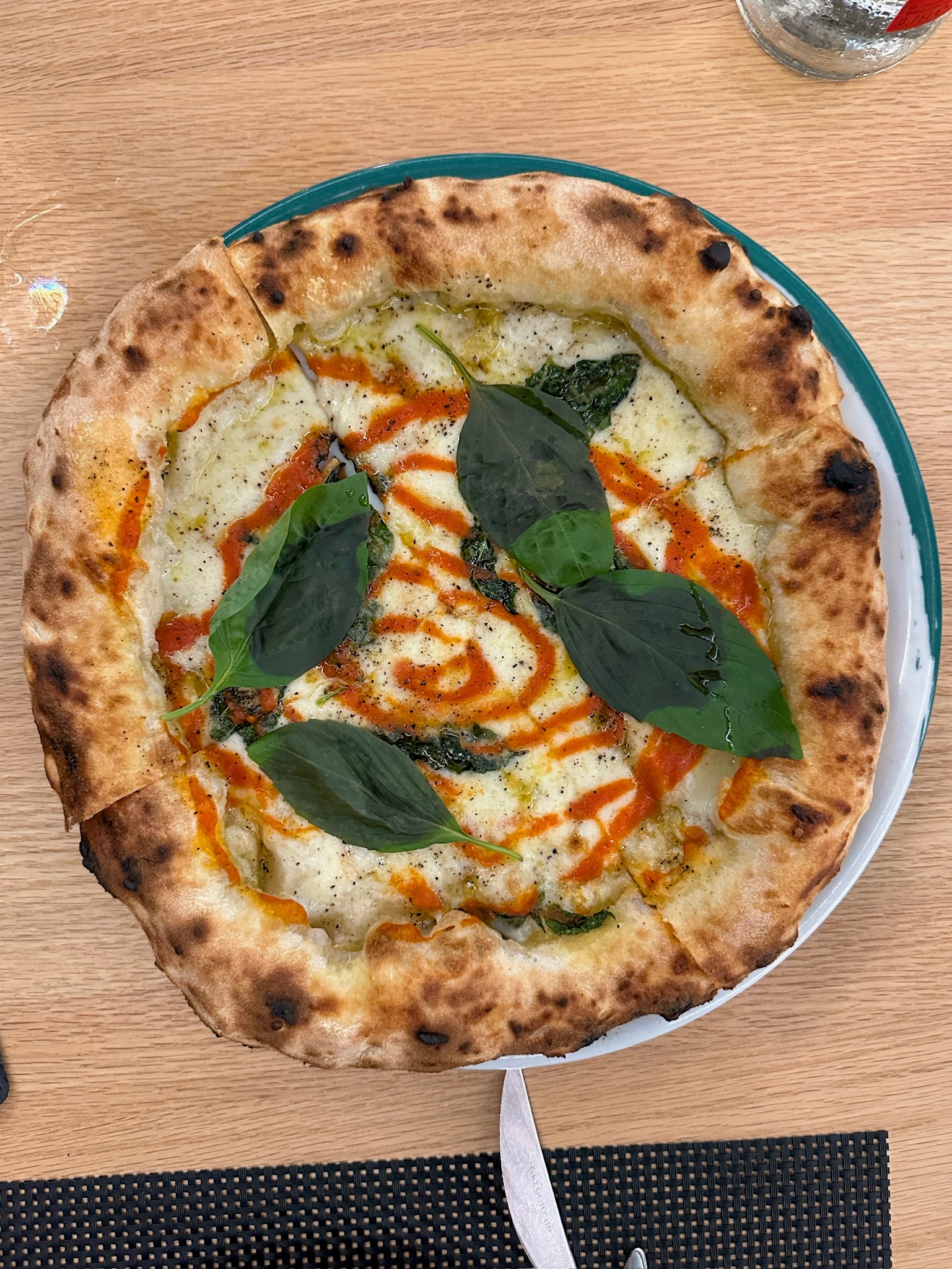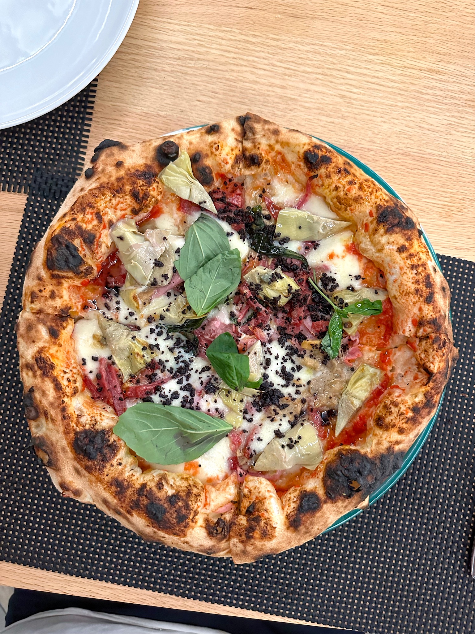 La proposta comprende: antipasti fritti, primi e secondi piatti, una selezione di pizze legate alla tradizione, una sezione con abbinamenti creativi, e una corposa proposta di pastry pizza. Tra gli antipasti spiccano: la Frittatina Gold, fatta con bucatini, besciamella allo zafferano, guanciale di razza casertana, provola e parmigiano DOP 36 mesi; e il Supplì Sottobosco, fatto con risotto, salsiccia di suino, porcini, parmigiano DOP 36 mesi e provola della penisola. Tra le pizze classiche è da menzionare la Marinara Casertana, fatta con acciughe di Cetara, pomodoro San Marzano, origano di collina, capperi di Salina, olive taggiasche e olio evo di Caiazzo; seguita da Il Capriccio Di Simone fatta con prosciutto cotto alta qualità, salame Tipo Napoli, carciofo fresco brasato, lamelle di funghi porcini, terra di olive nere caiazzane, olio evo di Caiazzo, fiordilatte della penisola e parmigiano DOP 36 mesi. Tra le proposte con abbinamenti più articolati invece, degno di nota è lo Spicchio di Zebò – Fuoco e Farina, un padellino 100% cereali firmato dalla chef Amelia Falco, cotto al vapore e al forno, farcito con tuorlo d’uovo panato e fritto, spinacino agli agrumi, primo sale piastrato, carpaccio di tartufo pregiato e olio evo di Caiazzo. Per quanto riguarda la proposta dolce, tra la ricca carta sono da menzionare la La Conciata di Nicola, un’idea dolce di Margherita, con confettura dolce di pomodoro, mousse di mascarpone, nocciole di Giffoni infornate e scagliette di conciato romano; e lo spicchio di Assoluto di Mela Annurca con mela in quattro consistenze.