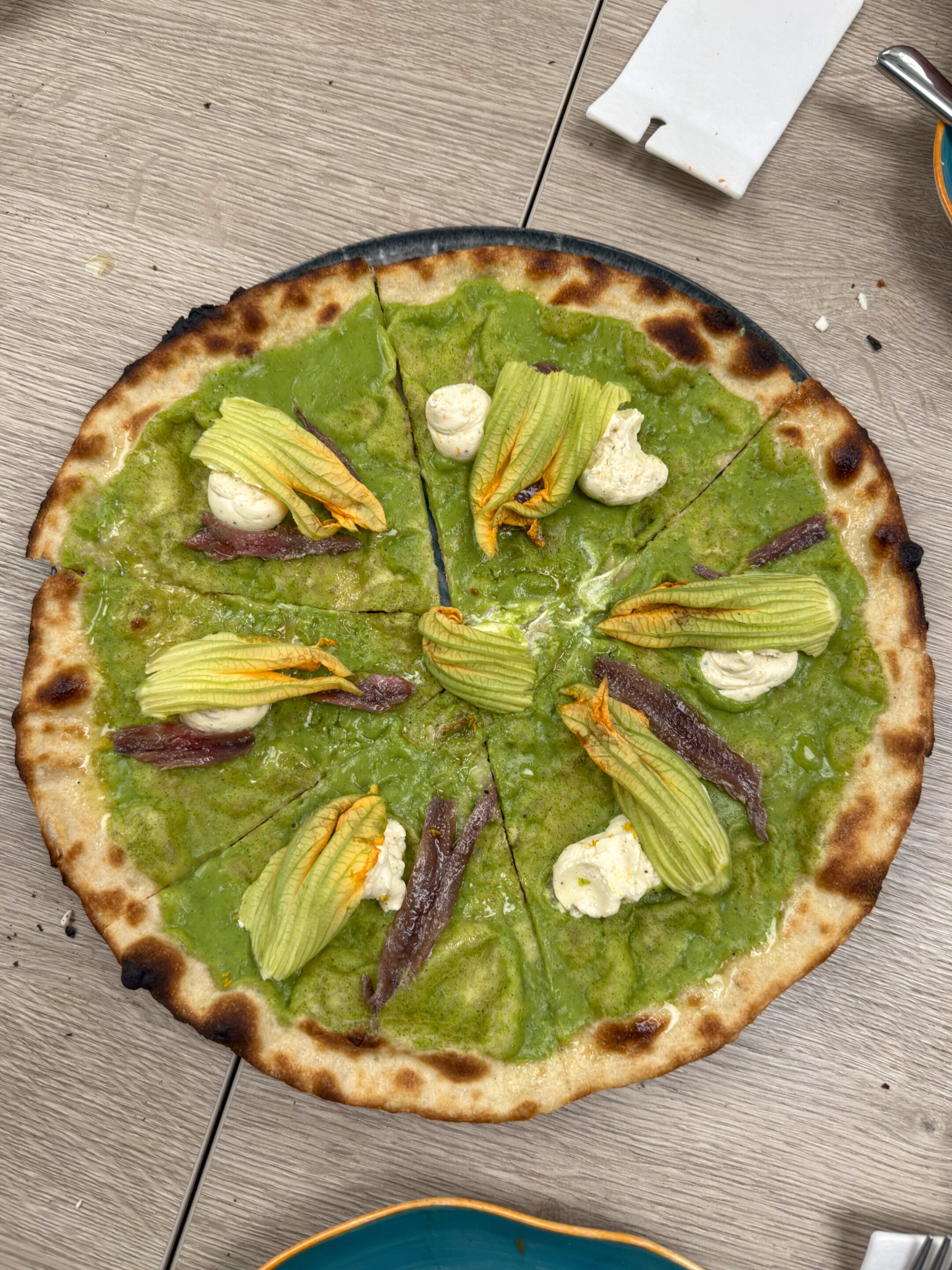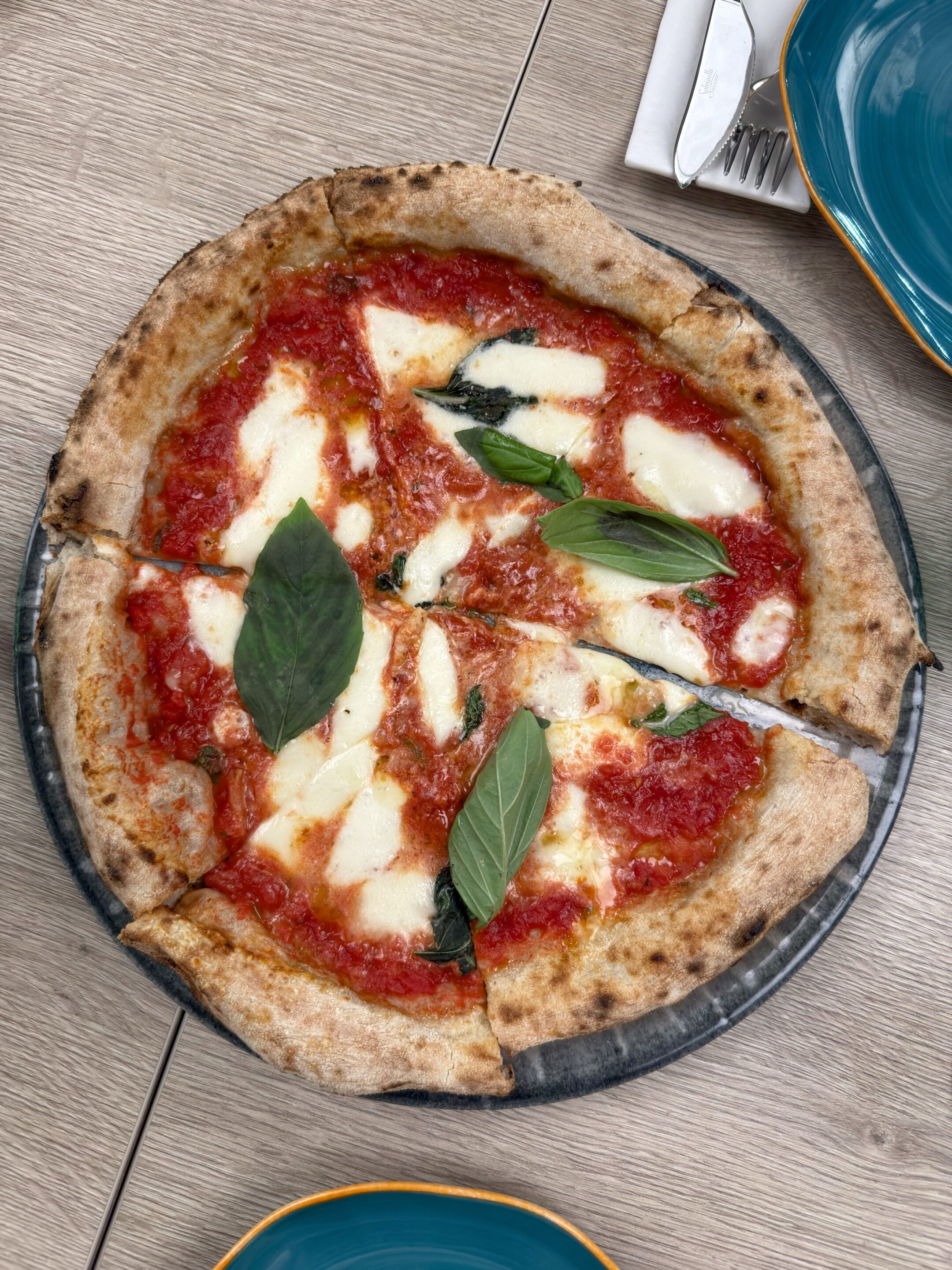 La proposta in menu varia dall’impasto della Tonda Napoletana classico, alla pizza in Pala alla Romana, dal Maritozzo, al Buns al vapore, alle Montararine e all’immancabile Crocchè. Tra le pizze classiche non può mancare la Margherita fatta con pomodoro San Marzano, fiordilatte campano, olio evo e basilico; tra quelle con stesura a ruota di carro degna di nota è la Giulia fatta con pomodoro San Marzano, melanzane fritte, ricotta salata e basilico, e la Eleonora fatta con pomodoro San Marzano, parmigiano grattuggiato, olio evo e basilico. La pizza Alessandro invece, fatta con crema di zucchine, fiori di zucca, ricotta fresca, acciughe sotto sale, spicca tra quelle romane.