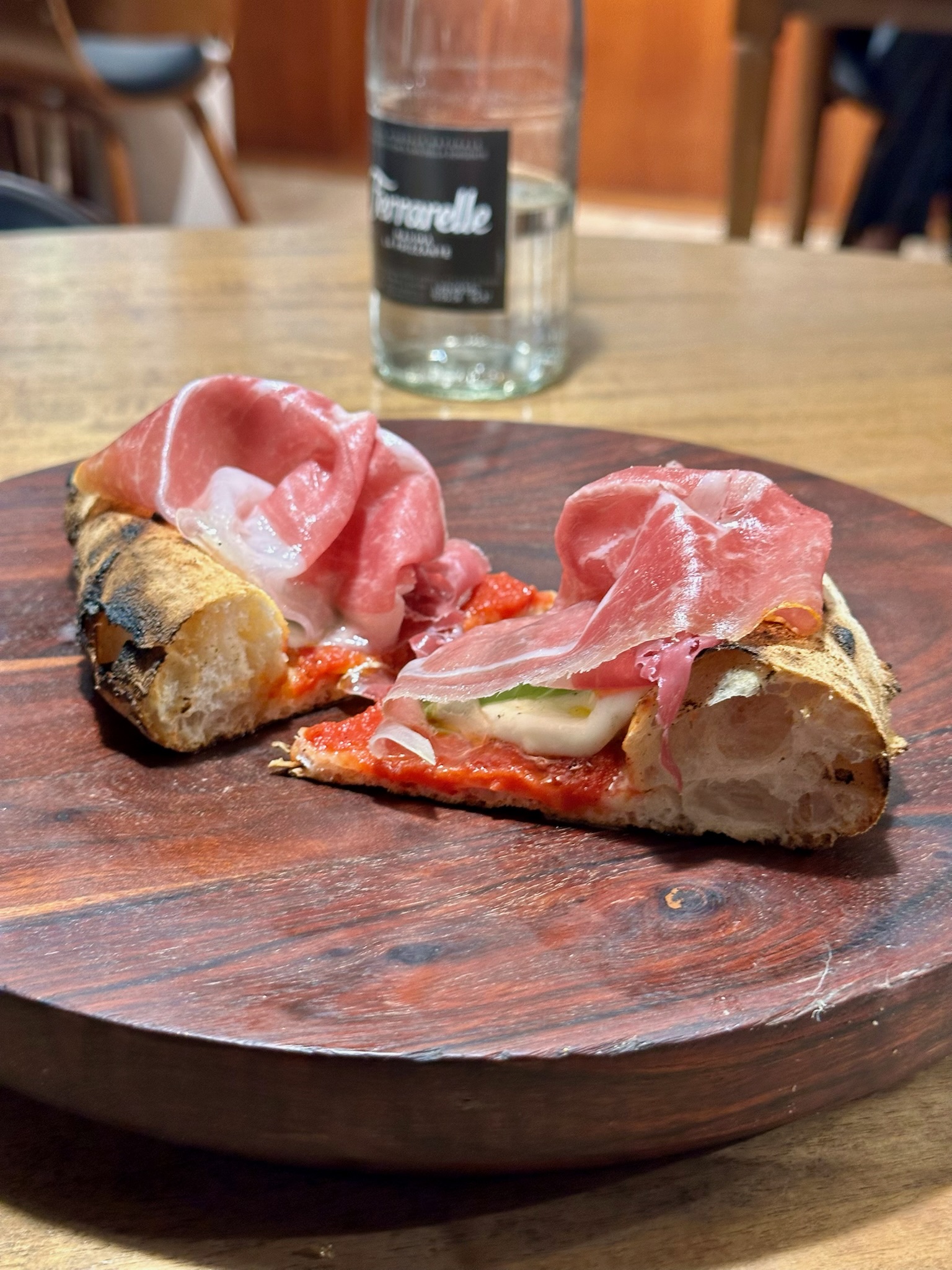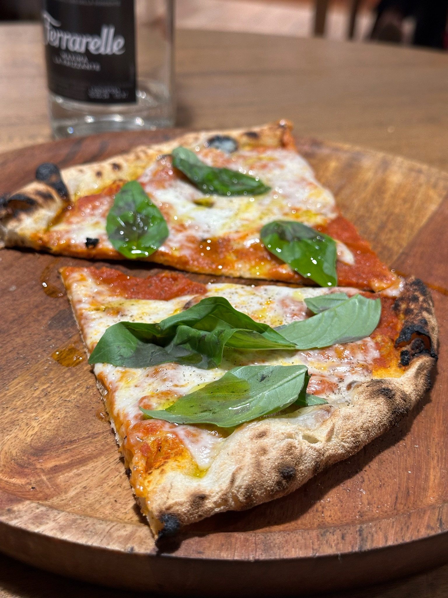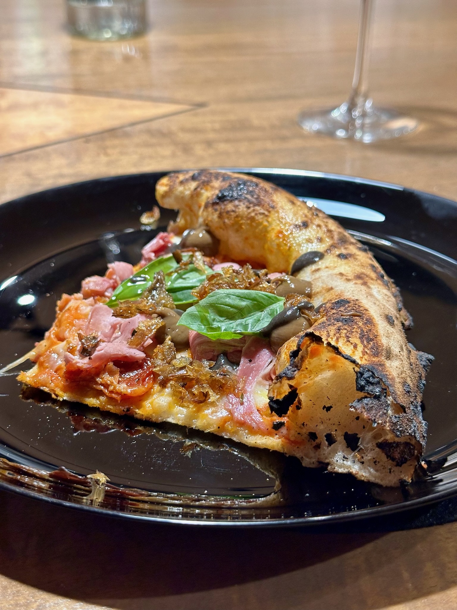 La caratteristica della pizzeria è quella di proporre la pizza servita a spicchi senza l’utilizzo di posate , ‘obbligando’ i commensali a mangiare con le mani. Il menu presenta abbinamenti studiati e innovativi mediante l’utilizzo di prodotti del territorio. Nella proposta in menu merita una menzione la Coprovola e Pepe, fatta con crema di pomodoro alla brace, provola di capra silana, pepe di penja, olio evo e basilico; e la Capricciosa con pomodoro alla brace, mozzarella, cotto di suino nero, ketchup di porcini, estratto di olive nere, insalata di carciofi e basilico. Anche i dolci sono presenti, tra cui una selezione di spicchi, la cui base prende il nome di super soft , un impasto tra una pizza in pala e una brioche. Tra le molteplici farciture è presente lo spicchio Castagne, fatto con namelaka alle castagne, gel ai cachi, gelato alla crema inglese e croccante fondente.