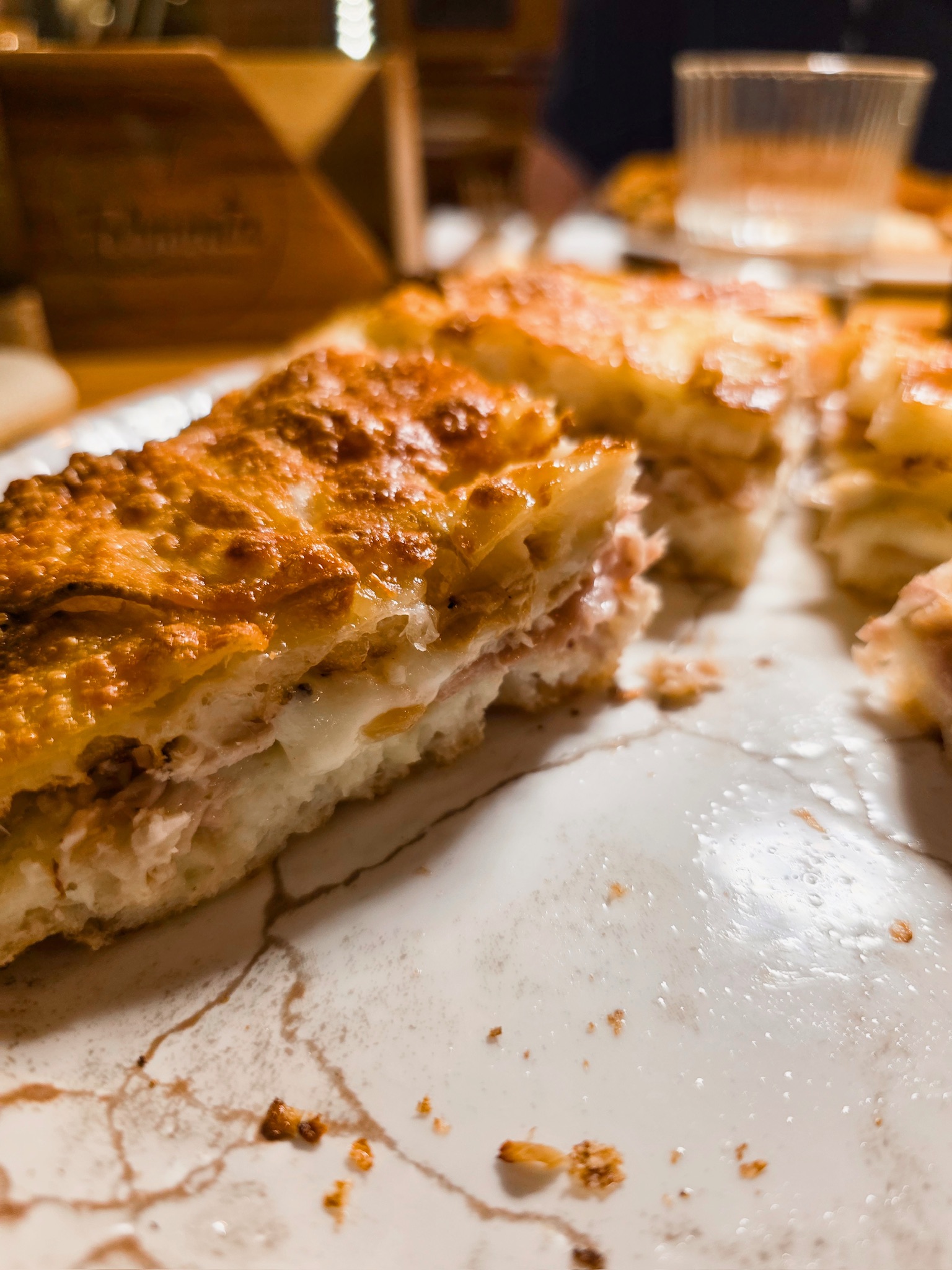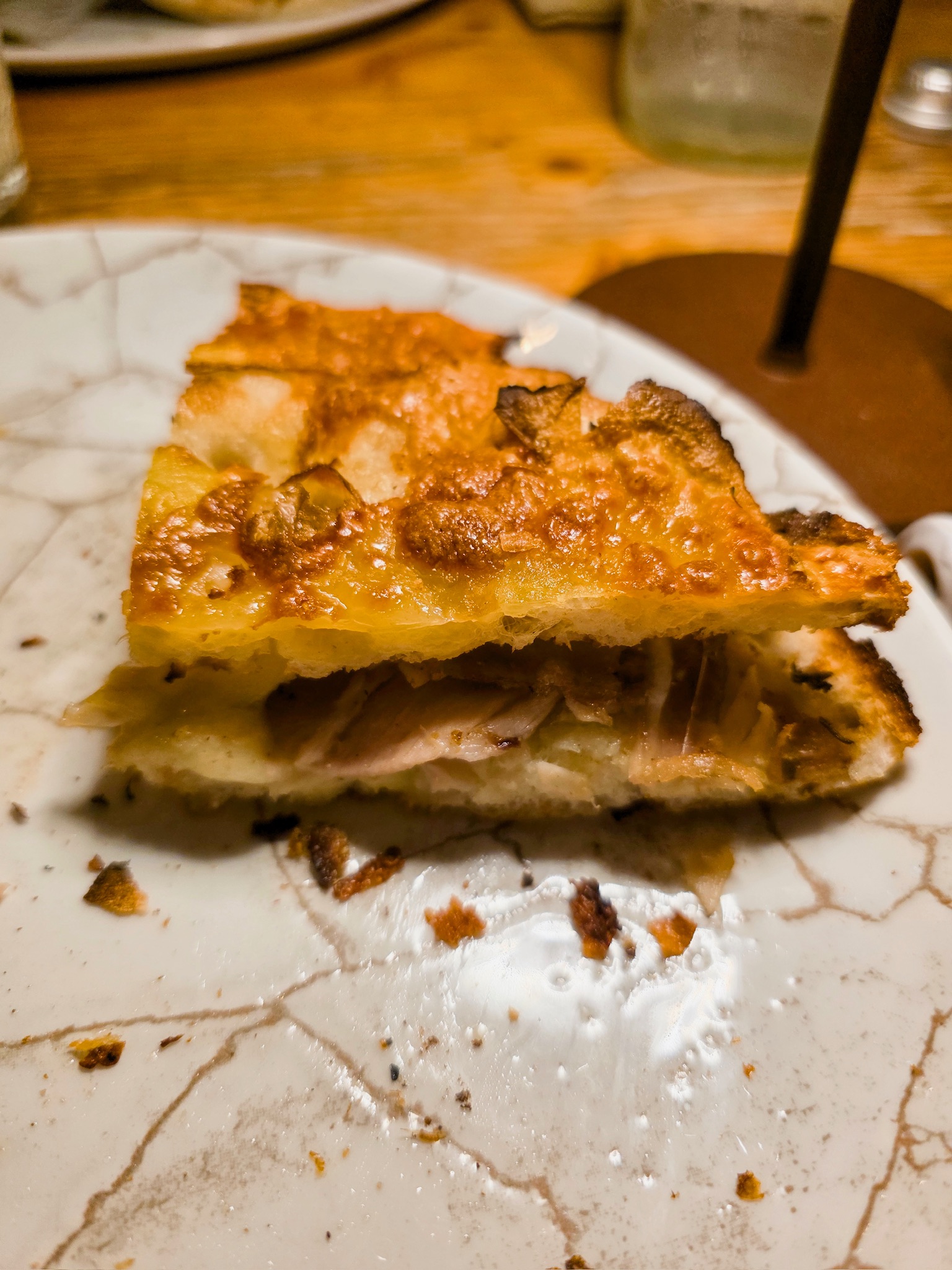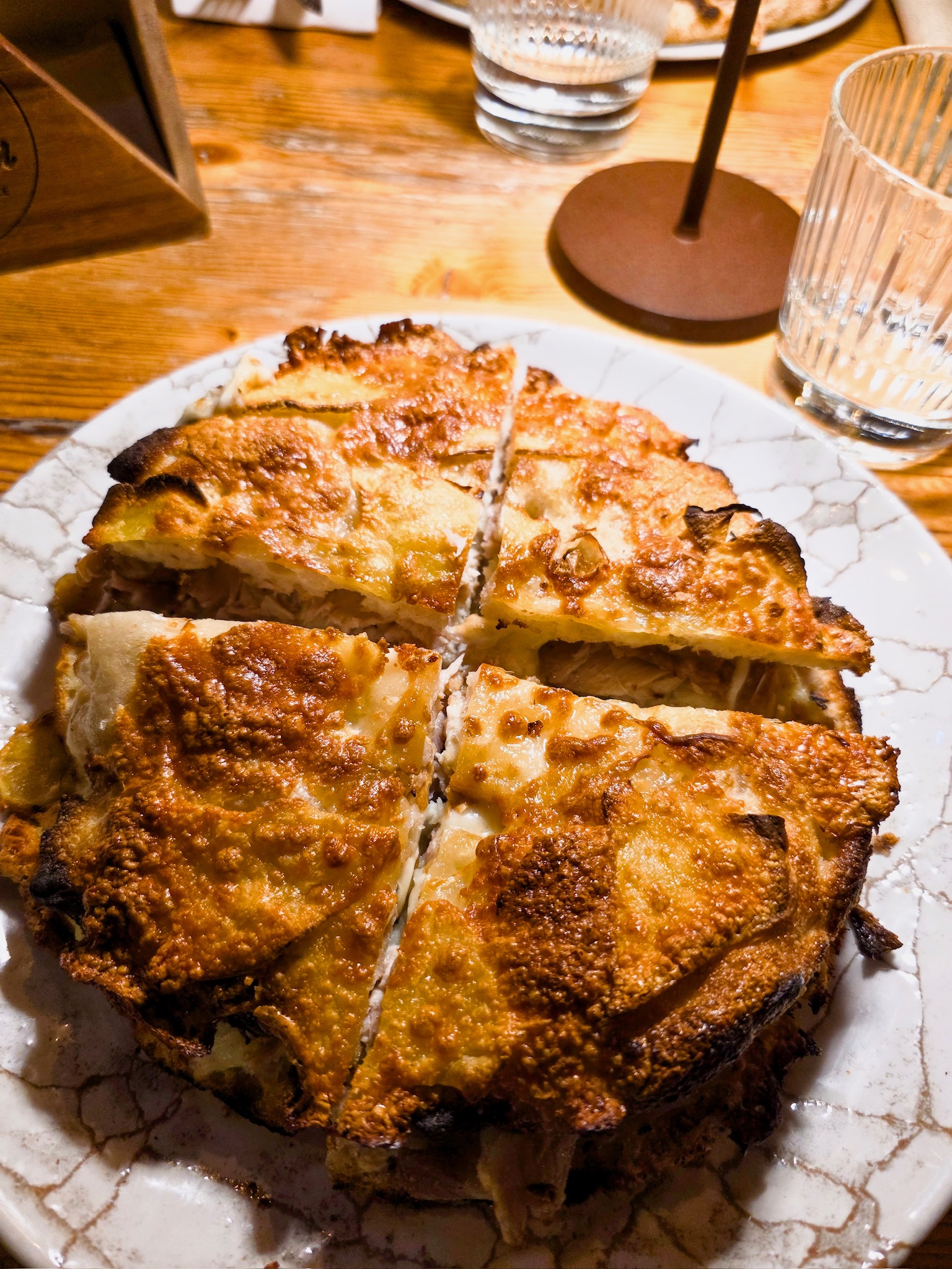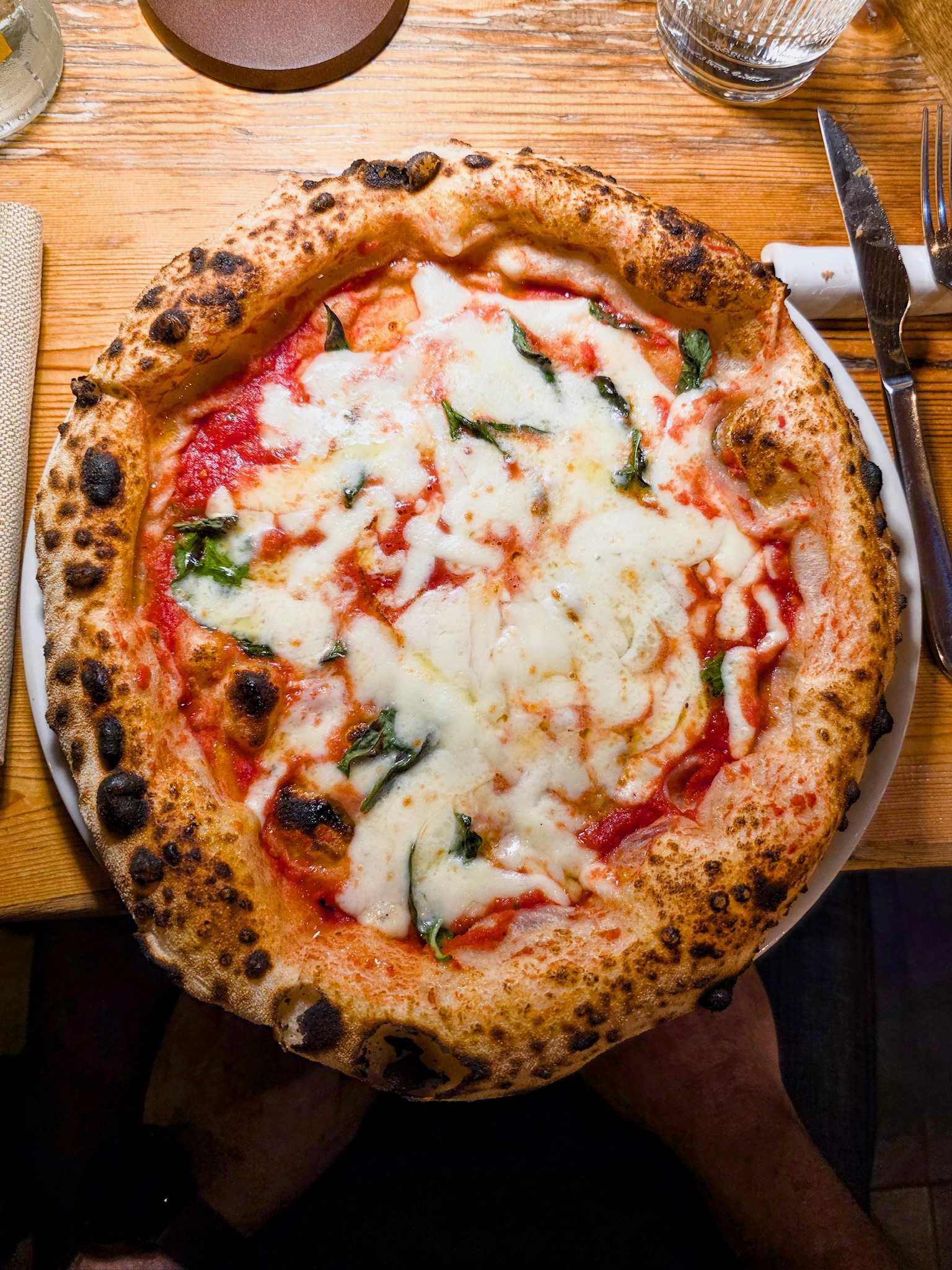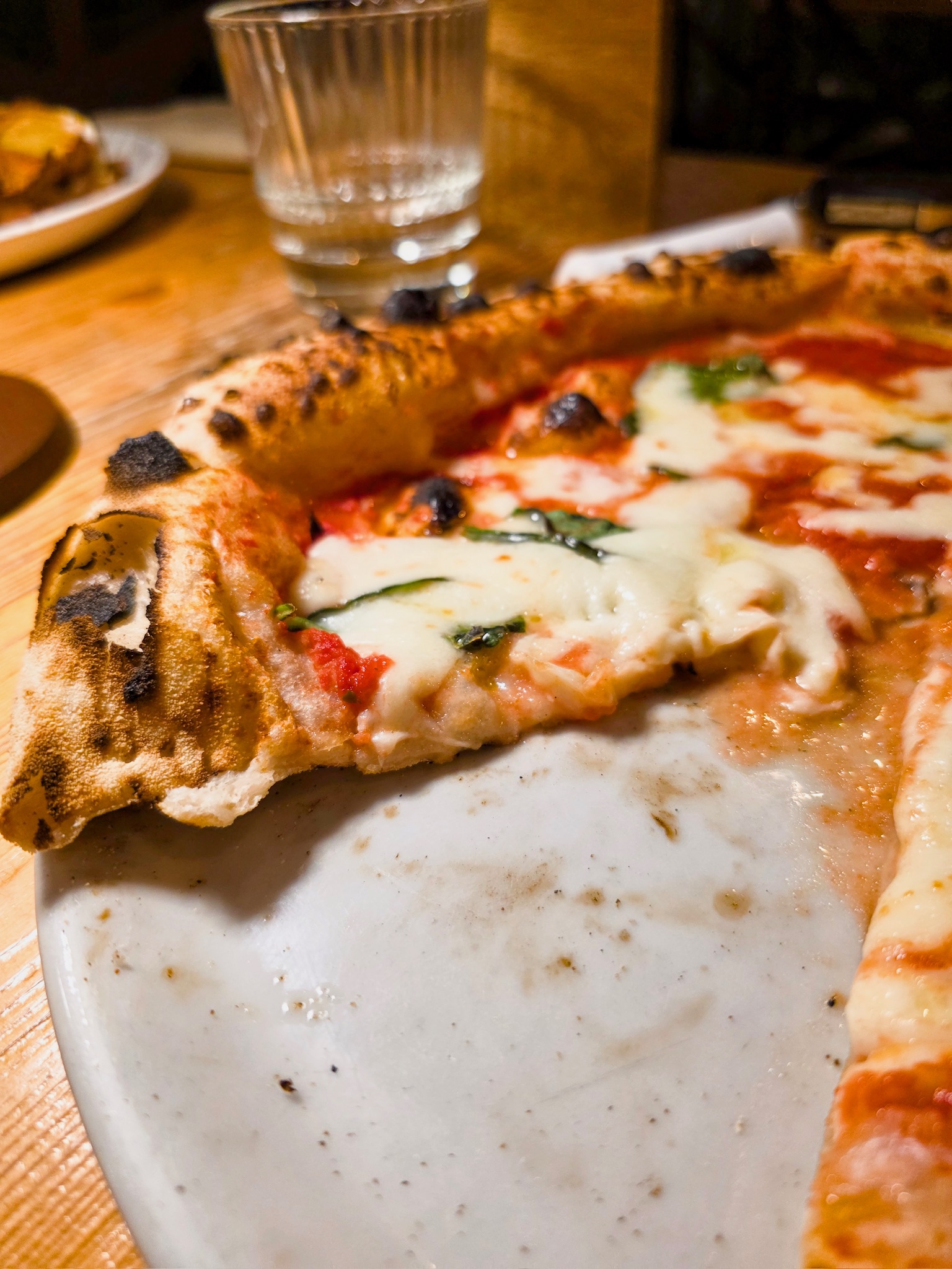 La pizza proposta da Luca racconta il territorio abruzzese, con le sue eccellenze e le sue particolarità, a partire dai latticini di pecora, fino ad arrivare alle farine di grani autoctoni. L’impasto è un ibrido tra tradizione e innovazione, la base è un prefermento con 40% di biga, 60% di farina 0, 80% di idratazione e una lievitazione di 48 ore circa. Il menu si articola in pizze contemporanee, baciate doppio crunch, pizze in doppia cottura, ruoto, e padellini al vapore; tra le pizze classiche non può mancare la Margherita fatta con pomodoro San Marzano, fiordilatte, basilico, origano e olio evo; seguita dalla Comfortfood fatta con crema artigianale di tartufo bianchetto, prosciutto crudo di Parma, burratina di Putignano, carota gialla, pistacchi, tartufo nero e basilico; e la 4 Casi Abruzzesi e oltre fatta con 4 formaggi, caffè, limone e caco vaniglia. Tra le pizze in doppia cottura invece degna di nota è la Polpo e Patate fatta con polpo, patate, provola affumicata e tartufo fresco. Infine, anche i dolci sono presenti, tra cui lo Spicchio bagnato al caffè con ricotta dolce e scaglie di cioccolato.