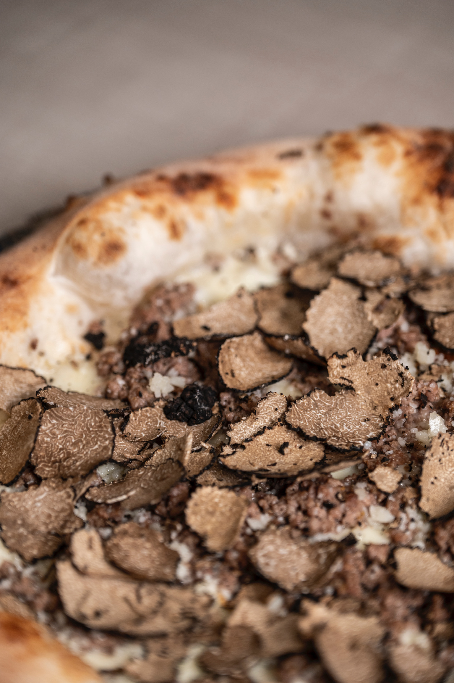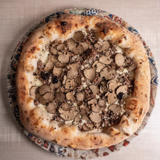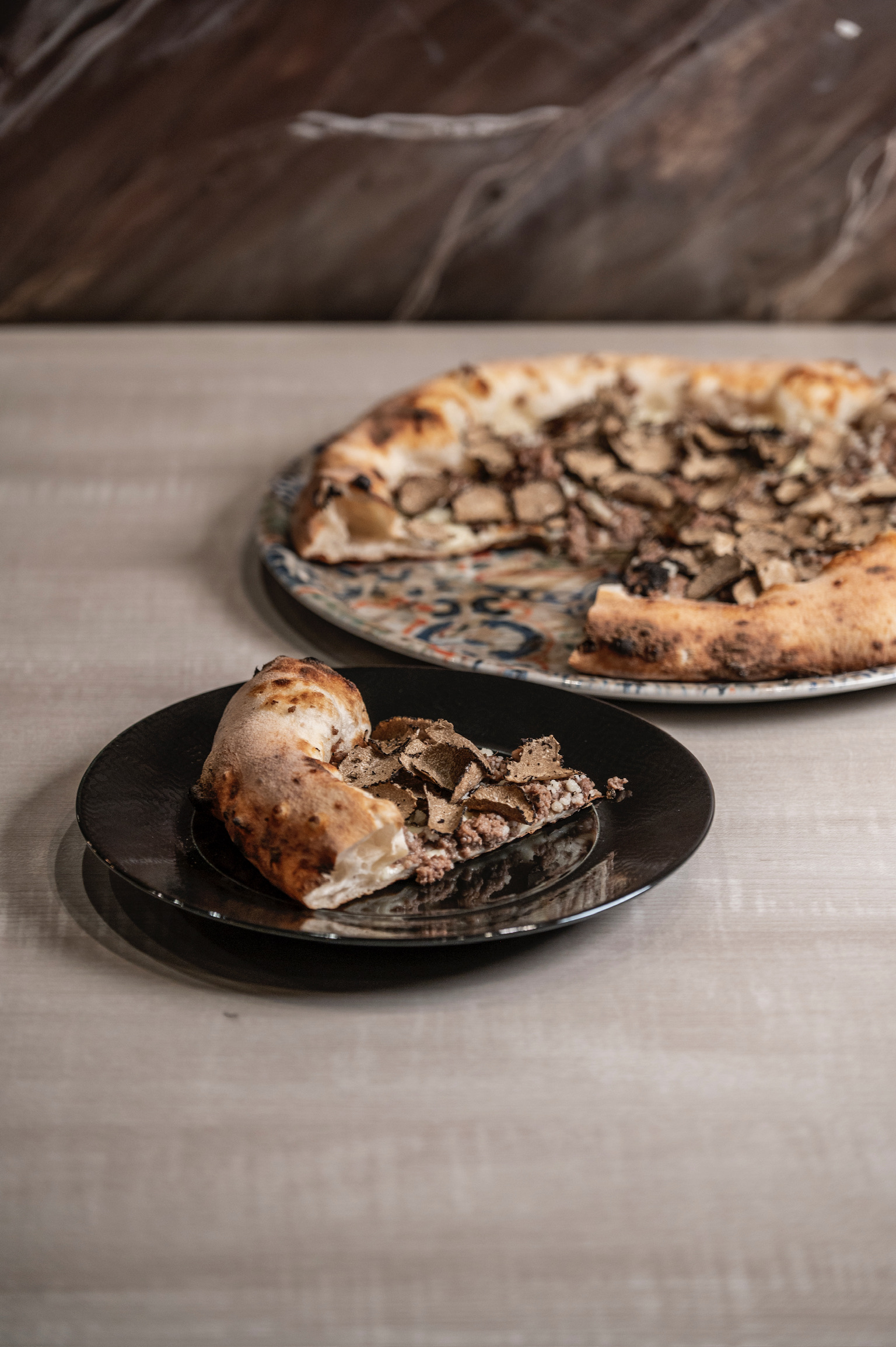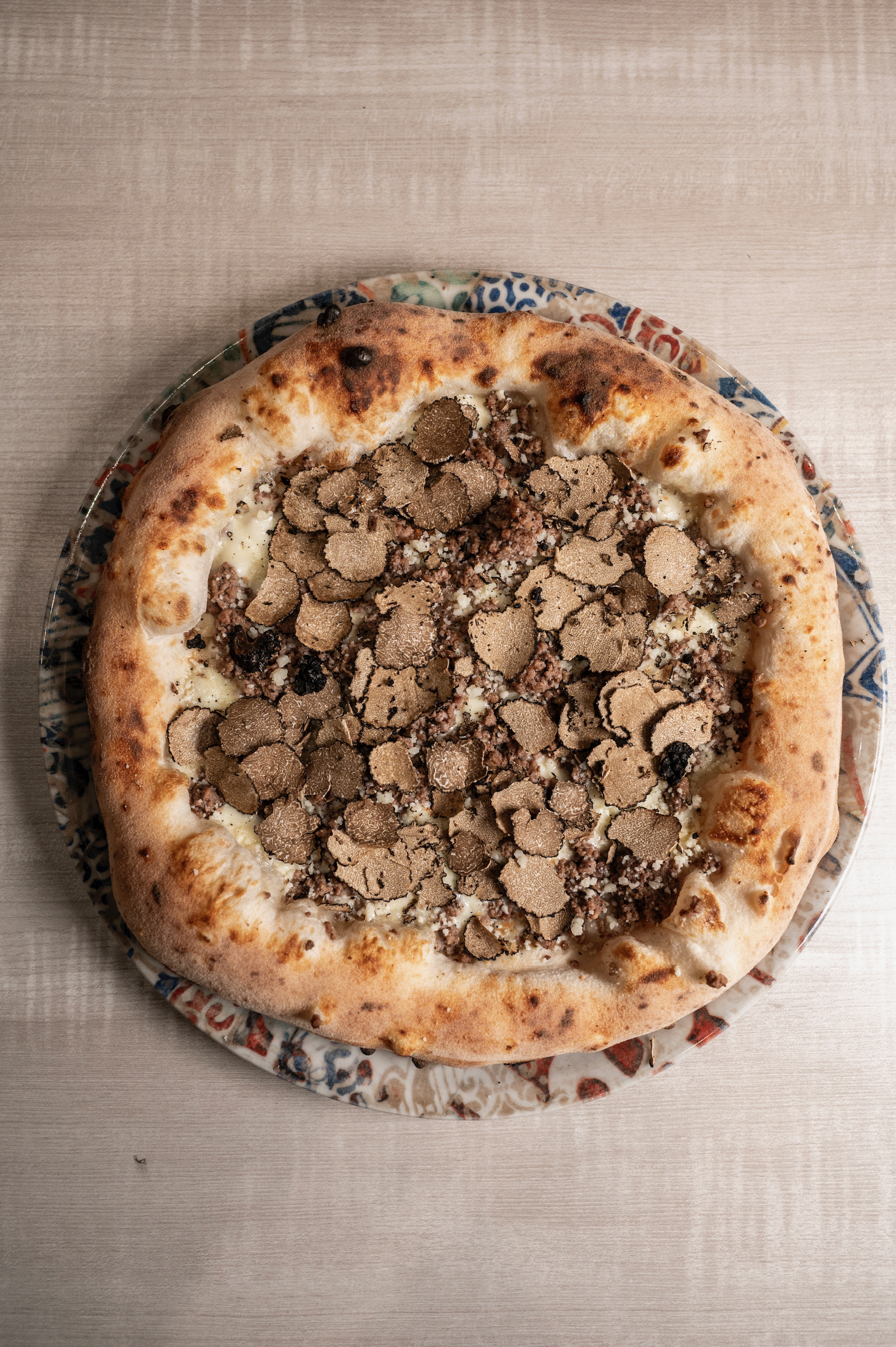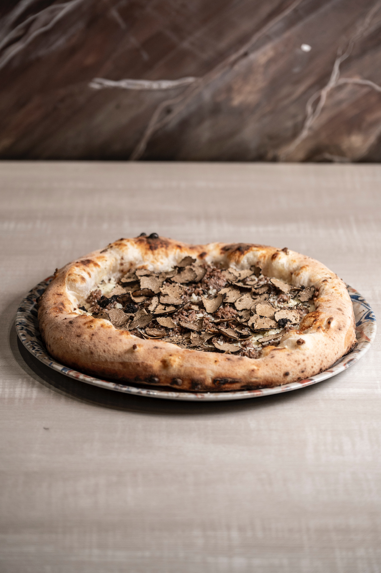 Tra le pizze presenti in menu meritano una menzione la Domenica Marchigiana fatta con ragù di carne bianco mista manzo/maiale della tradizione fermana, fiordilatte, pecorino e tartufo nero estivo; seguita dalla Come uno Spaghetto al Pomodoro fatta con salsa di San Marzano stracotto, composta fredda di pomodoro – basilico – polvere di peperoncino affumicato, parmigiano reggiano 24 mesi, olio mono varietale e basilico fresco; fino alla Capricciosa secondo Alberto Farina fatta con San Marzano, fiordilatte, funghi misti saltati in padella, prosciutto cotto, olive marchigiane e carciofi alla romana.