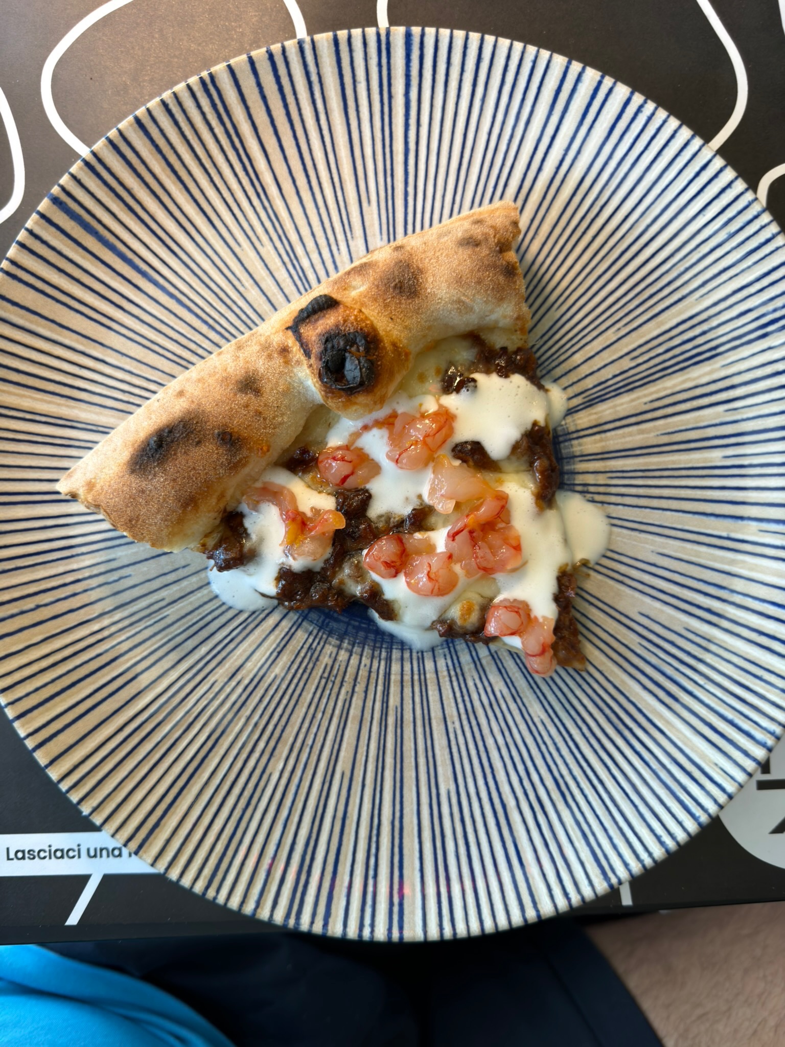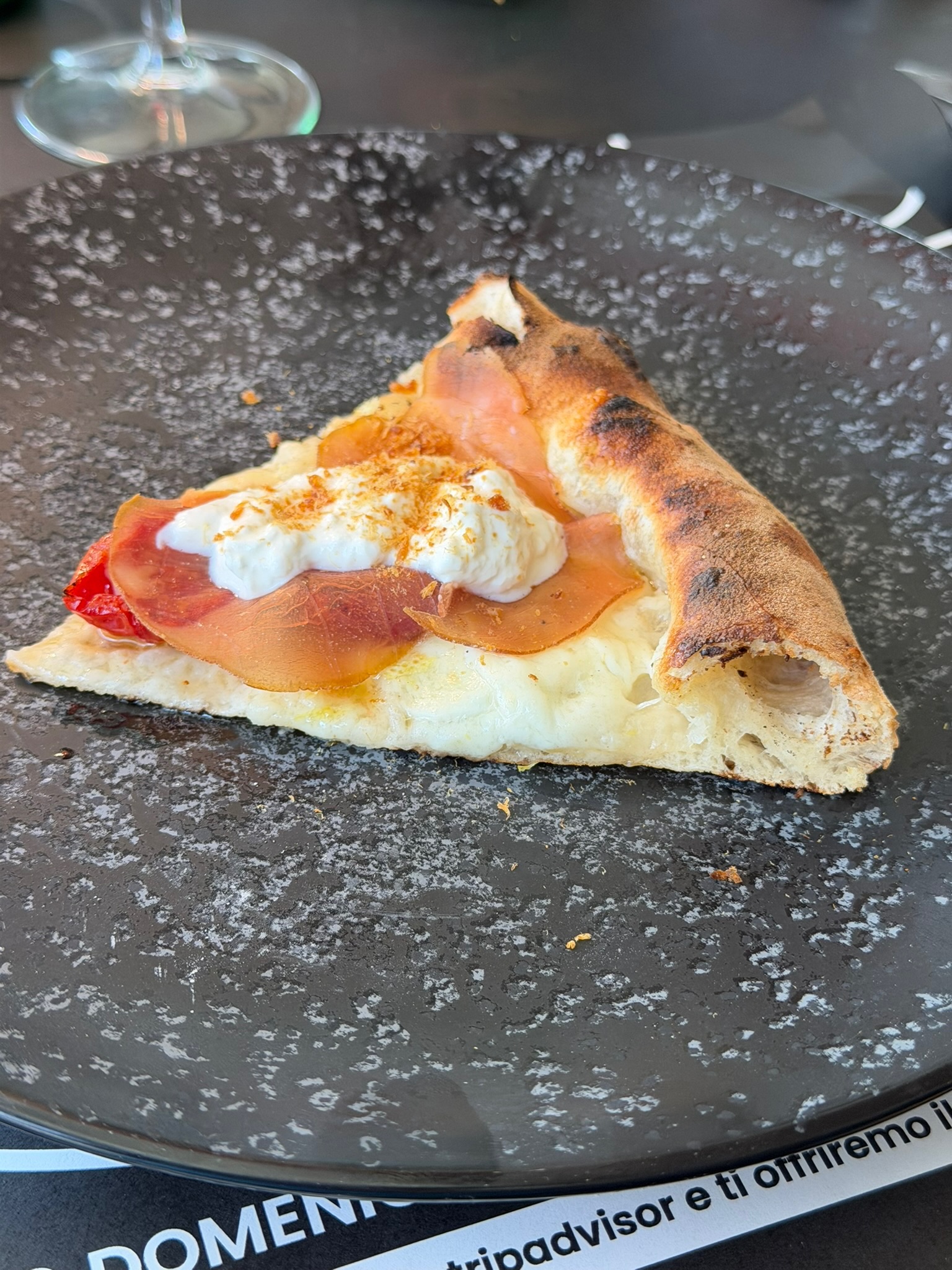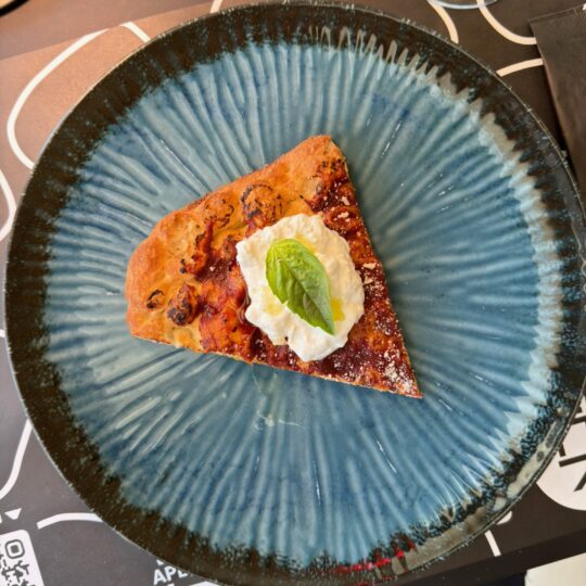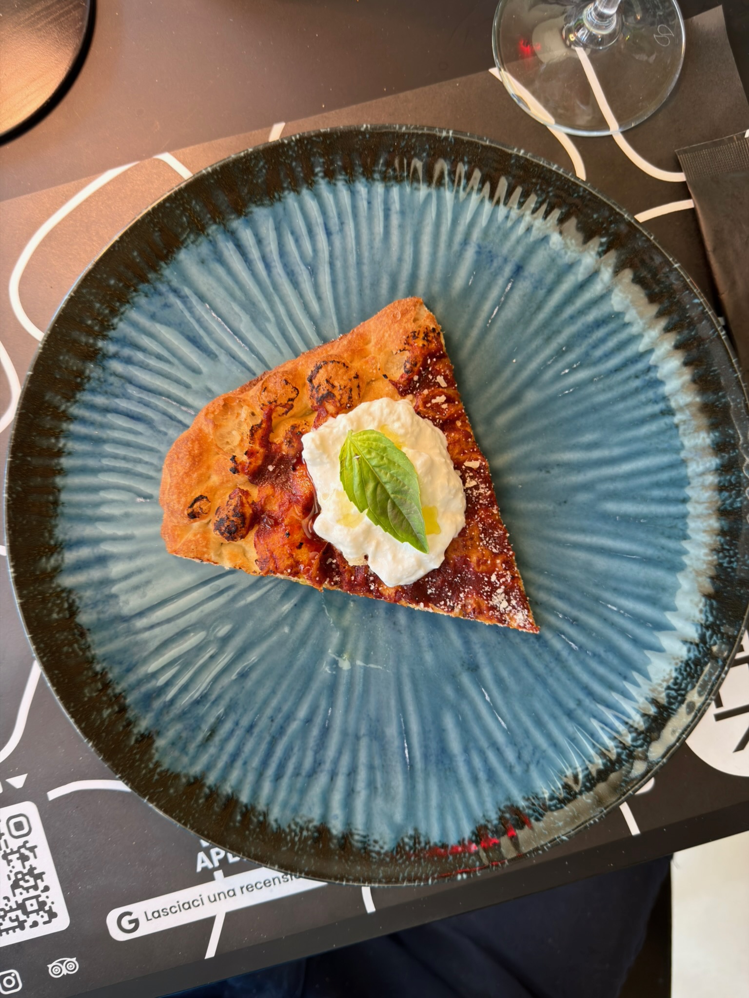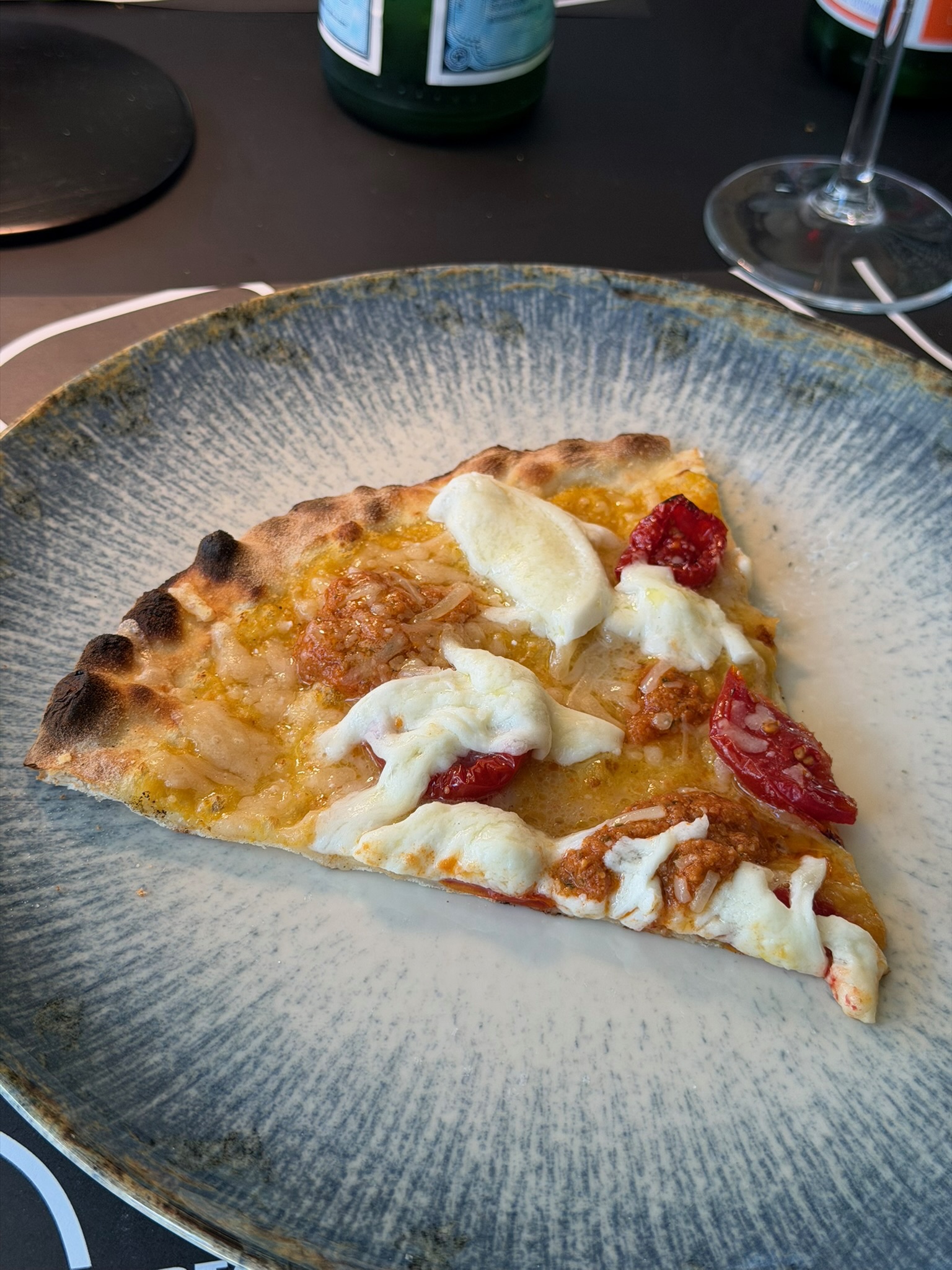 La tipologia di pizza proposta è varia, si può scegliere tra napoletana, sottile e tripla cottura (vapore, fritta e al forno). Per quanto riguarda i topping, il menu prevede sia pizze classiche, come nel caso della Margherì fatta con pomodoro san Marzano, fiordilatte, spolverata di grana 24 mesi, basilico e olio evo; sia pizze speciali definite LAB tra cui spiccano la Offishina fatta con bufala campana, tunni (bresaola di tonno stagionata 12 mesi), burrata pugliese, tabacco marino (sfilacci di pesce azzurro essiccati), pomodorini confit e zest di limone; e la Tre Pomodori fatta con datterino giallo, composta di datterino all’acqua di mare con aglio, grana, basilico, grana a scaglie, bufala fuori cottura, pomodorino confit e olio evo. Tra i dolci infine, oltre i classici, è presente uno spicchio di pizza dolce fatto con impasto al cacao con crema di ricotta, salsa al caramello salato e pepite di cioccolato.