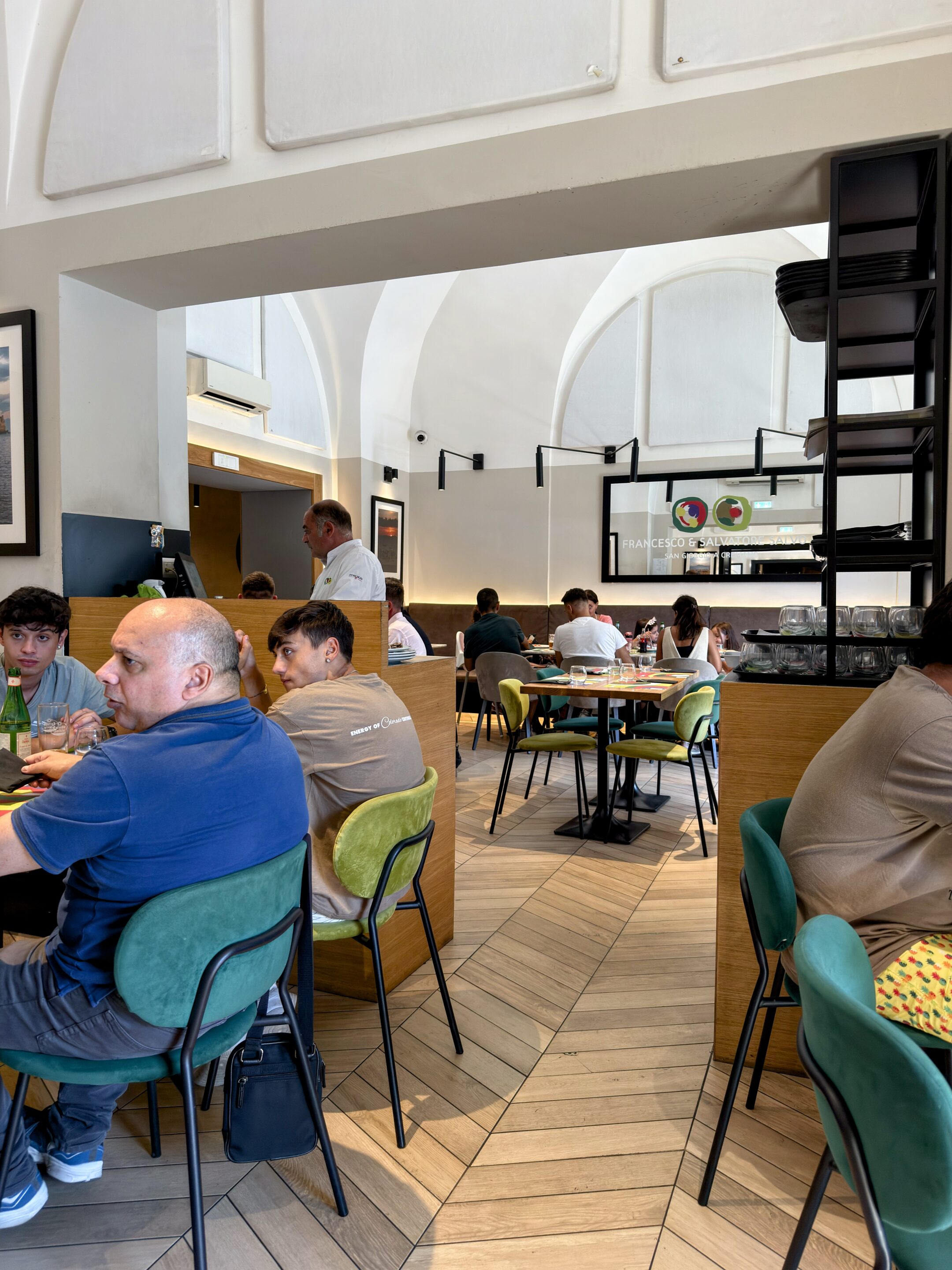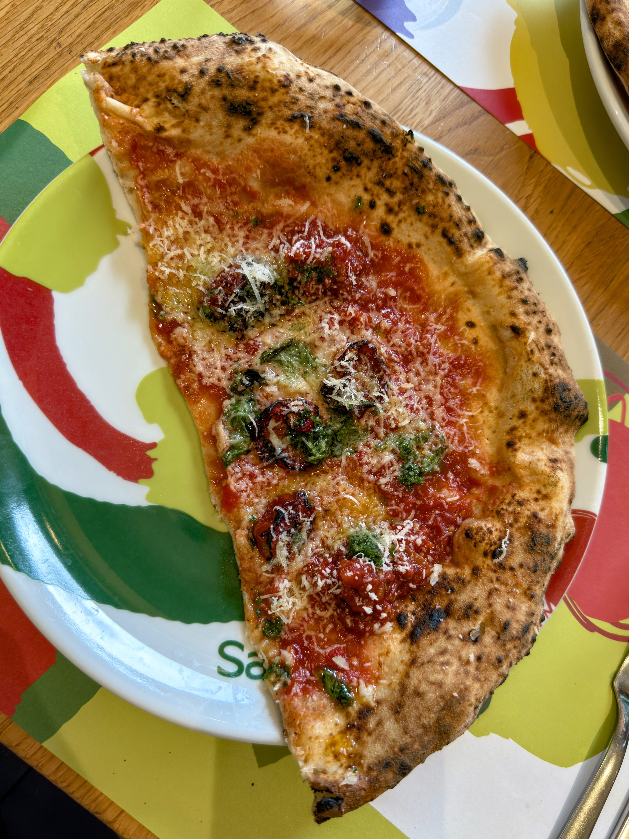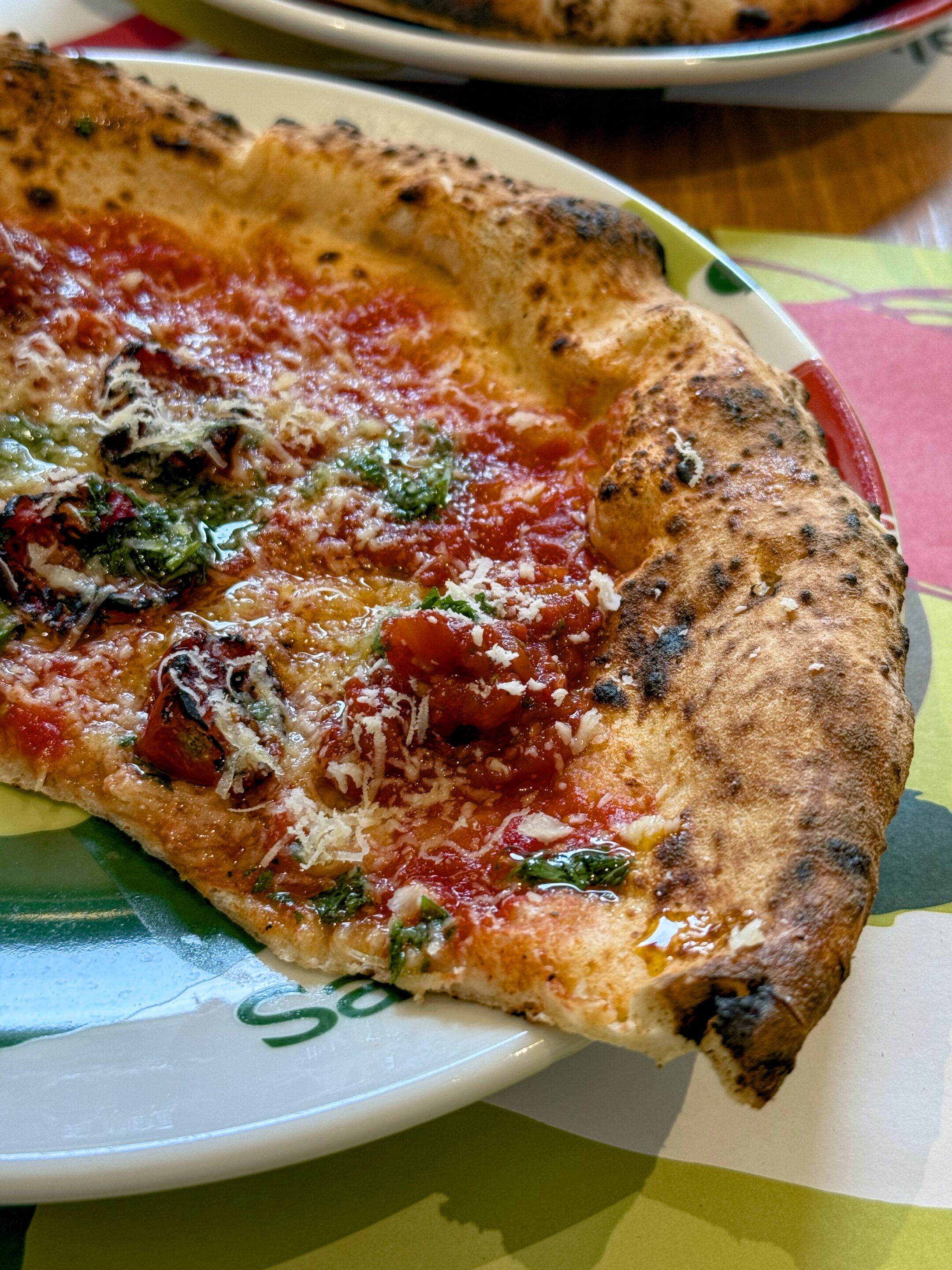 La tipologia di pizza proposta è la verace napoletana con un tocco di modernità; l’impasto è realizzato con due tipologie di farina e lievita per più di 24 ore. Il menu, oltre una carta di ben 7 Margherite, propone nuove pizze create a seconda dei prodotti del periodo, una selezione di pizze speciali, fritti, montanari e dolci. Tra le pizze classiche degna di nota è la Margherita Flegrea fatta con pomodoro “Cannellino Flegreo”, fiordilatte, parmigiano Reggiano DOP 24 mesi e olio evo; tra le pizze speciali invece, merita una menzione la Scarpariello fatta con pomodoro di Gragnano, pomodori datterini grigliati, battuta di pomodoro biologico, olio aromatizzato all’aglio, prezzemolo e peperoncino, tuma persa siciliana grattugiata, pecorino toscano grattugiato e basilico.