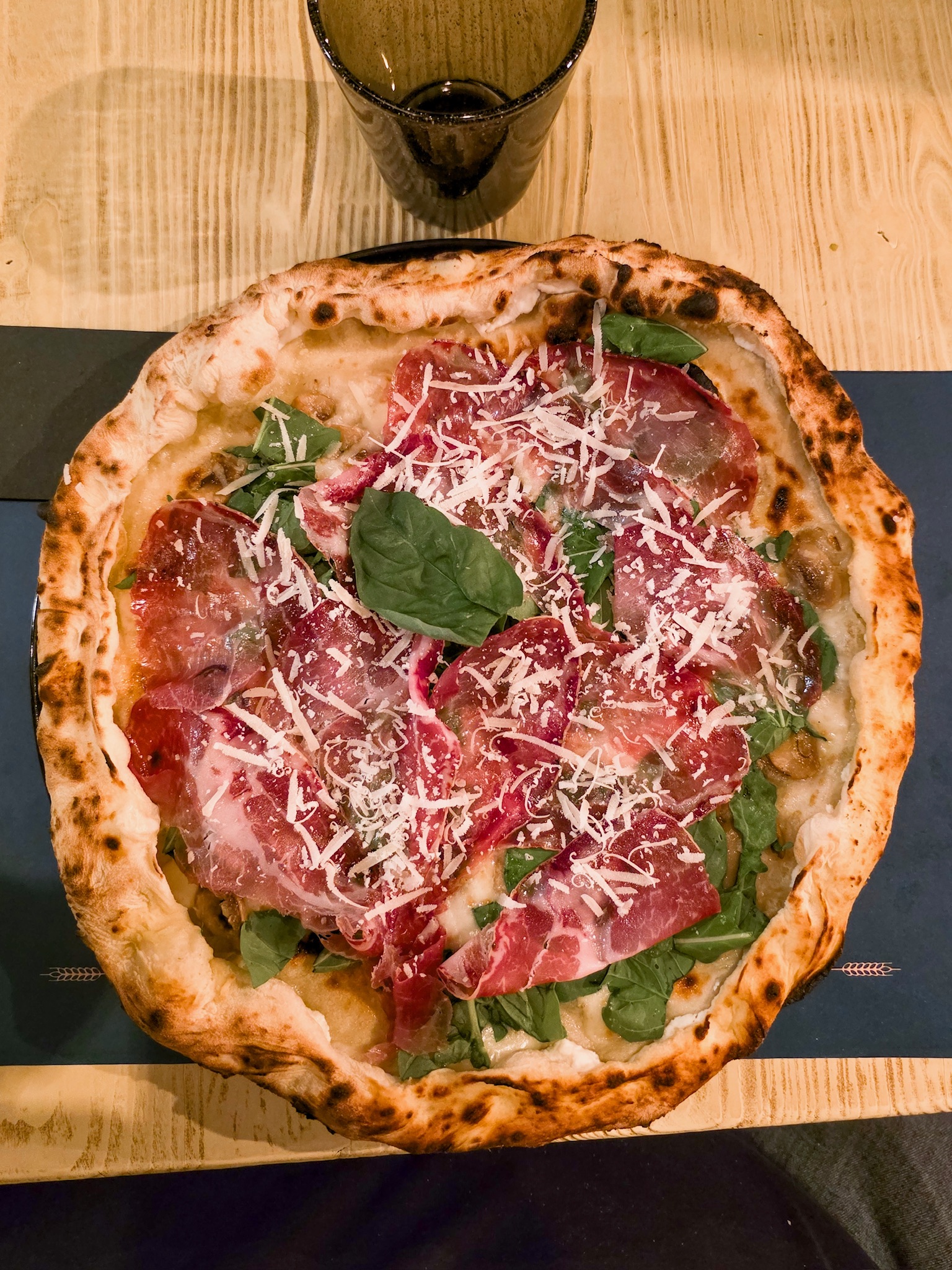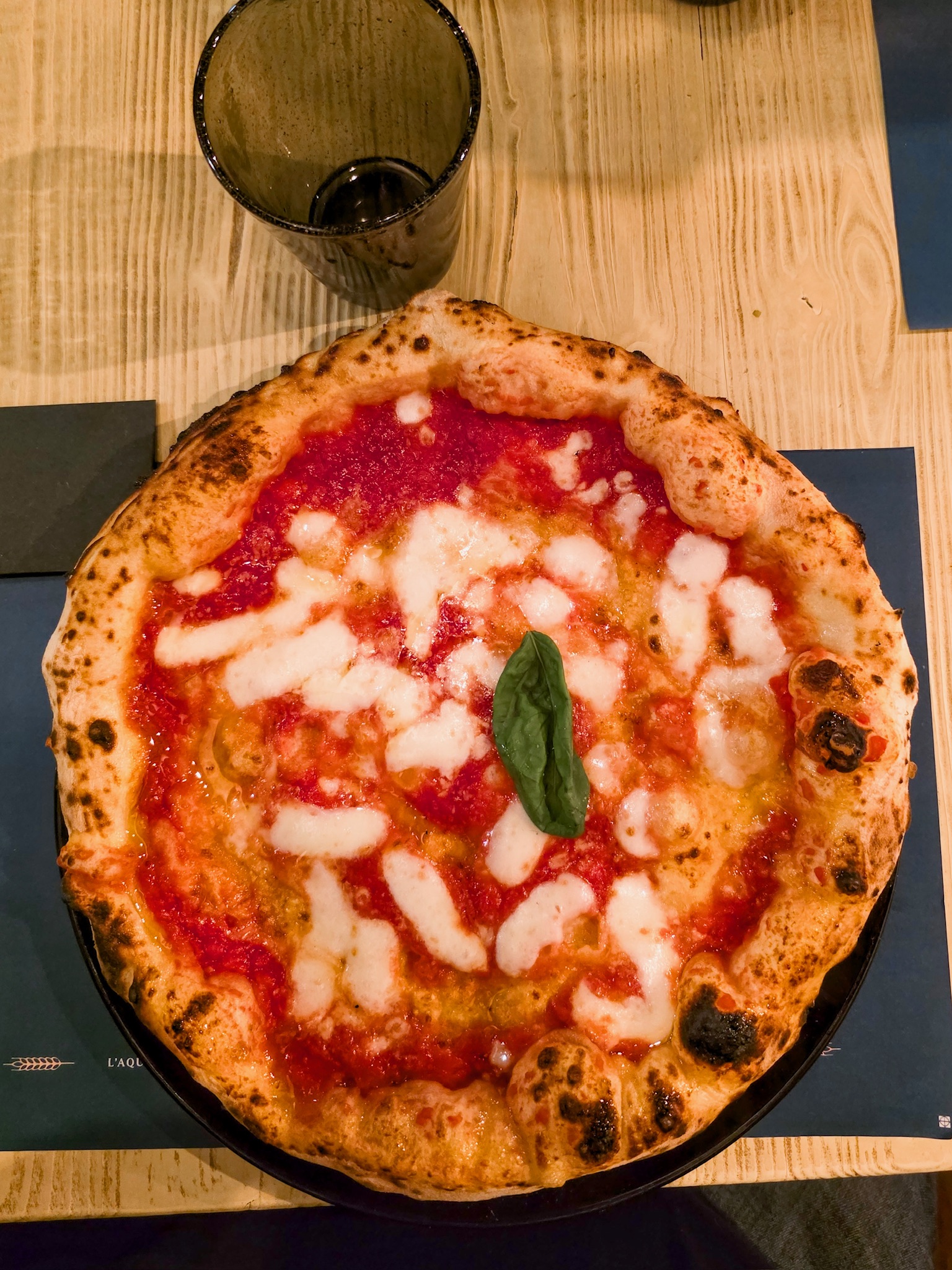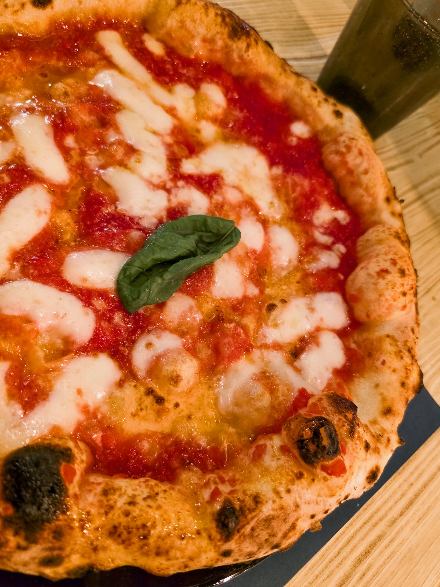 La pizza proposta presenta un’impasto ad alta idratazione, con il tipico cornicione della pizza napoletana contemporanea in chiave rivisitata, sia nella scelta delle farine di grano tenero e duro, così come nella dimensione più ridotta del panetto e nella lievitazione di circa 30 ore. Il menu è articolato e va dalla ruota di carro con i grandi classici, alla pizza tonda classica con abbinamenti più insoliti, fino al padellino. Tra le pizze classiche, oltre l’immancabile Margherita, c’è la Carrettiera fatta con fiordilatte, provola, friarielli alla napoletana, salsiccia a punta di coltello, parmigiano e olio evo. Degna di nota è la Antica Reale di Atessa fatta con cornicione ripieno di ricotta di bufala, fiordilatte, lardo di maiale nero d’Abruzzo, spezie, in uscita conciato romano, fichi reali di Atessa fermentati, pepe e origano; mentre tra le storiche merita una menzione la Polpo Lardiato fatta con friarielli leggermente piccanti e crema di friarielli, lardo, stracciatella pugliese, tentacolo di polpo arrosto, polvere di peperone dolce e erbolio al peperoncino.