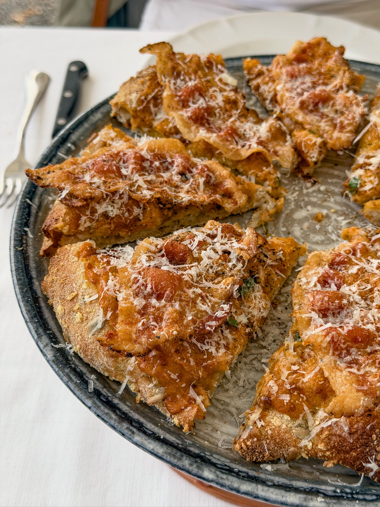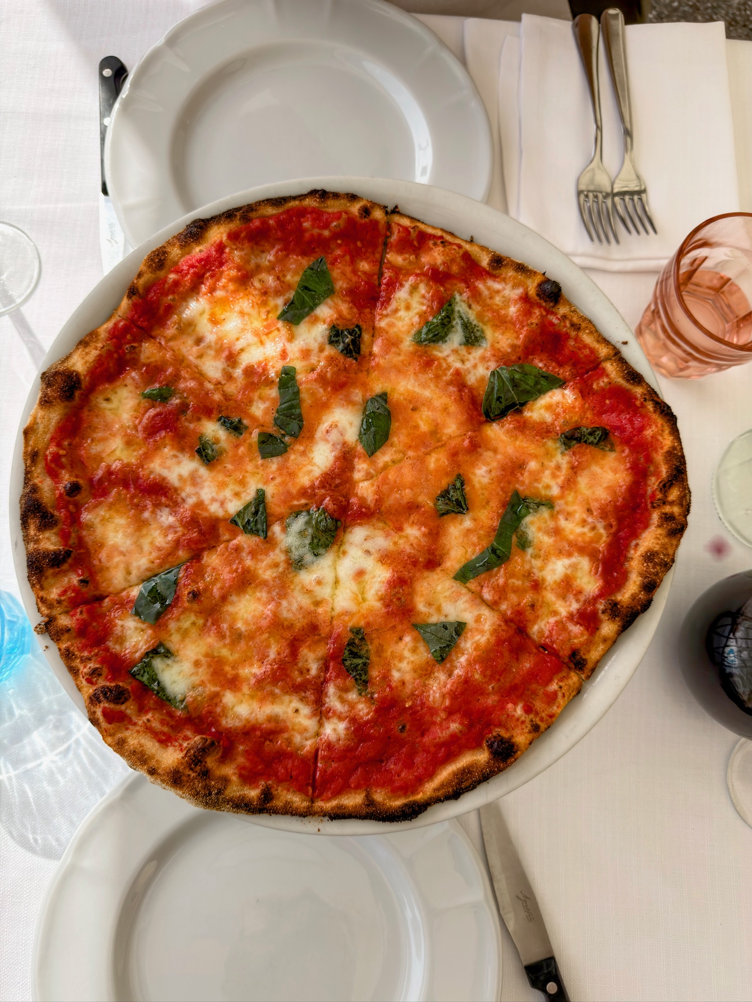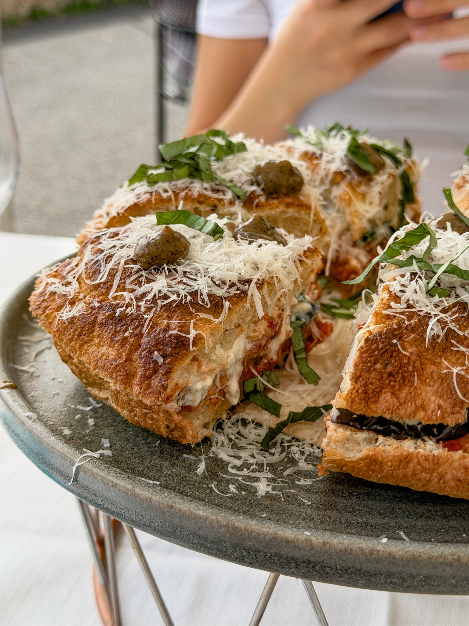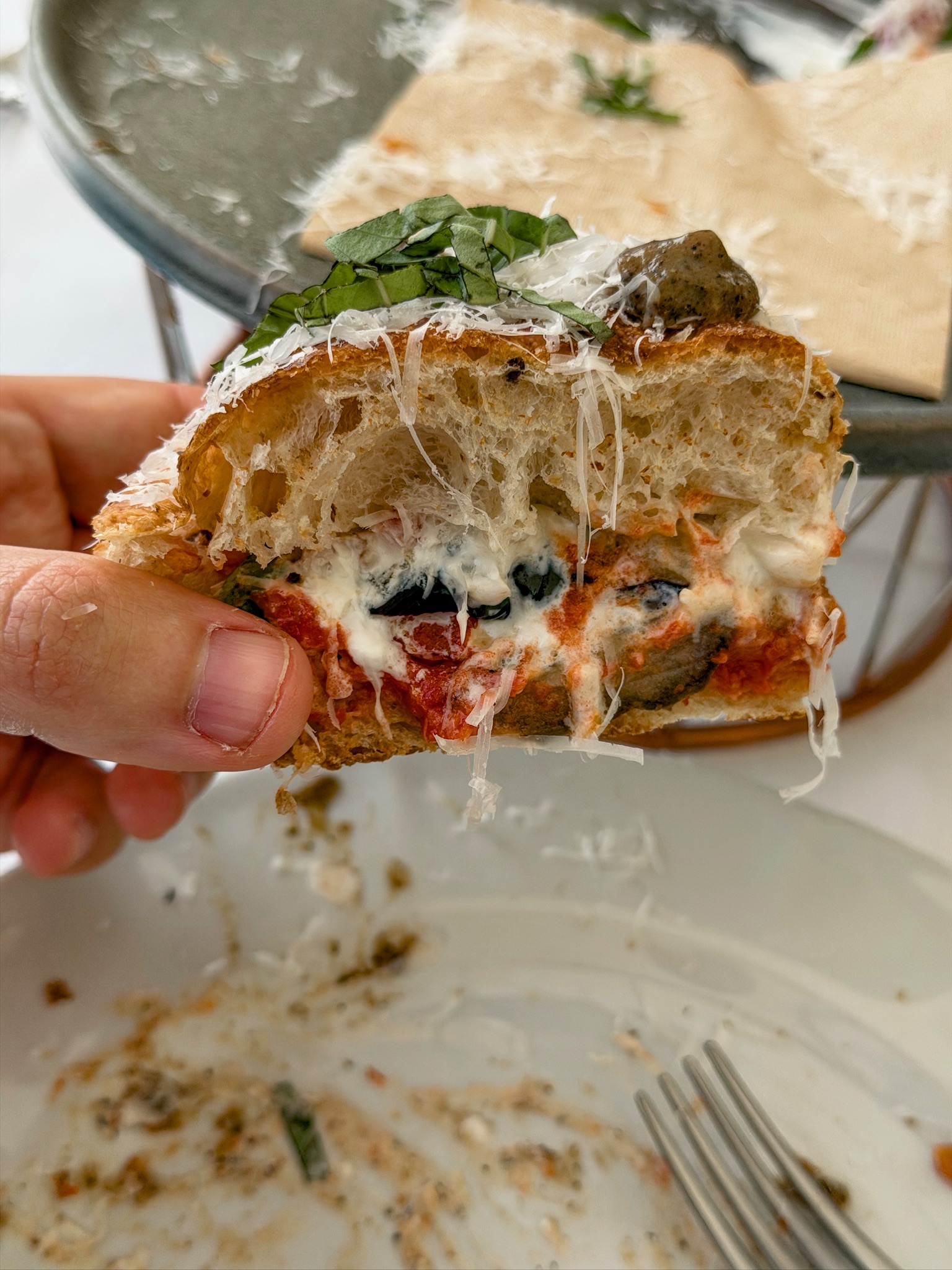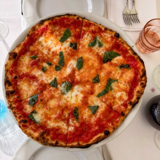 La proposta in menu si articola in pizze classiche tradizionali (con impasto basso e scrocchiarello), pizze croccanti e padellini con impasto soffice. Tra le pizze classiche non può mancare la Margherita fatta con pomodoro pelato bio, fiordilatte, basilico e olio evo; e la Super Marinara fatta con crema di pomodorino ciliegino arrosto, passata di datterino giallo, in uscita pesto sabino di erbe aromatiche (mentuccia, prezzemolo, origano, olio evo) e polvere di olive. Tra le pizze con impasto croccante, degna di nota è la Tridente fatta con impasto croccante, pomodoro pelato biologico, ricotta di bufala, prosciutto crudo di Selci, parmigiano e crema di rucola; tra gli impasto soffici invece, merita una menzione la Sensazione Parmigggiana, padellino ripieno con crema di pomodorini secchi, burrata pugliese, melanzane fritte, carpaccio di pomodoro costoluto, parmigiano 24 mesi, basilico e crema di melanzane. Anche i fritti sono presenti, tra cui il Supplì Tradizionale fatto con riso arborio, ragù rosso con passata di pomodoro biologico, carne di manzo, parmigiano oltre 24 mesi, burro e fiordilatte. Tra i dolci infine, oltre i classici, degno di nota è il Maritozzo Alla Panna, realizzato in casa con lunga lievitazione mista lievito madre e lievito di birra.