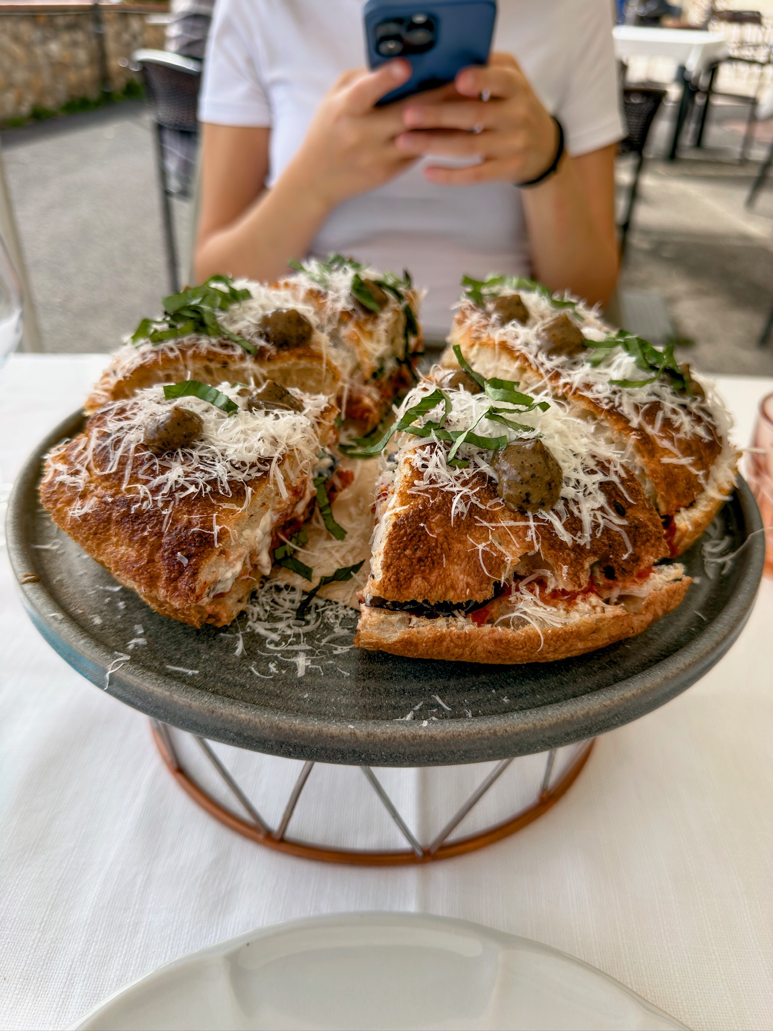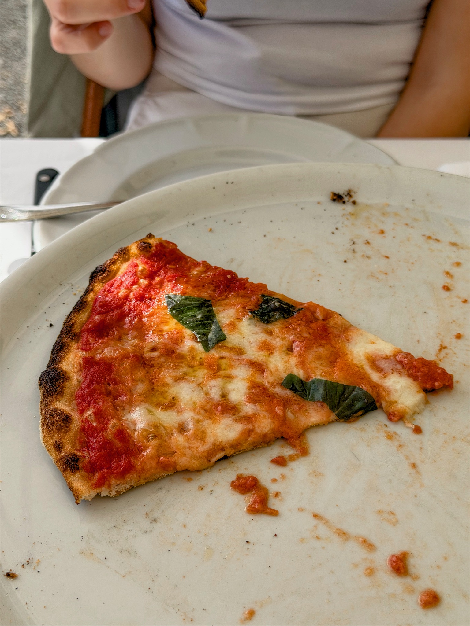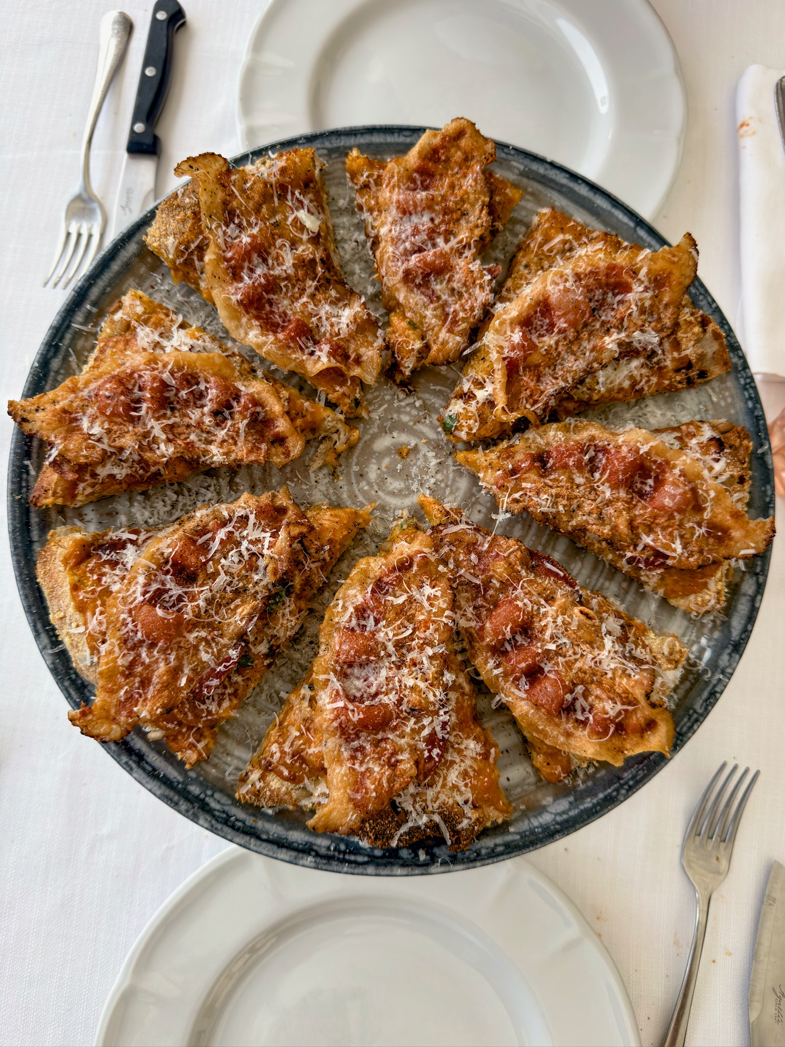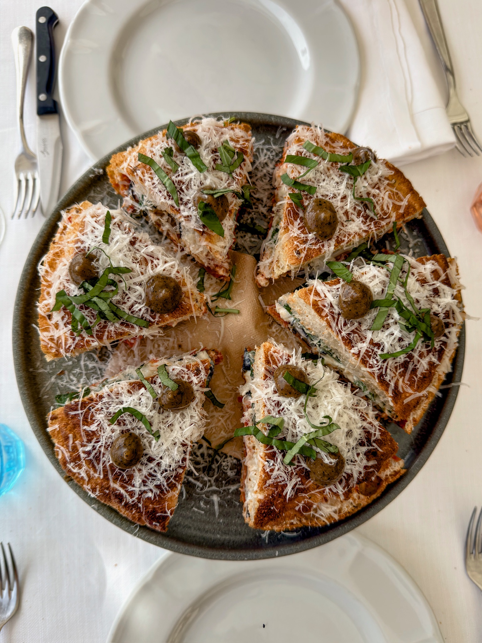 La proposta in menu si articola in pizze classiche tradizionali (con impasto basso e scrocchiarello), pizze croccanti e padellini con impasto soffice. Tra le pizze classiche non può mancare la Margherita fatta con pomodoro pelato bio, fiordilatte, basilico e olio evo; e la Super Marinara fatta con crema di pomodorino ciliegino arrosto, passata di datterino giallo, in uscita pesto sabino di erbe aromatiche (mentuccia, prezzemolo, origano, olio evo) e polvere di olive. Tra le pizze con impasto croccante, degna di nota è la Tridente fatta con impasto croccante, pomodoro pelato biologico, ricotta di bufala, prosciutto crudo di Selci, parmigiano e crema di rucola; tra gli impasto soffici invece, merita una menzione la Sensazione Parmigggiana, padellino ripieno con crema di pomodorini secchi, burrata pugliese, melanzane fritte, carpaccio di pomodoro costoluto, parmigiano 24 mesi, basilico e crema di melanzane. Anche i fritti sono presenti, tra cui il Supplì Tradizionale fatto con riso arborio, ragù rosso con passata di pomodoro biologico, carne di manzo, parmigiano oltre 24 mesi, burro e fiordilatte. Tra i dolci infine, oltre i classici, degno di nota è il Maritozzo Alla Panna, realizzato in casa con lunga lievitazione mista lievito madre e lievito di birra.
