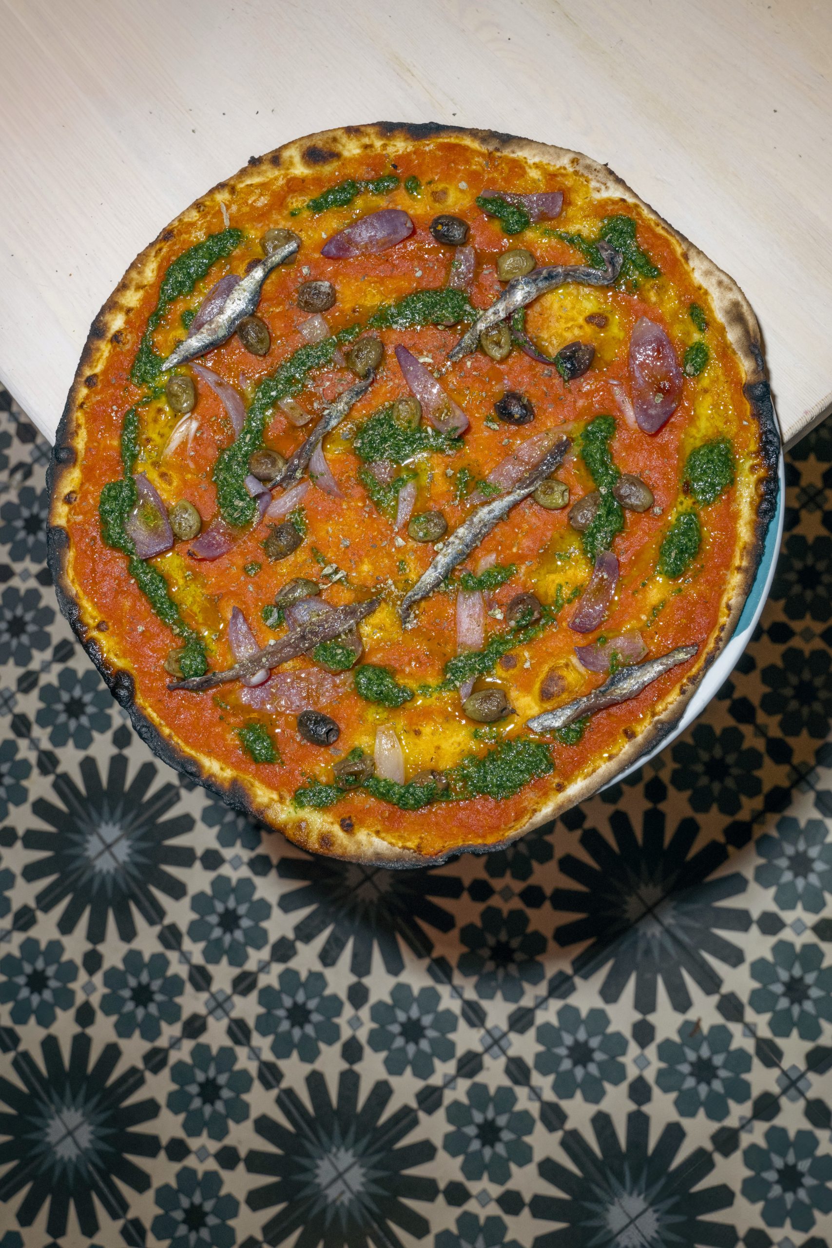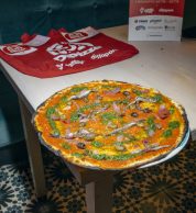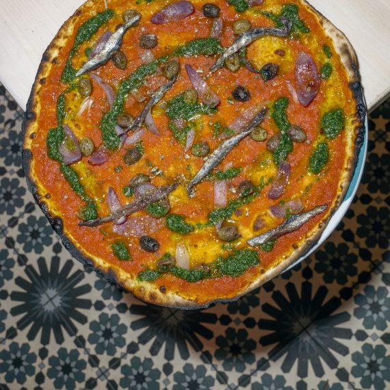 Il locale, in zona Montesacro a Roma, presenta un grande tavolo sociale all’ingresso, 60 sedute interne e circa 30 esterne, un grande bancone e una sala dallo stile minimalista, resa pop dalle colorate scritte a neon. La pizza è il risultato di un impasto lavorato a mattarello, come una volta, mantenendo la tradizione dei forni di Roma, steso finemente e che gode di un’idratazione del 65% e di un’estrema croccantezza, grazie alla miscela di due differenti farine. La proposta in menu offre una selezione di pizze classiche e una delle cosidette pizze Svariate. Alla prima categoria appartengono l’immancabile Margherita classica, la Margherita stracciatella fatta con pomodoro San Marzano, stracciatella di bufala e basilico; e la Capricciosa fatta con pomodoto San Marzano, fiordilatte campano, funghi champignon, carciofo alla brace, uovo sodo, culatello di prosciutto crudo. Nella selezione di Pizze Svariate invece spiccano la Napoli Esagerata fatta con pomodoro San Marzano, foglie di cipolla, olive, filetti di alici, salsa verde con jalapeno e polvere di capperi; e la Libanese fatta con Hummus di ceci, filetti di baccalà, cipolla caramellata e peperone crusco. Per quanto riguarda la proposta alcolica, oltre ai numerosi drinks è presente anche una selezione di bollicine e vini.
