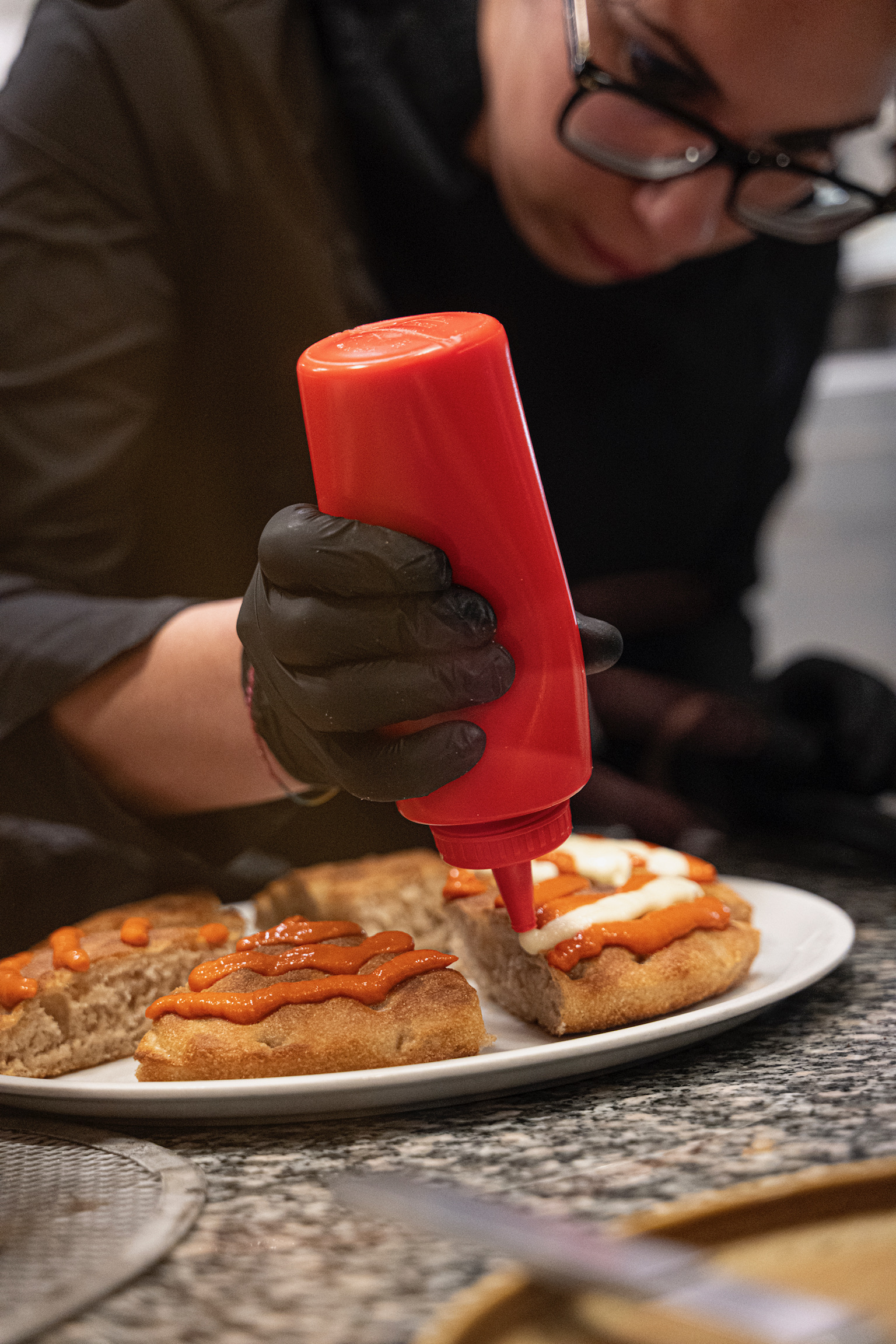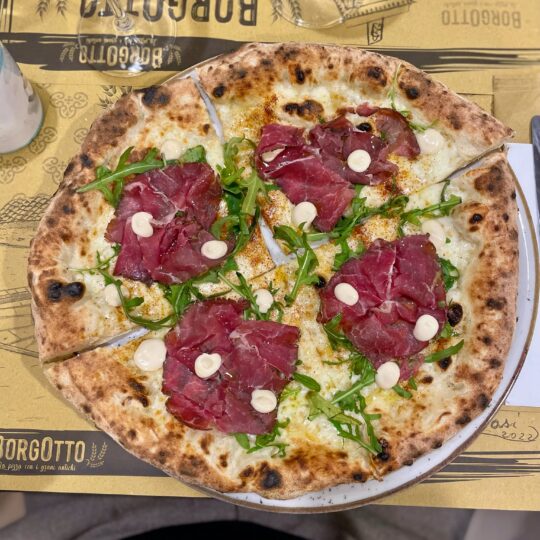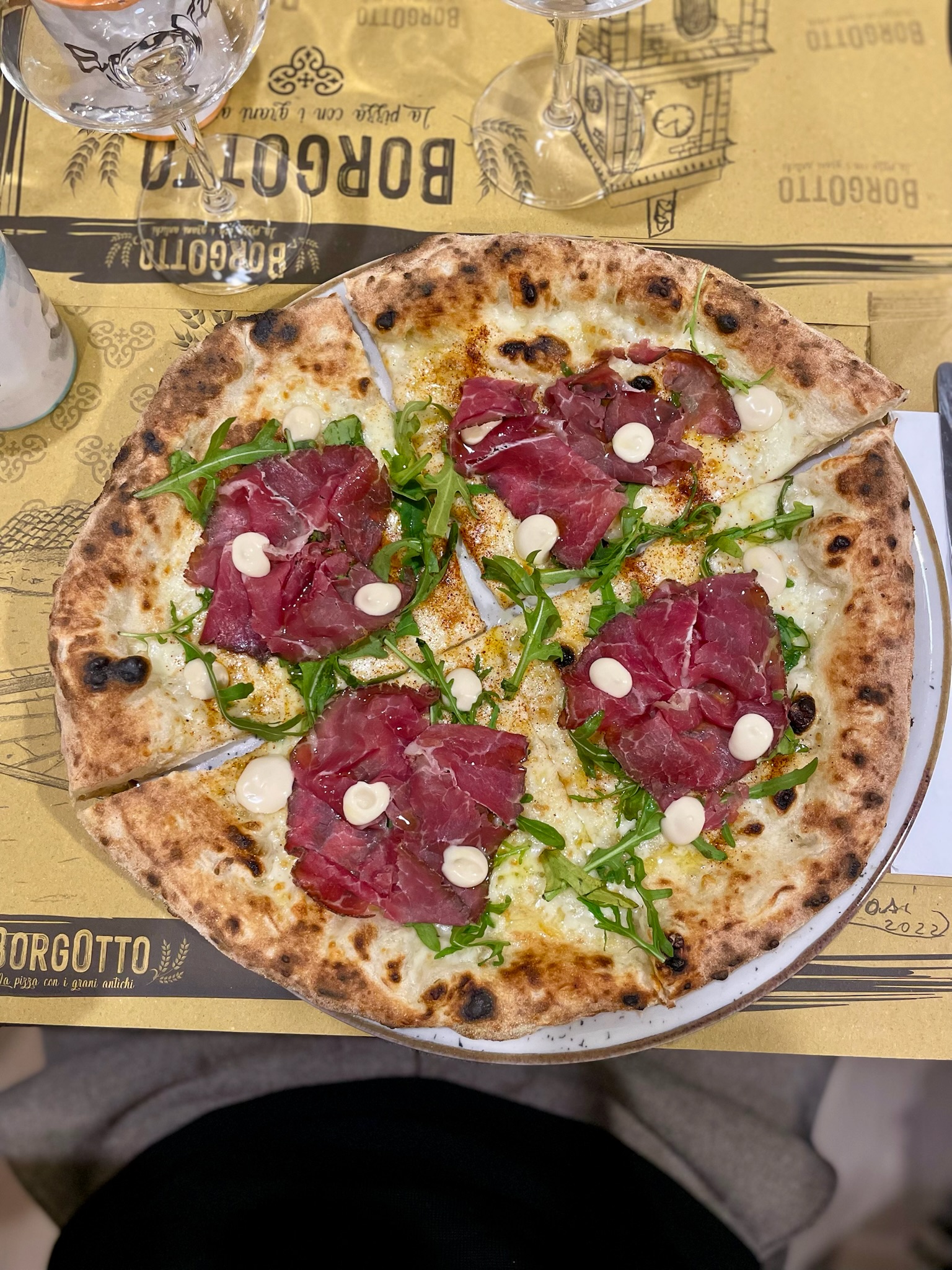 Il menu si articola in varie sezioni: pane agricolo (piatto povero nato dalla tradizione contadina), pizza tonda, riggiola (croccante fuori e morbida dentro), farruoto e dessert. Tra le opzioni di pane agricolo spicca Pane e Sugo fatto con pomodorini di Gragnano, cacioricotta di capra, basilico, olio evo; seguito da Capra e Fichi fatto con prosciutto crudo di Parma, fico bianco sciroppato con zenzero e fili di peperoncino e formaggio spalmabile. Tra le pizze tonde classiche invece, oltre la Margherita, degna di nota è la Scarpariello fatta con pomodorino, parmigiano reggiano, pomodorino del piennolo del vesuvio, pecorino romano, basilico e olio evo. Altre pizze che meritano una menzione sono: La Sinfonia Dell’Agrodolce fatta con cipolla in agrodolce, pancia magra, provola affumicata, fiordilatte, cipolla crispy, cremoso al pecorino e rosmarino; e l’Eccentrica fatta con pomodoro, fiordilatte, funghi champignon freschi, carciofi di Paestum al naturale, olive caiazzane, prosciutto cotto e olio evo. Il padellino Casa Borgotto, fatto con stracciatella di bufala, alici, piennolo del vesuvio semi dry, fiocchi di pomodoro essiccati, bottarga di tonno e olio evo, spicca tra quelli presenti nella categoria FarrUoto ai Grani Antichi.