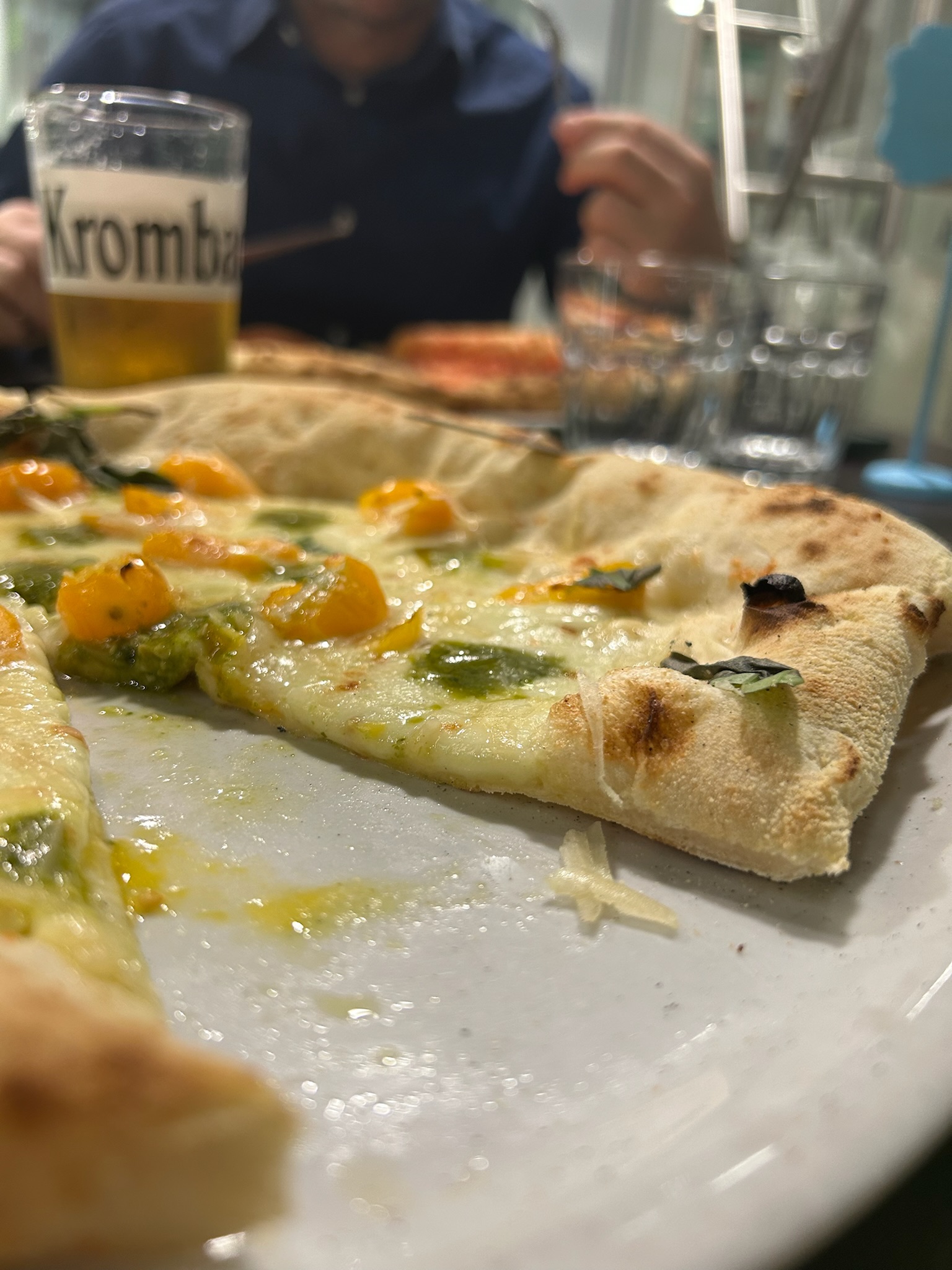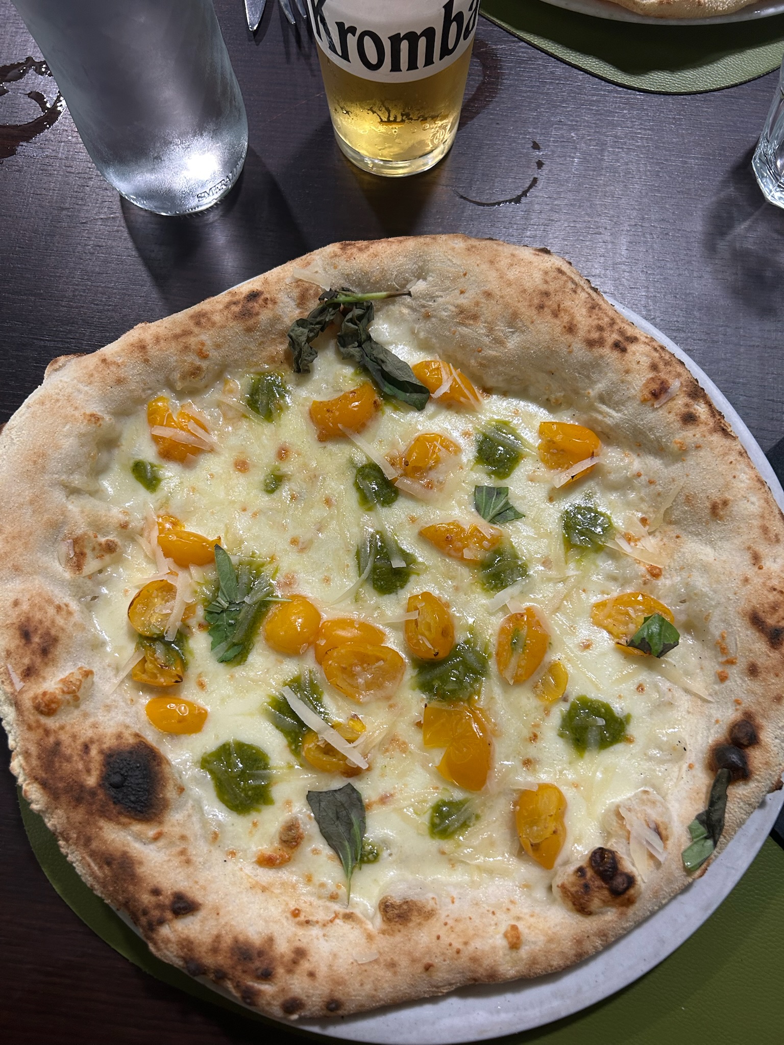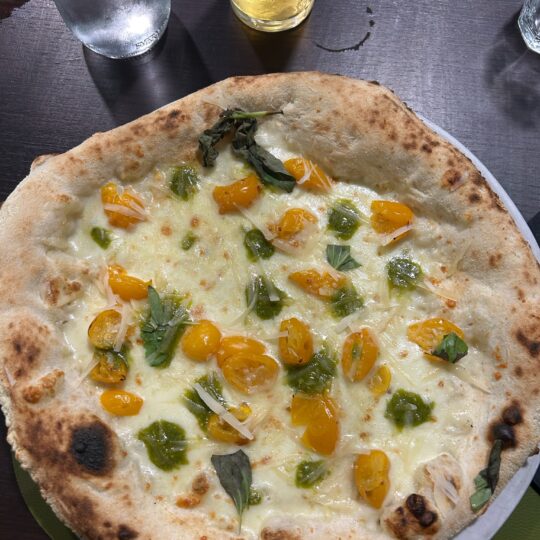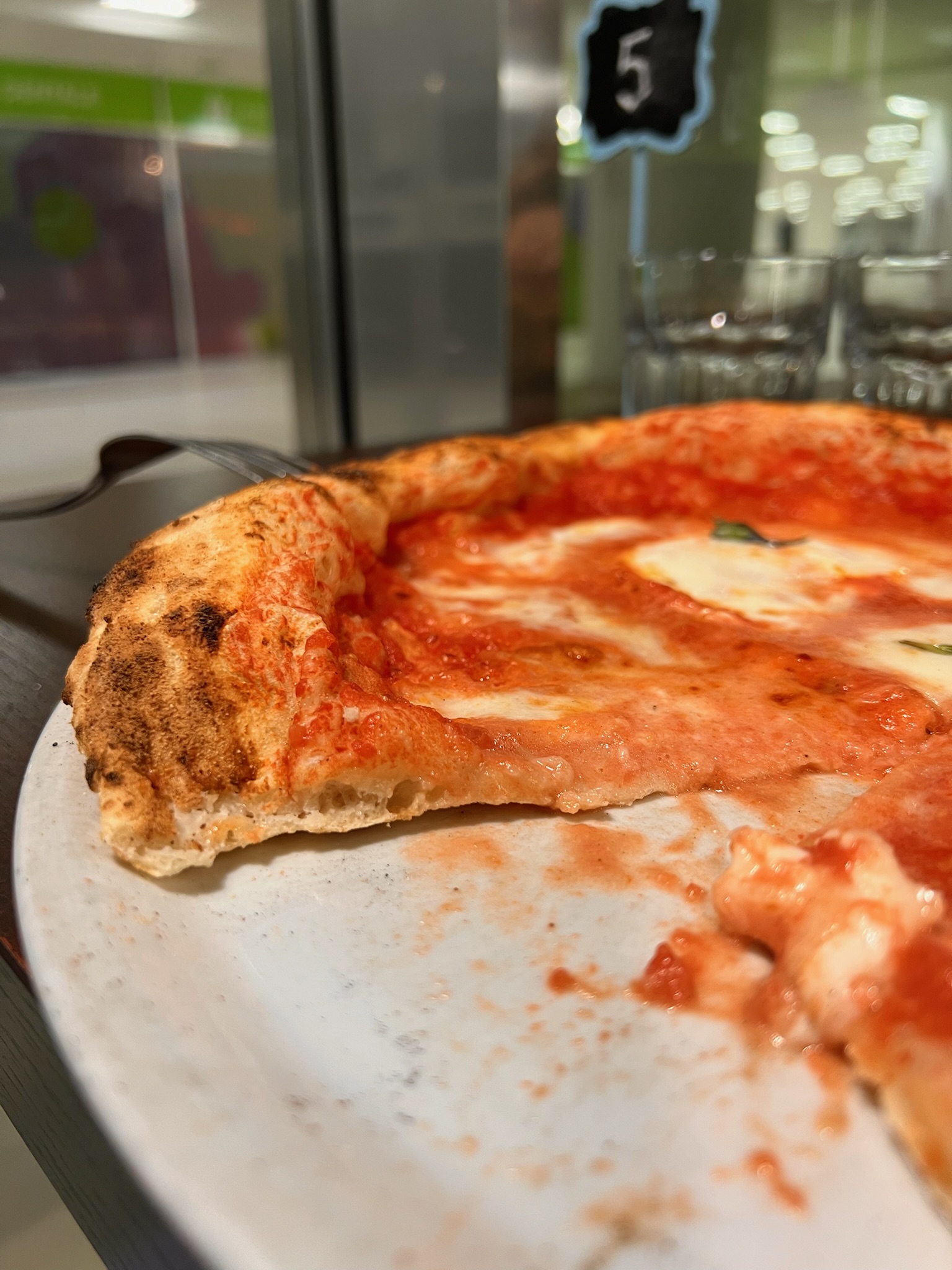 La proposta comprende fritti, piatti composti, taglieri, insalatone e una sezione dedicata interamente alle pizze declinate in varie tipologie: padellino, napoletana contemporanea, a ruota di carro, fritta, pinsa romana e pizza burgers. Tra gli antipasti spicca la Tiella composta da 2 crocchè di patate, 2 frittatine con besciamella, trito di manzo e piselli, 2 montanare, e verdure pastellate. Tra le pizze contemporanee con bordo pronunciato e alveolato, ottenuto da un lungo procedimento di lavorazione e lievitazione di circa 24ore, sono da menzionare: la Regina Del Vesuvio, fatta con conserva di pomodoro del piennolo del vesuvio giallo e rosso, mozzarella di bufala campana dop, scaglie di parmigiano, basilico edolio evo; e la Tonnetta fatta con fiordilatte, filetti di tonno in olio, pomodoro giallo del vesuvio, erba cipollina e olive nere disidratate. Tra le pizze a ruota di carro invece, fatte con impasto diretto, stesura sottile, bordo e diametro ampio, spiccano i grandi classici: dalla Margherita alla Provola e Pepe, seguite dalla Marinara e la Cosacca. Oltre la pizza tonda classica, il menu offre anche una selezione di pizza burgers (panino farcito realizzato con l’impasto della pizza a ruota di carro) tra cui il Piemontese fatto con hamburger di fassona piemontese, iceberg, patate alle tre cotture e mayo artigianale al rosmarino accompagnato con patate chips fresche.