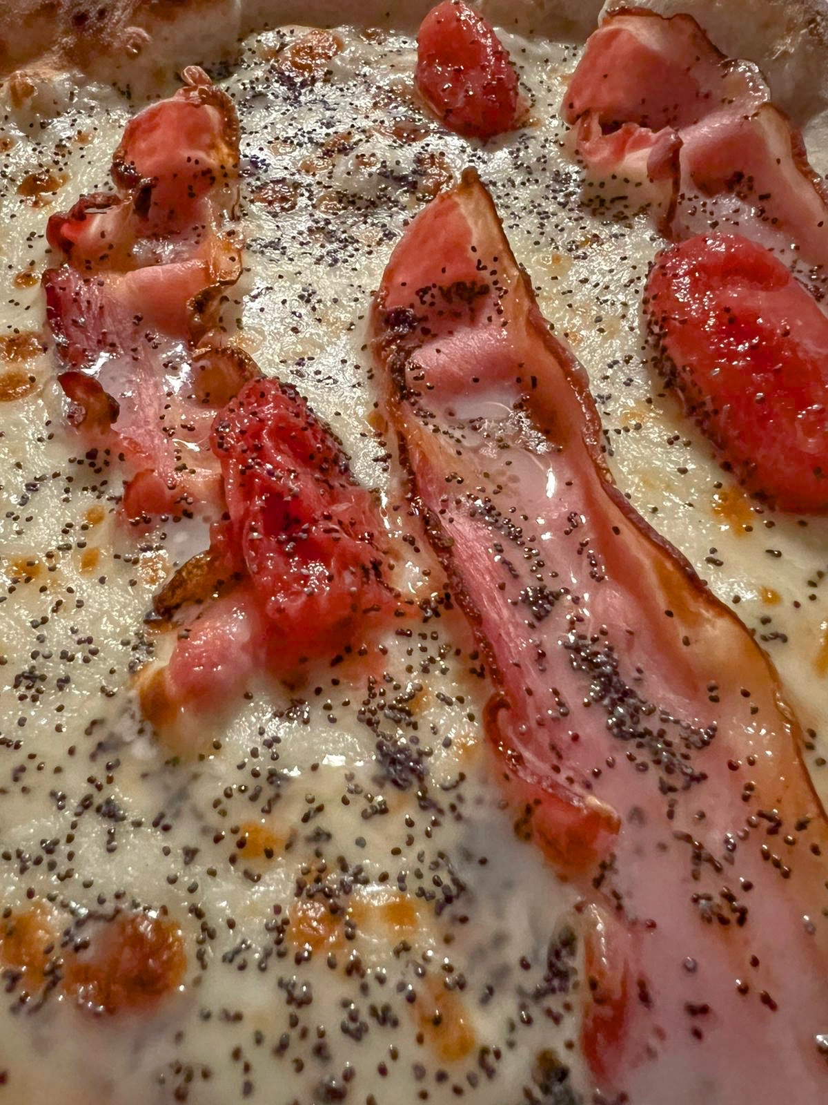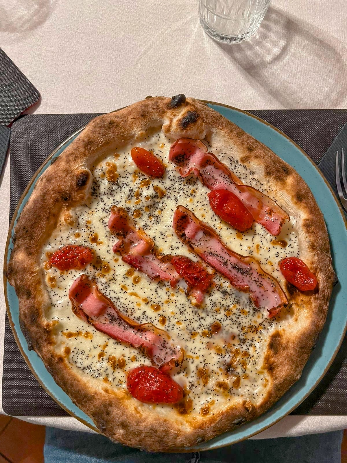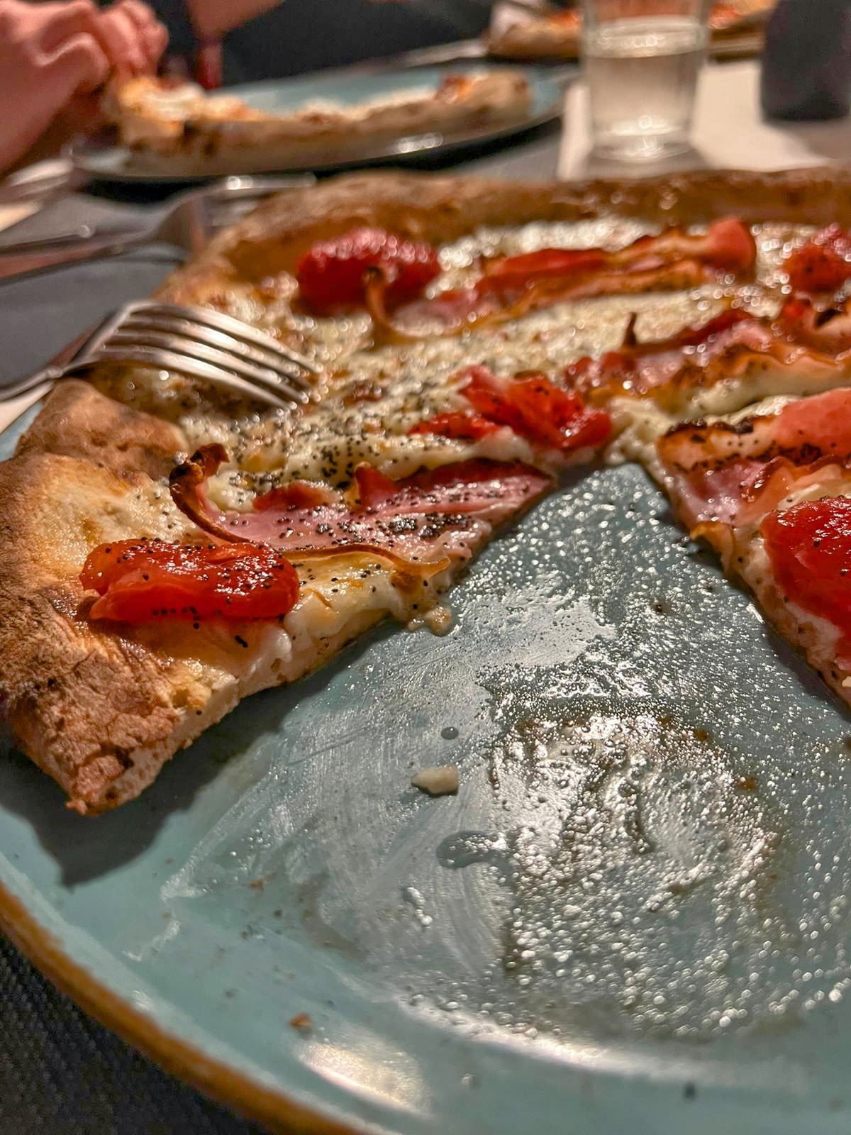 La pizza proposta è caratterizzata da un’impasto diretto con idratazione al 70% circa, una lievitazione che non supera le 24 ore, e da topping realizzati con prodotti stagionali del territorio; il risultato è un cornicione croccante leggermente pronunciato e una pasta che resta compatta e non cede all’umidità della farcitura. Tra le pizze in menu, degna di nota è la Verticale di Margherita, quattro spicchi fatti con un pomodoro diverso ciascuno, abbinato a un differente latticino: pomodoro confit per la mozzarella di bufala, pomodoro giallo con fiordilatte casertano, pomodoro verde per la bufala affumicata, e San Marzano con Grana Padano stagionato 16 mesi; seguita dal Padellino in doppia cottura con pomodoro giallo, capperi di Pantelleria, polvere di olive, olio aromatizzato all’aglio, origano friulano e colatura di alici. Altre pizze interessanti sono la Passione con cornicione ripieno di ricotta vaccina e prosciutto di Praga, fiordilatte, pomodoro confit, grana padano 16 mesi e basilico; e la Apizza con Formadi Frant, miele friulano e noci. Anche la proposta alcolica è presente tra cui una selezione di birre artigianali, la carta dei gin tonic e una carta dei vini con referenze in prevalenza friulane.