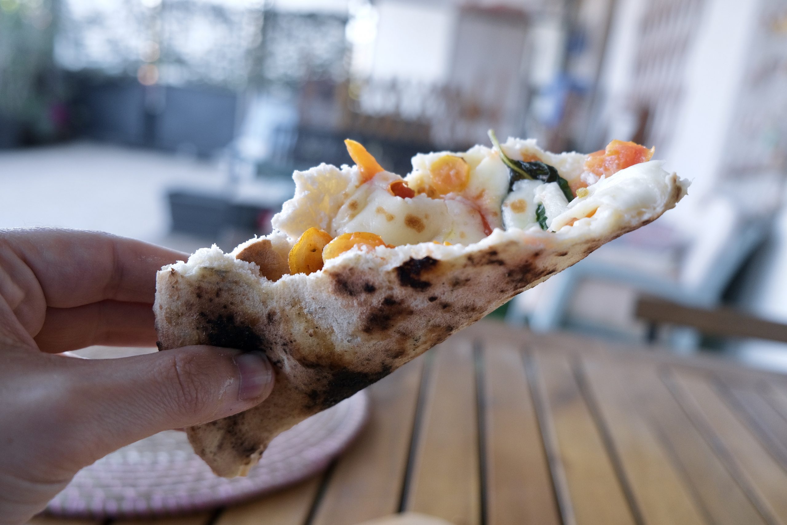 Partiamo dalla Primavera, pizza bianca con pomodorini: cottura standard, costo 7,50€. Un po’ anemica esteticamente, impasto morbido e mediamente scioglievole al morso, il gusto della mozzarella è di un altro livello rispetto a quello accennato delle surgelate, i pomodorini non risultano secchi.