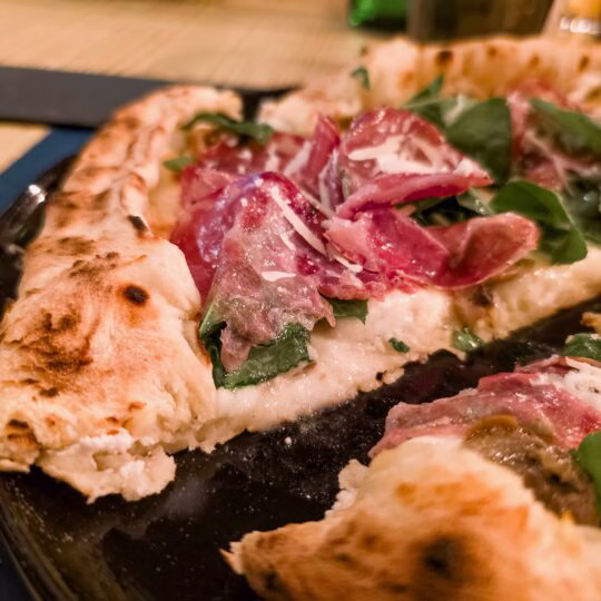 Passando alla pizza, il risultato nel piatto è una pizza leggera e digeribile, con l’inconfondibile cornicione vistoso che aggiunge una nota consistente e croccante al morso. Ogni ingrediente, dall’olio al più semplice degli abbinamenti, ci è parso provenire da una selezione ben curata, magari da Presidi Slow Food, affiancata da eccellenze europee come il Camembert e il Pata Negra. La qualità è percepibile in ogni proposta, dai grandi classici alle sperimentazioni più audaci.