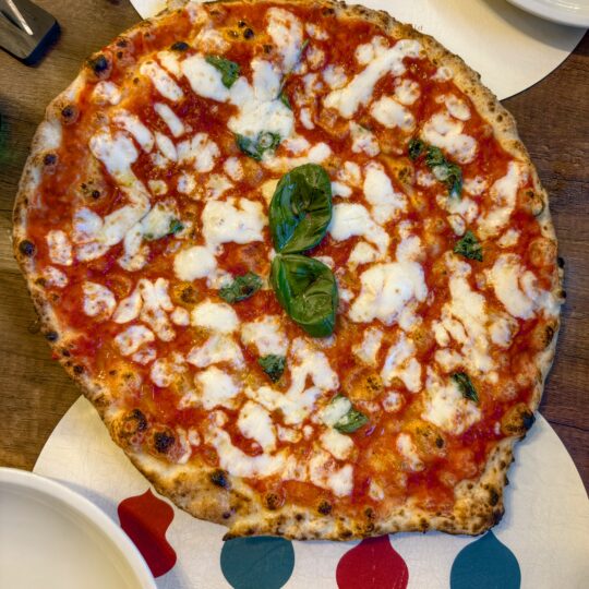 La nostra degustazione è partita con la Margherita Verace (6€), fatta con pomodoro, fiordilatte, parmigiano reggiano 24 mesi e basilico. Il disco di pasta sottile, il cornicione appena accennato e l’impasto scioglievole al morso determinano un esperienza positiva, alla quale si aggiunge anche una buona sapidità degli ingredienti.
