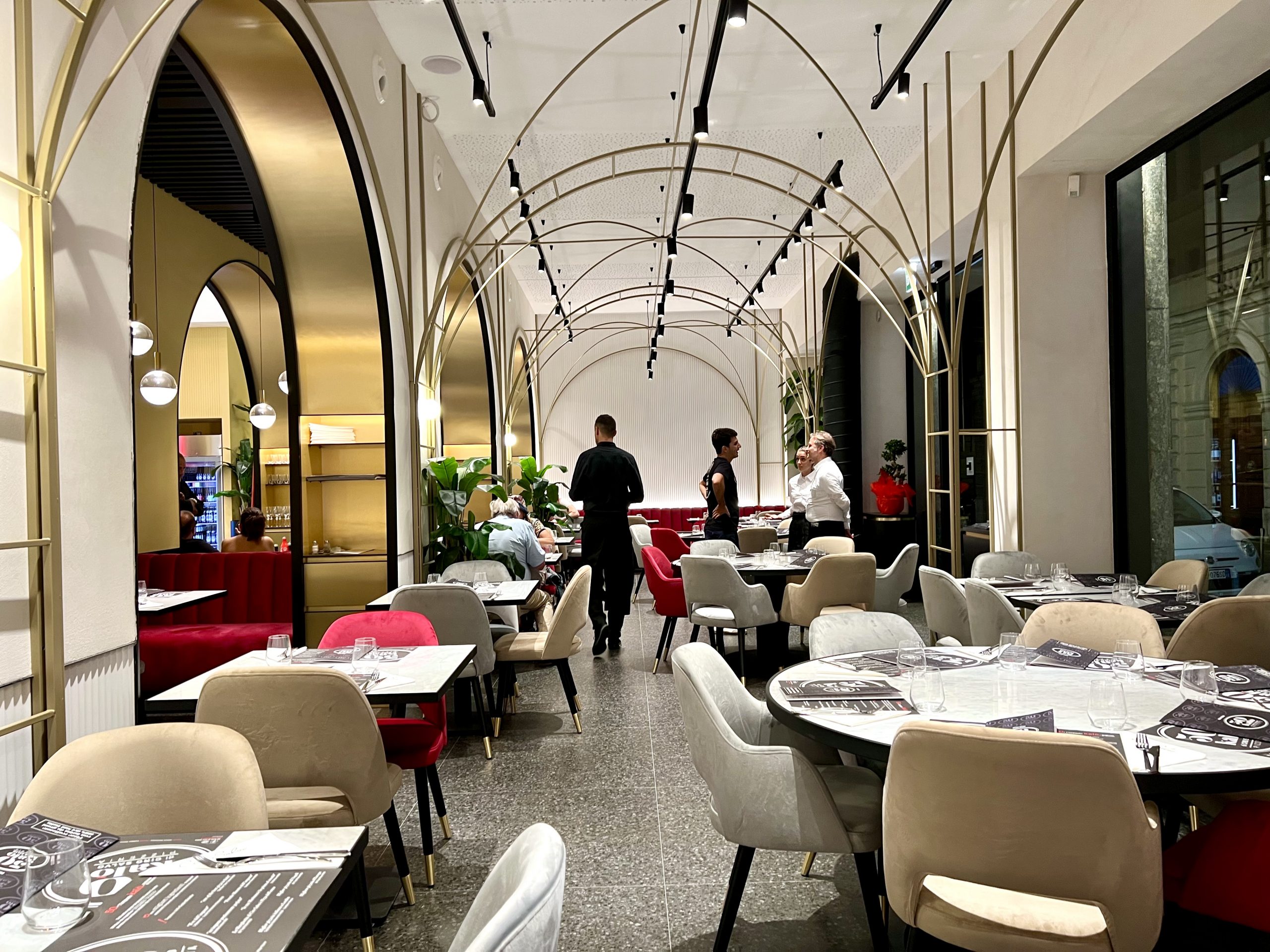 Quattro vetrate indirizzano gli avventori verso una pizzeria elegante senza virtuosismi eccessivi – dislocata su due piani per circa 150 coperti – con due forni pronti a sfornare pizze senza soluzione di continuità.