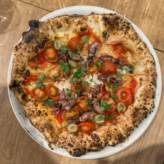 La prima delle due pizze provate è l’immancabile Margherita taglia M, al costo di 1600 yen, circa 10 euro al cambio attuale. La mano nello stendere l’impasto si “vede” tutta, seppur le basi di lavorazione sono comuni a tante pizzerie già provate in Giappone. In questo caso il disco di pasta ha un po’ più di carattere, con una discreta croccantezza al morso prima di sciogliersi nell’affondo. La sapidità complessiva non è piatta e in generale il sapore che rimane in bocca è molto piacevole. La seconda pizza, con i calamaretti, aveva una bella freschezza e acidità accentuate dai pomodorini con a supporto sempre un buon impasto cotto alla perfezione.