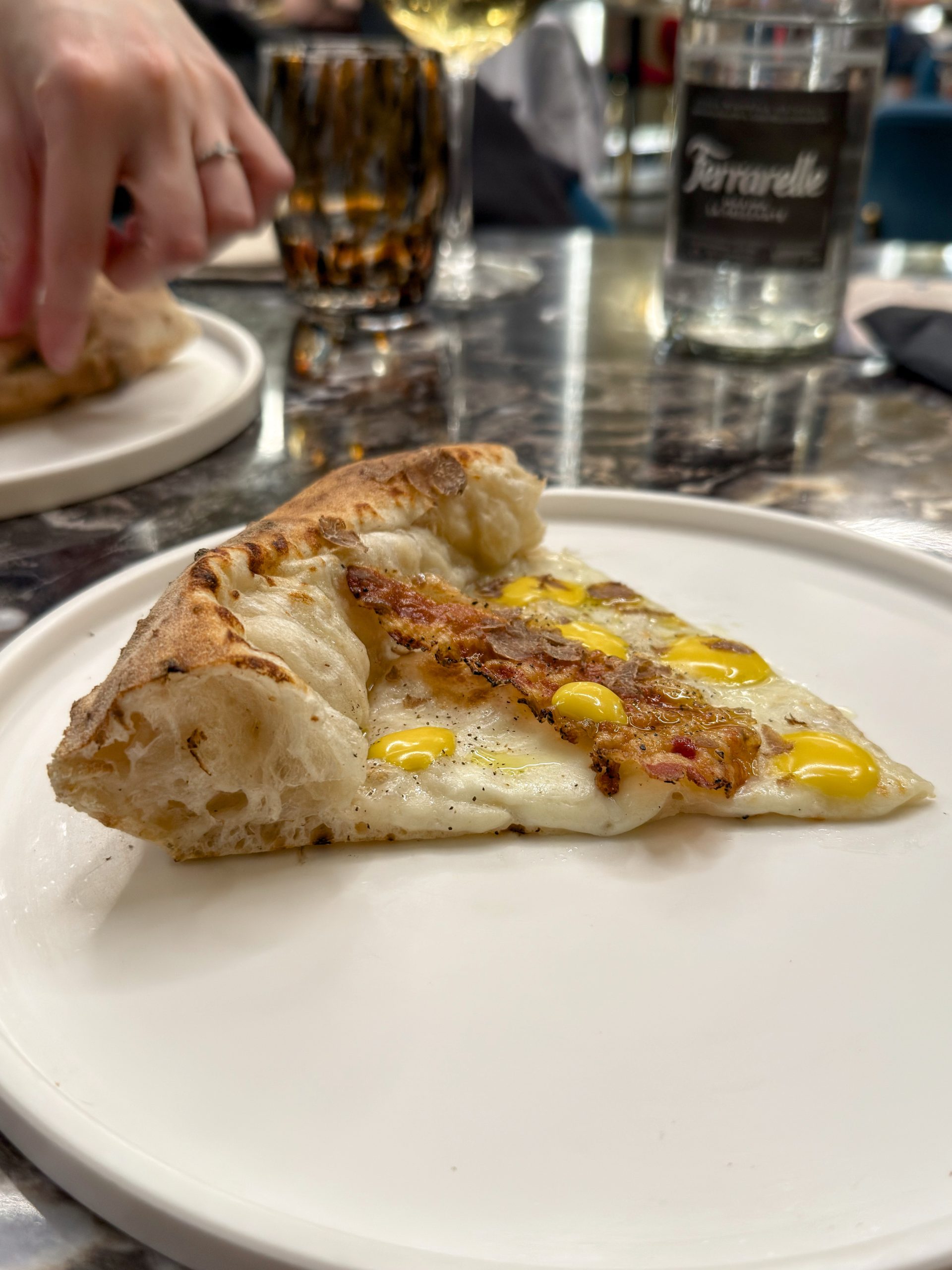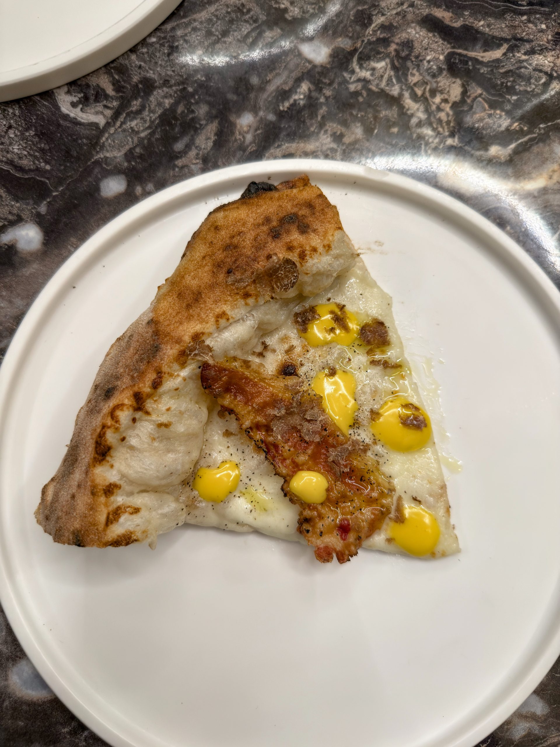 La terza pizza è stata la Carbonara 2.0, realizzata con Fiordilatte di Agerola, Parmigiano Reggiano DOP 24 mesi, crema all’uovo, guanciale croccante, tartufo nero grattugiato, olio extravergine d’oliva.