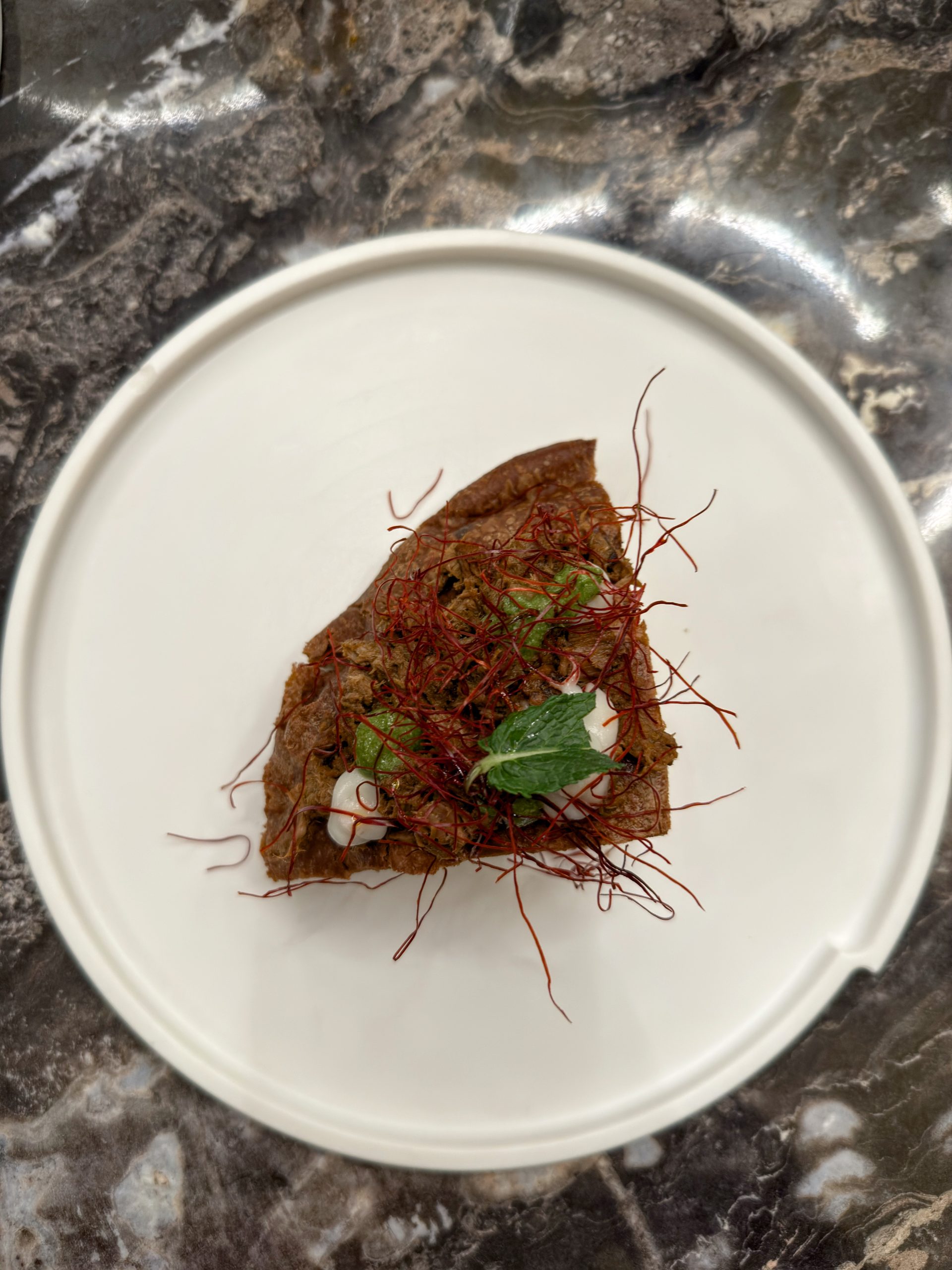 Qui sotto la Bistecca, che ad un costo di 16€ propone una base focaccia, grasso di manzo arrosto, demi-glace, carpaccio di manzo, timo fresco, olio extravergine d’oliva.