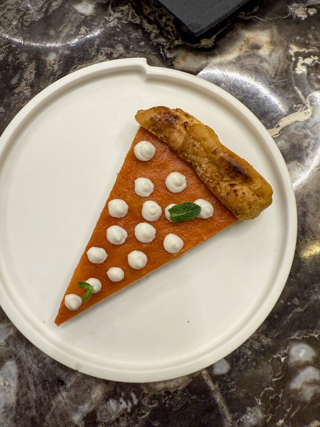 A fare da raccordo tra pizza e dolci c’è stato il padellino al cacao con ragù, crema di bufala e fili di peperoncino.