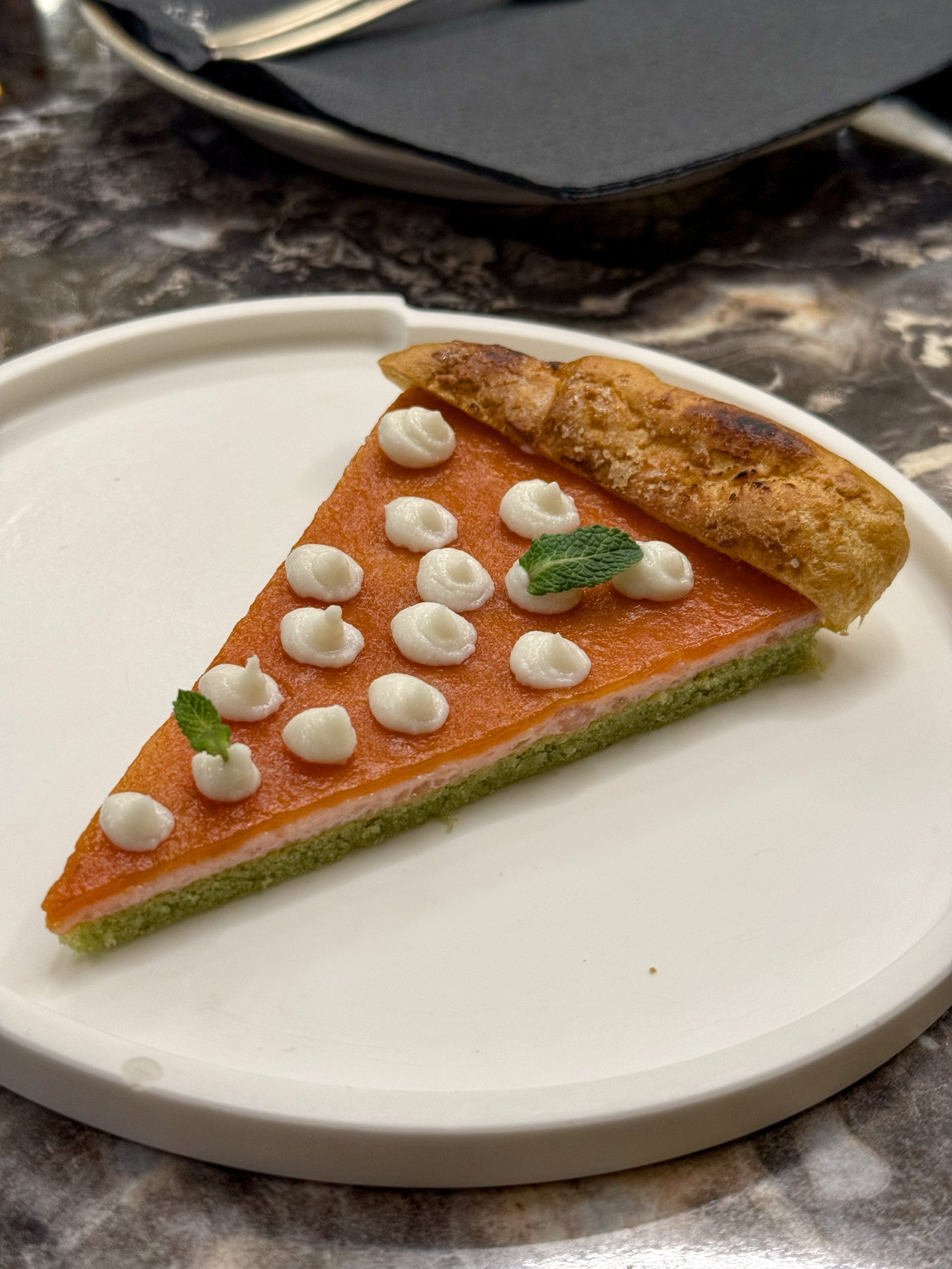 Questo dolce, molto indovinato esteticamente e perfettamente equilibrato nel sapore, è composto da madeleine al basilico con crema di mozzarella di bufala e confettura realizzata con pomodoro datterino e lampone.