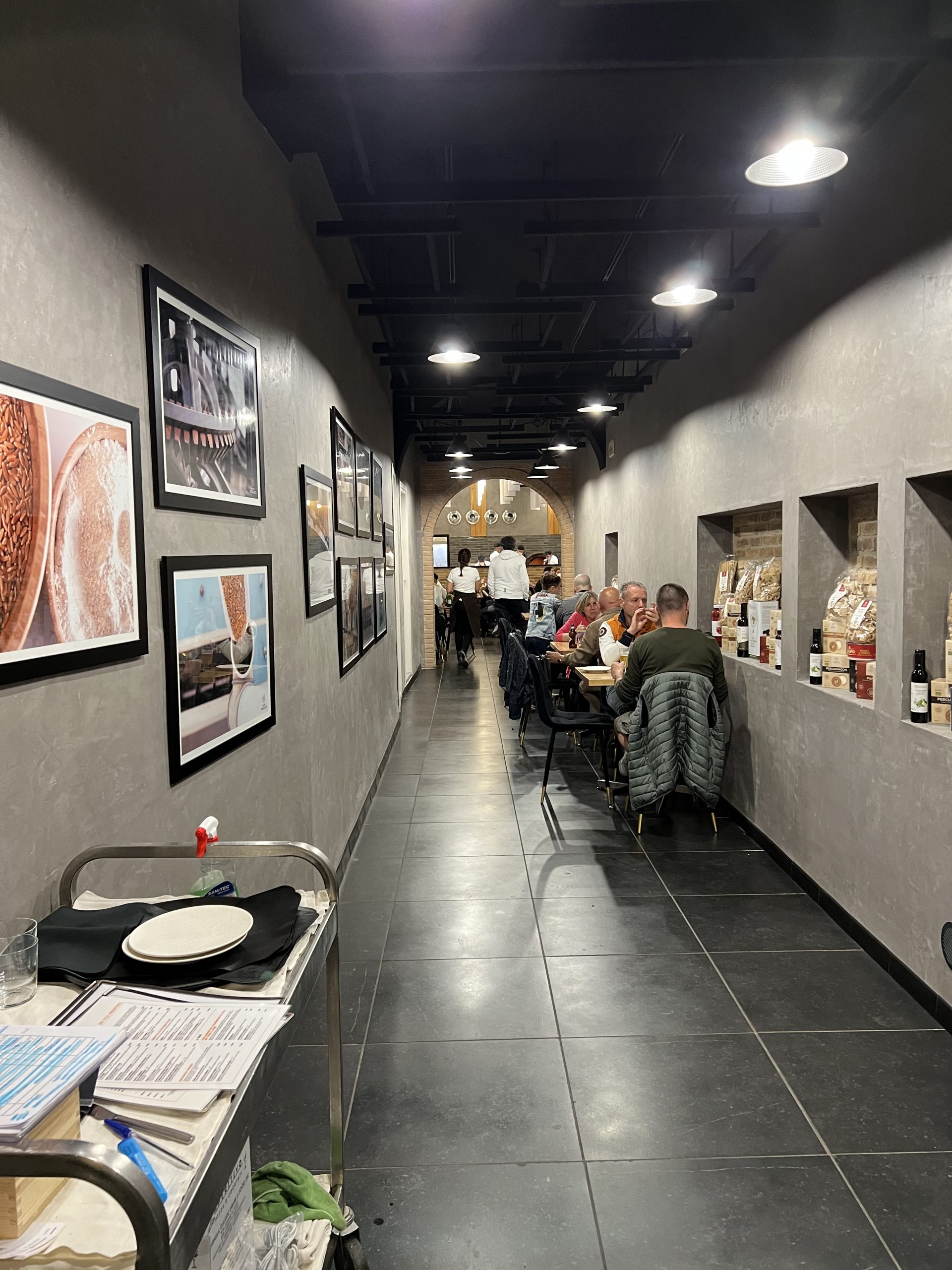 Appena attraversato un corridoio ecco la sala: grande, spaziosa, illuminata da luci che pendono dall’alto soffitto e proprio di fronte al nostro tavolo, separata dal resto, la cucina ed il forno “assediata” da Luca Pezzetta e la sua squadra al completo.