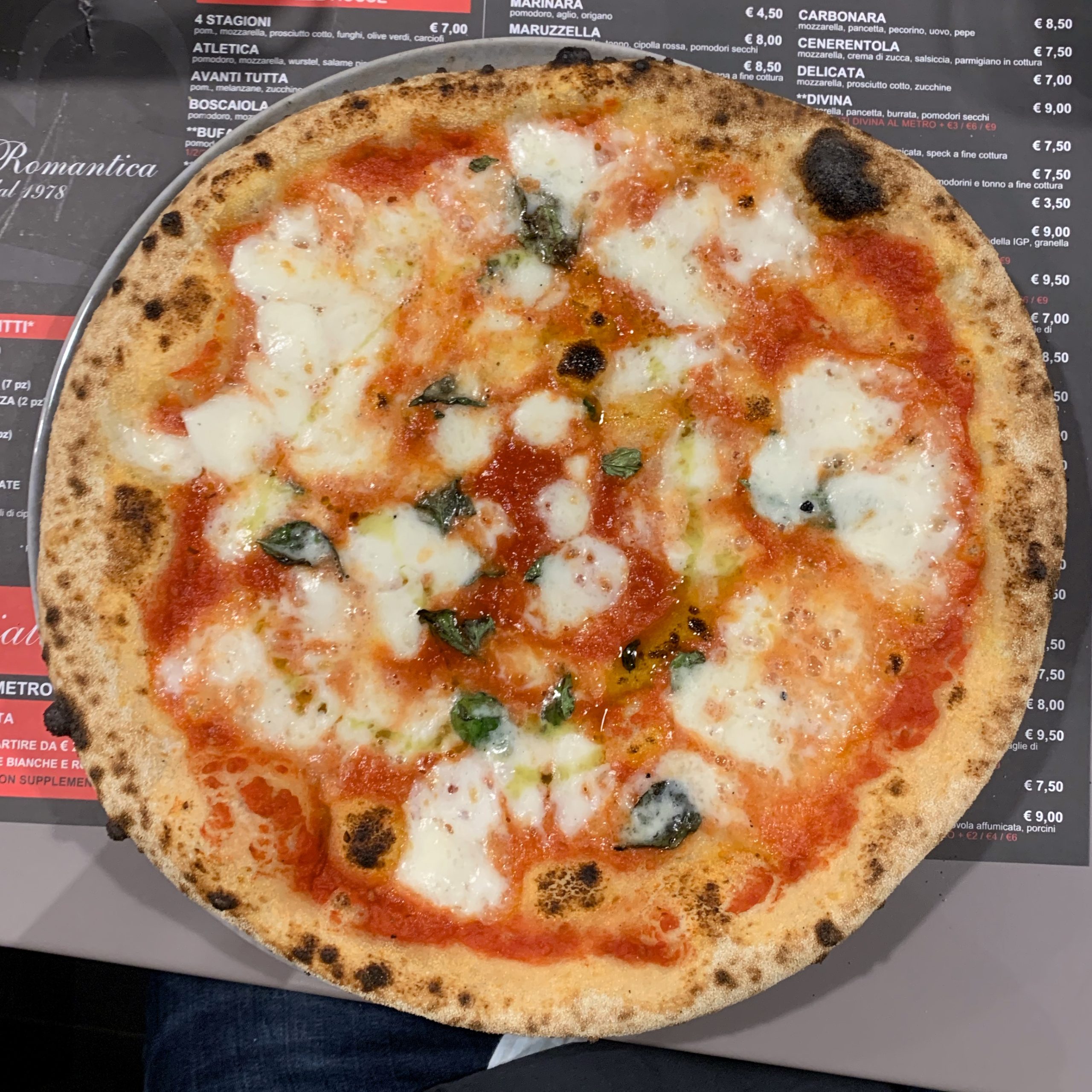 Presente anche nel perugino, La Romantica pone le radici del suo prodotto nel salernitano di qualche anno fa a partire dall’impasto, che fa largo uso di semola nella stesura ed è quindi “ruvido” al tatto e al morso. Proprio l’impasto è forse la cosa più interessante in termini di masticabilità e sapore, insieme ad alcuni abbinamenti provenienti da un menu che propone un numero enorme di pizze ed è molto confusionario. In tutto questo marasma ci sono ovviamente delle buone combinazioni, come detto, ma è quasi come se fossero derivate da una legge dei grandi numeri invece che da un pensiero alle spalle; insomma, tocca indovinare le pizze giuste per mangiare una buona pizza. Il locale è grande, un po’ freddo e non particolarmente ispirato, la parte alcolica c’è, senza gridare al miracolo.