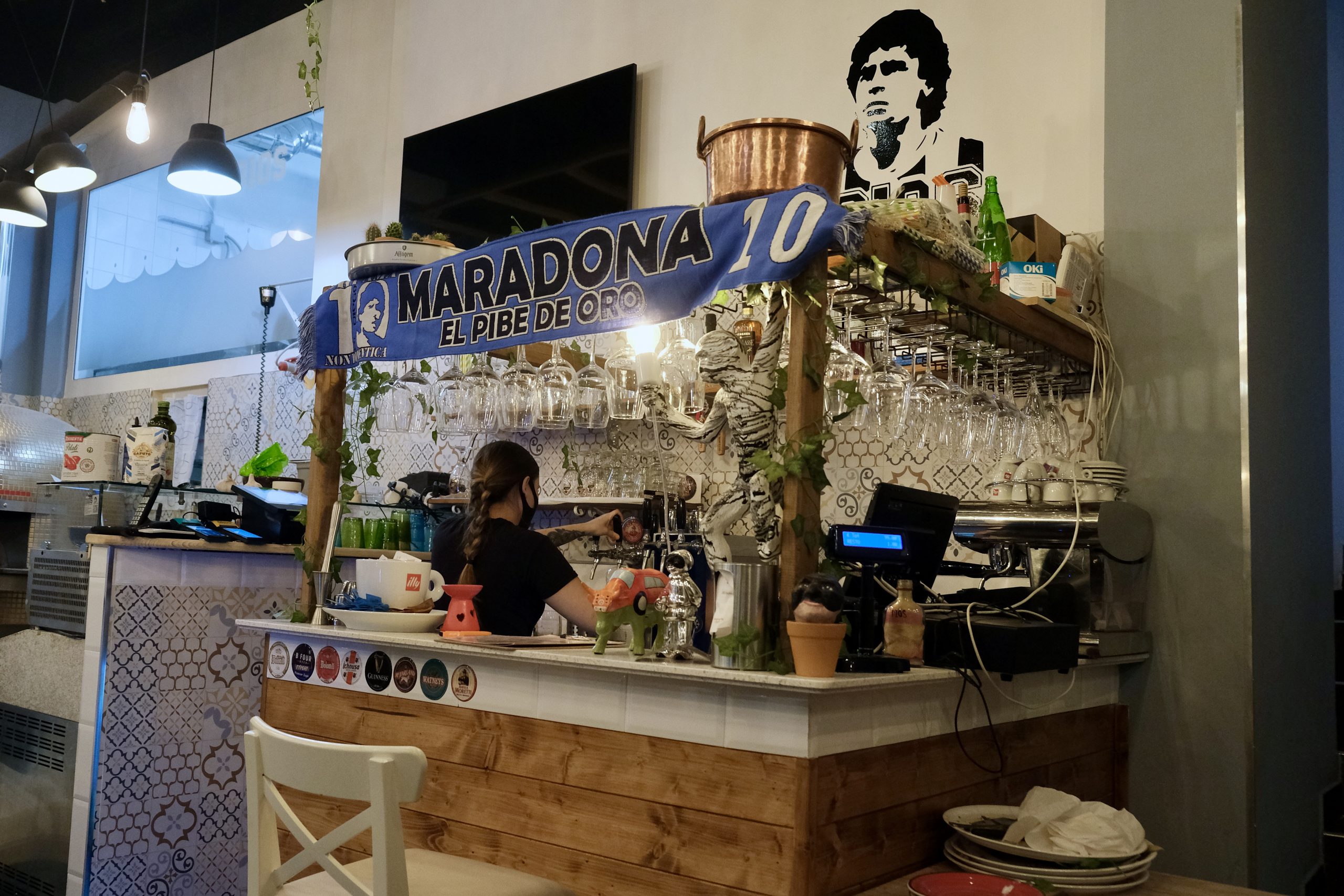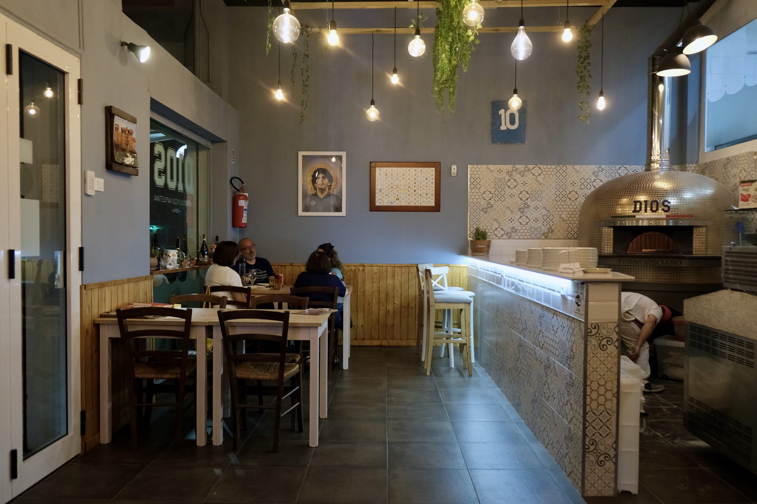 La scritta D10S si affaccia sul dehors all’ingresso, all’interno le pareti color celeste e le luci restituiscono un’atmosfera a tema assieme ad alcuni quadri e sciarpe di Diego Armando Maradona, fino al forno a gas personalizzato. Nulla di eccessivo o “preponderante”, ma in ogni angolo è indubbiamente chiaro il tributo al fuoriclasse argentino.