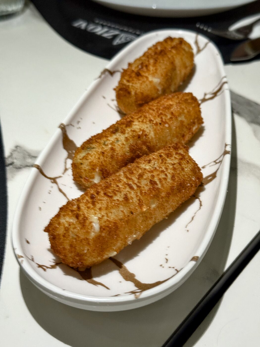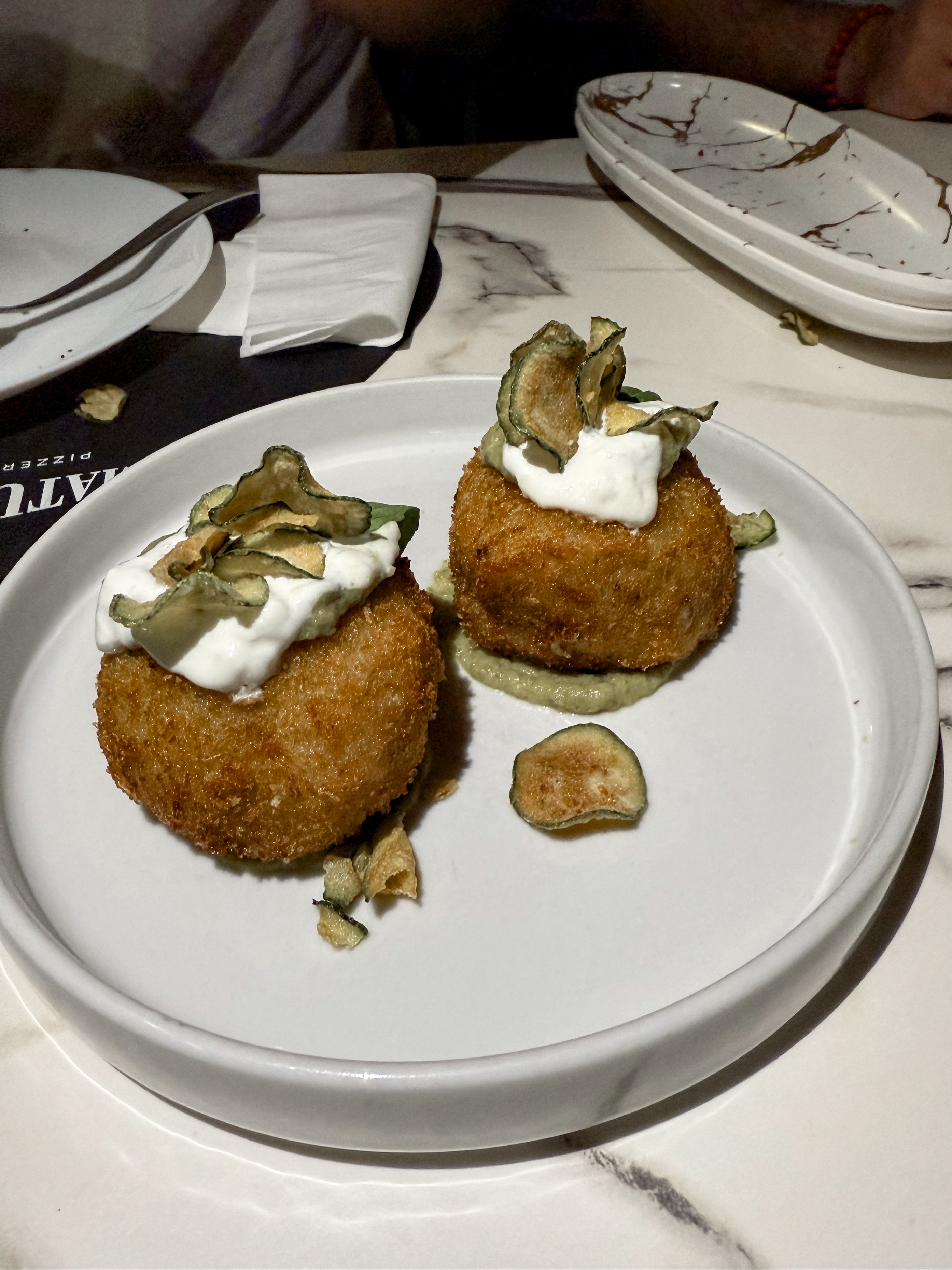 Iniziamo la cena, ovviamente, con un assaggio di fritti. In particolare un crocchè di patate che ho trovato sfizioso per via della sua panatura molto croccante; e due frittatine di pasta differenti, che invece non mi hanno soddisfatto per via del loro sapore un po’ blando e per la loro composizione troppo “impastata”.